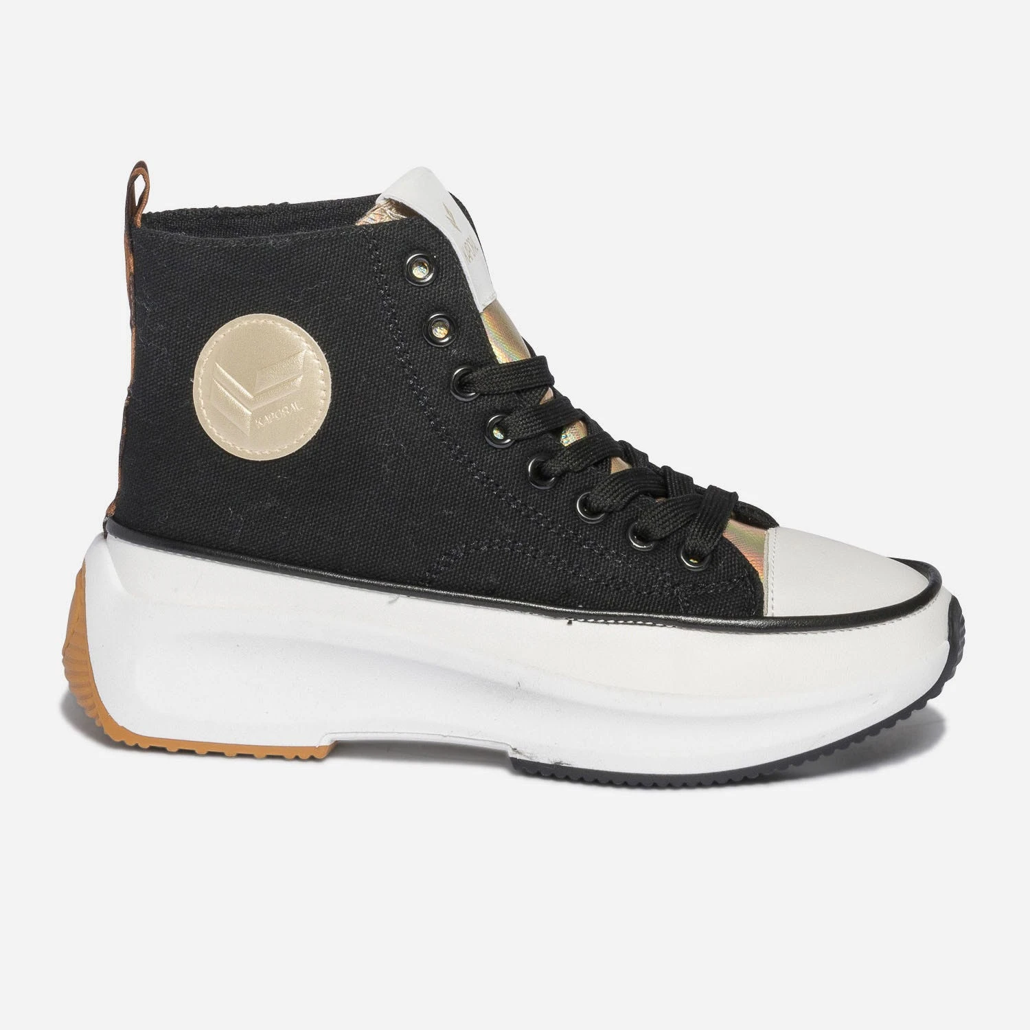 Entrez dans la saison estivale avec cette basket montante pour femme. En toile noire, elle affirme son style mode par une languette iridescente et un galon à imprimé léopard. Elle est livrée avec 2 paires de lacets plats, 1 noir et 1 rose fluo. Montée sur une semelle à plateforme, elle permet de prendre de la hauteur sans effort. Un modèle à porter avec une tenue colorée à l’esprit décontracté : crop top, pantalon large et casquette.