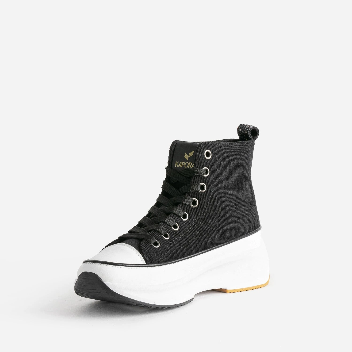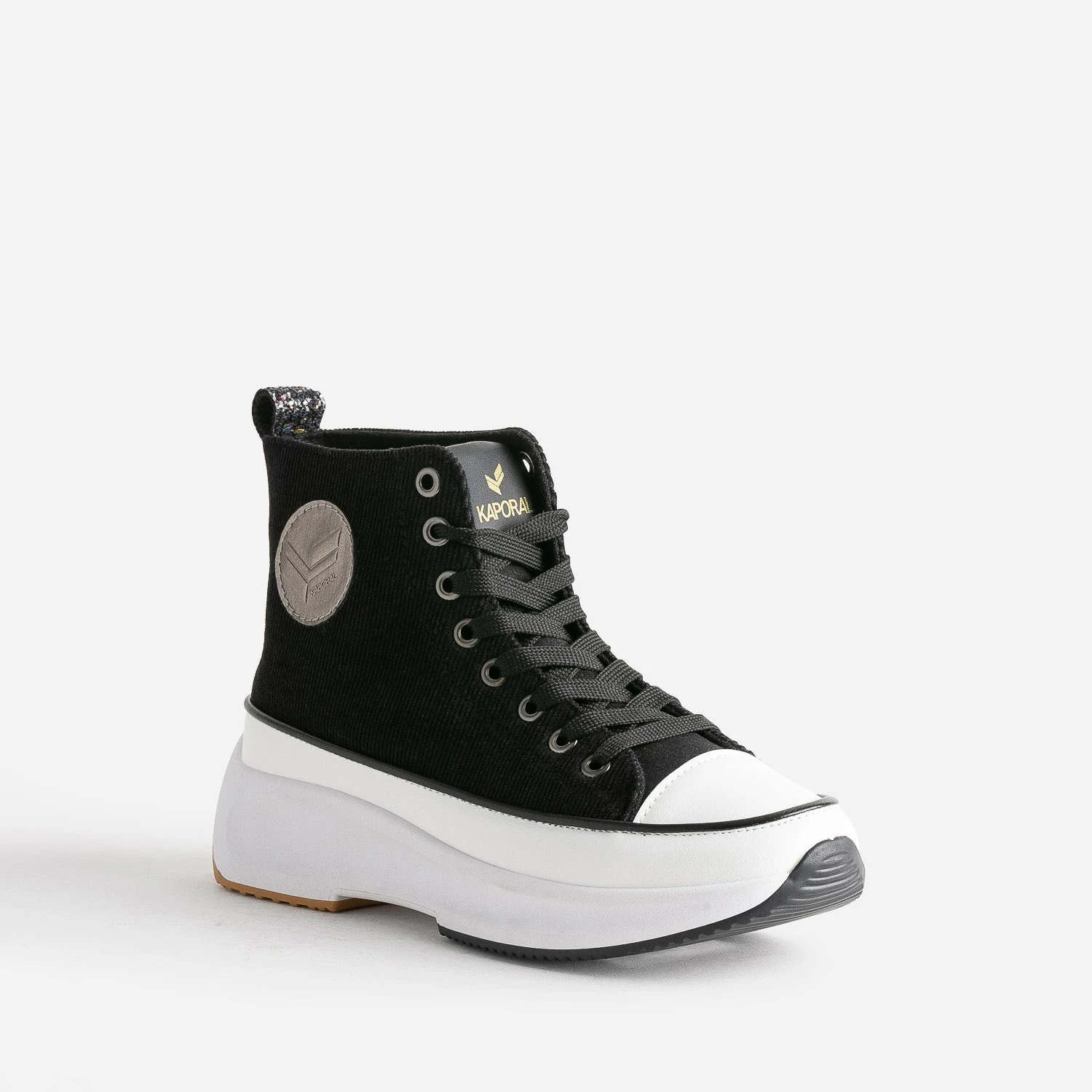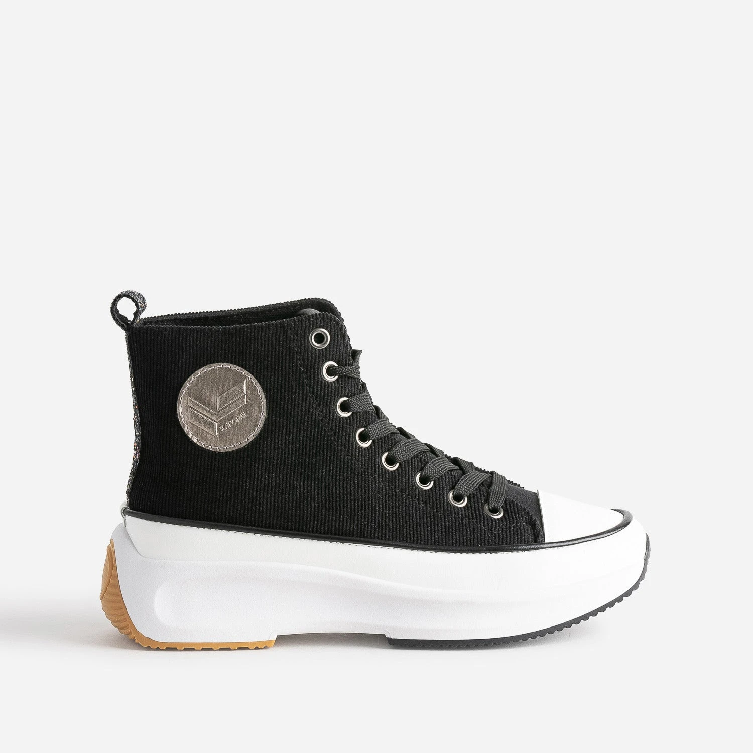 Entrez dans la saison hivernale avec cette basket montante pour femme. En velours noir côtelé, elle affirme son style mode par une languette irisée et un galon pailleté. Montée sur une semelle à plateforme, elle permet de prendre de la hauteur sans effort. Un modèle à porter avec une tenue à l’esprit décontracté : crop top, pantalon large et casquette.