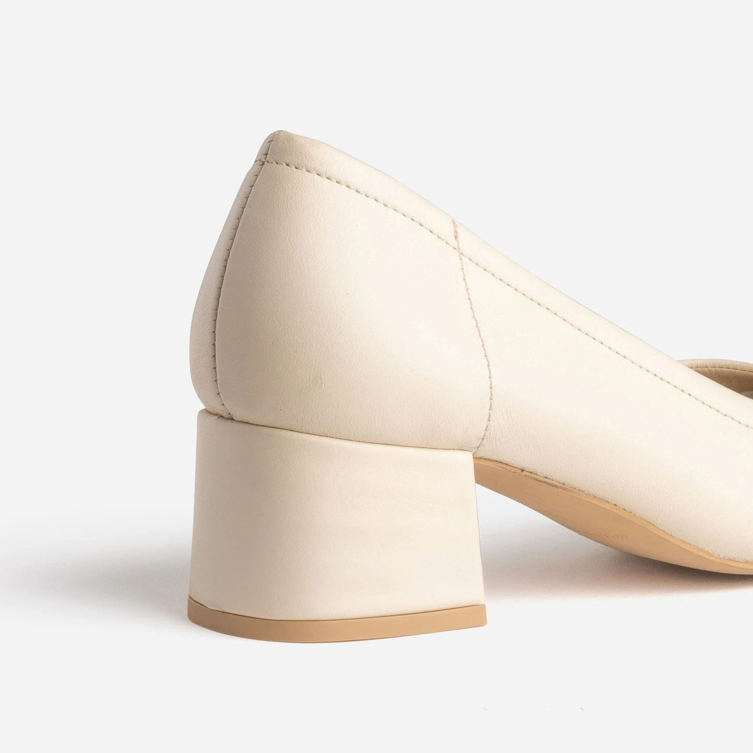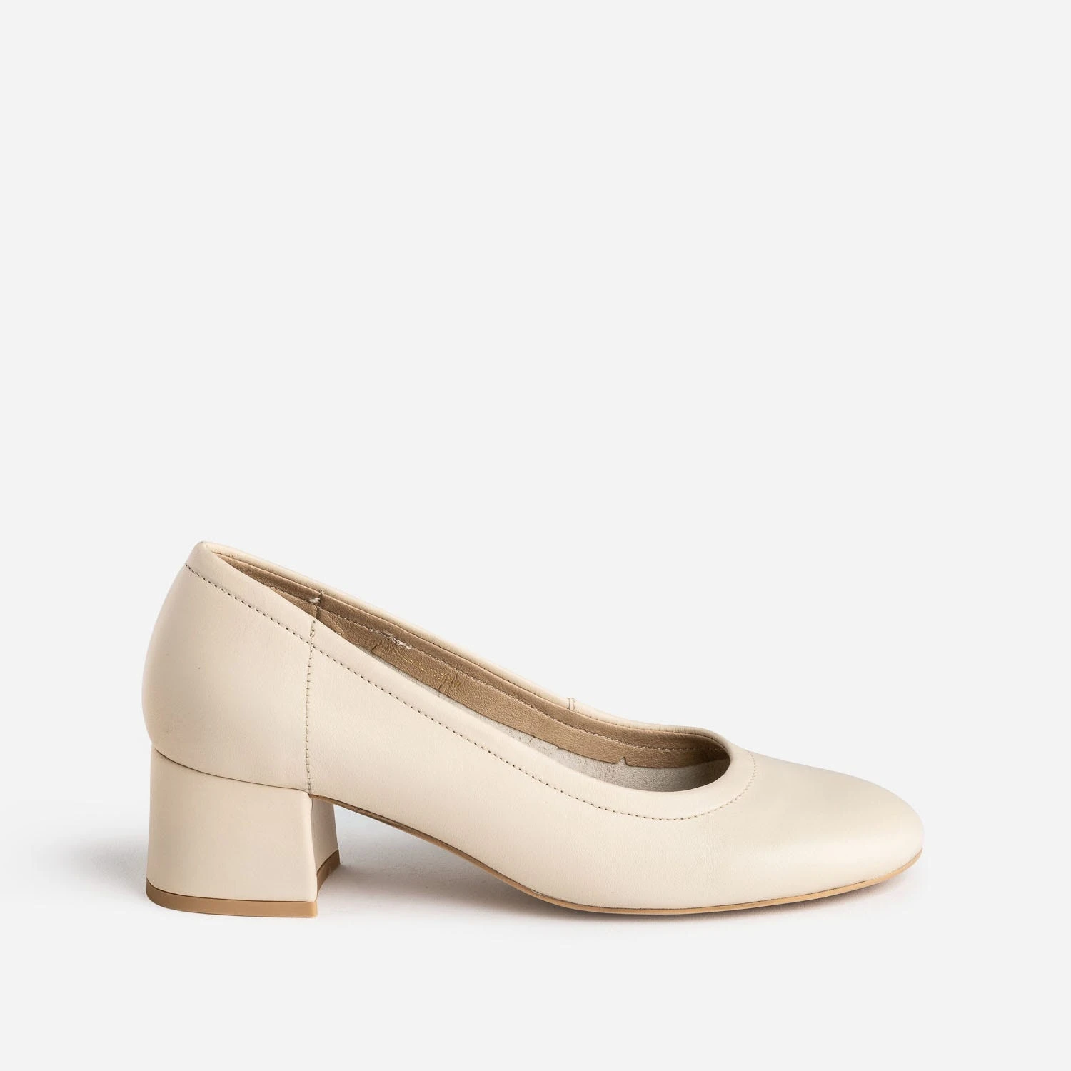 Inspiré par la ballerine, cet escarpin femme lui emprunte sa rondeur et son style minimaliste. En cuir beige clair, il est monté sur un talon carré de 4,5 cm. Portez-le avec un look classique, costume-pantalon ou jupe midi. Décalez-le avec un look plus osé, sweat pastel et jean mom 7/8ème.