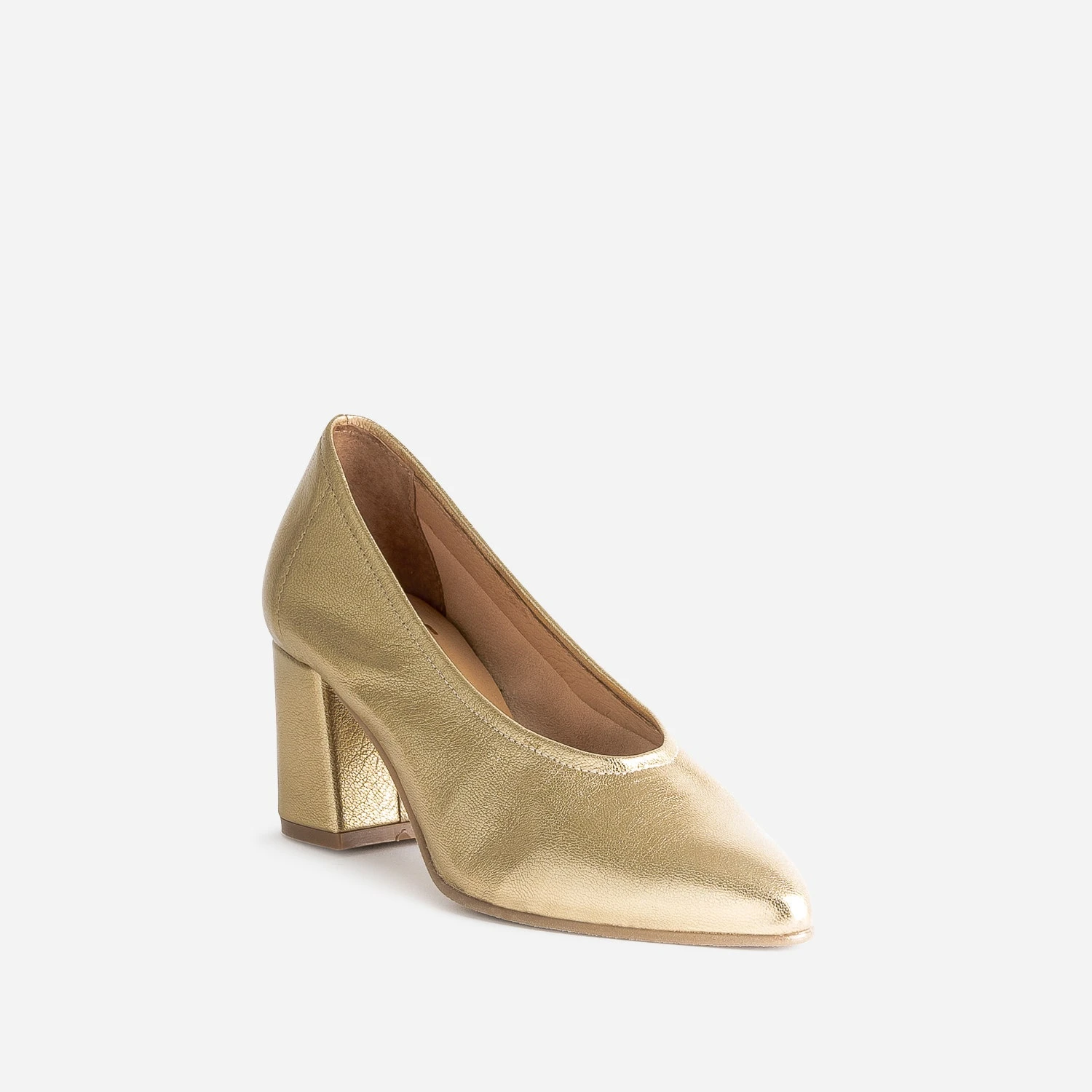 Esprit rétro affiché avec ce nouvel escarpin pour femme au design si singulier. En cuir doré, il se différencie par un talon flare, un bout pointu et surtout, un décolleté couvrant. Un modèle très souple, à tester avec un look rock, baroque ou carrément street.