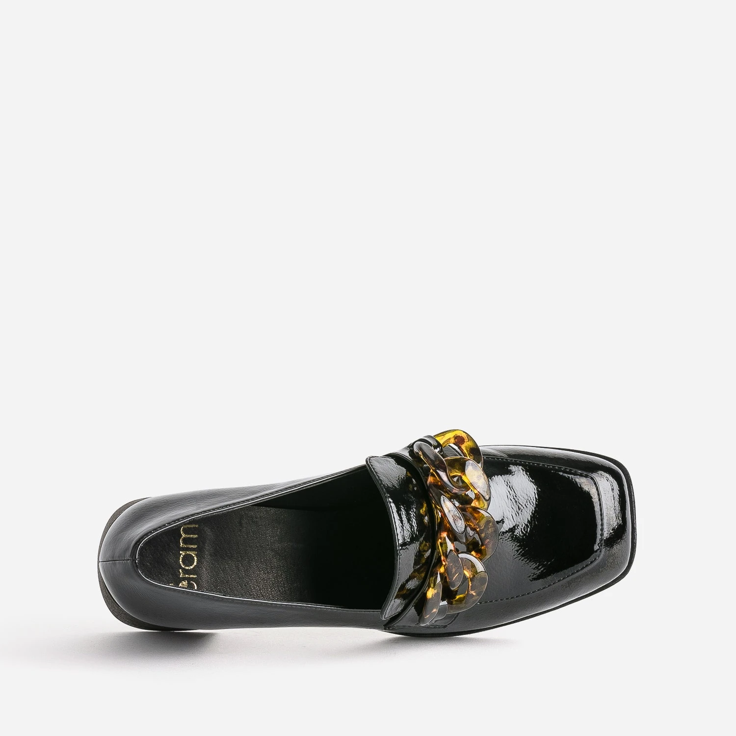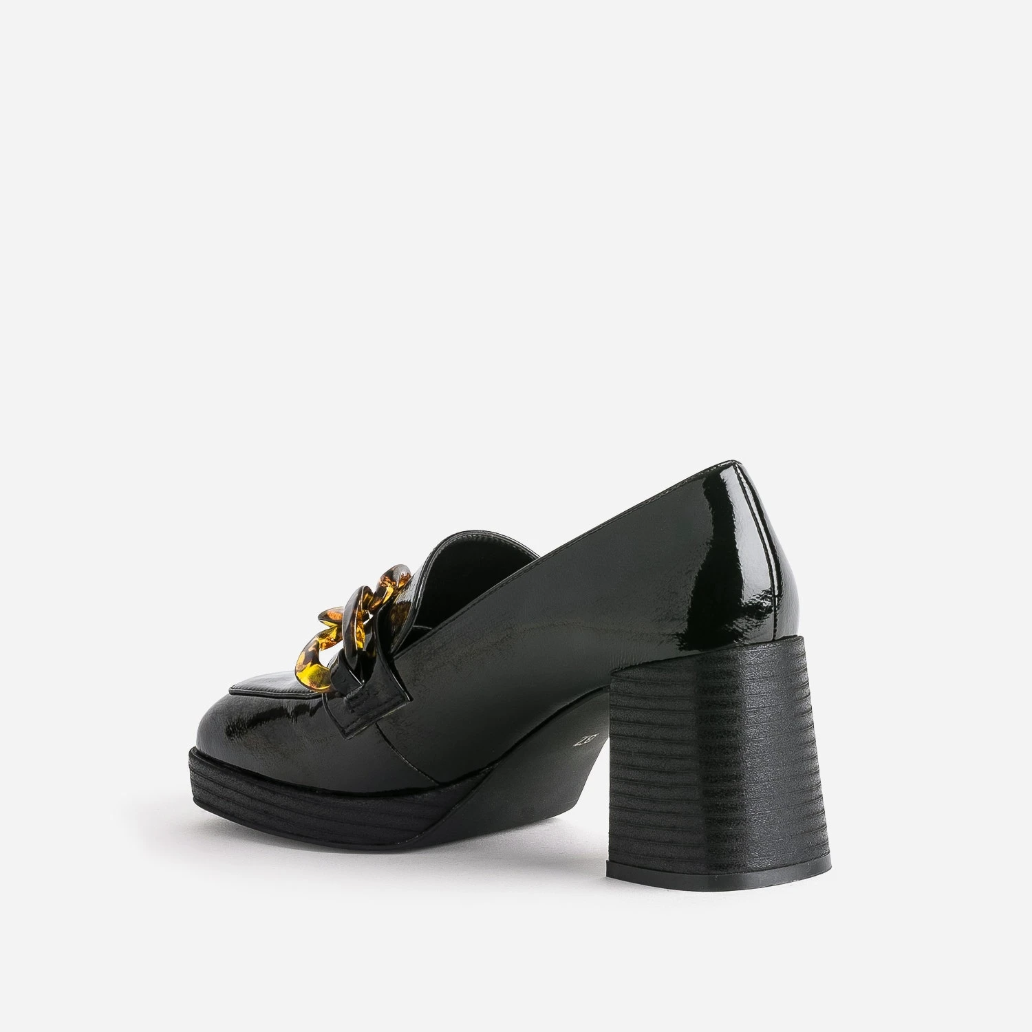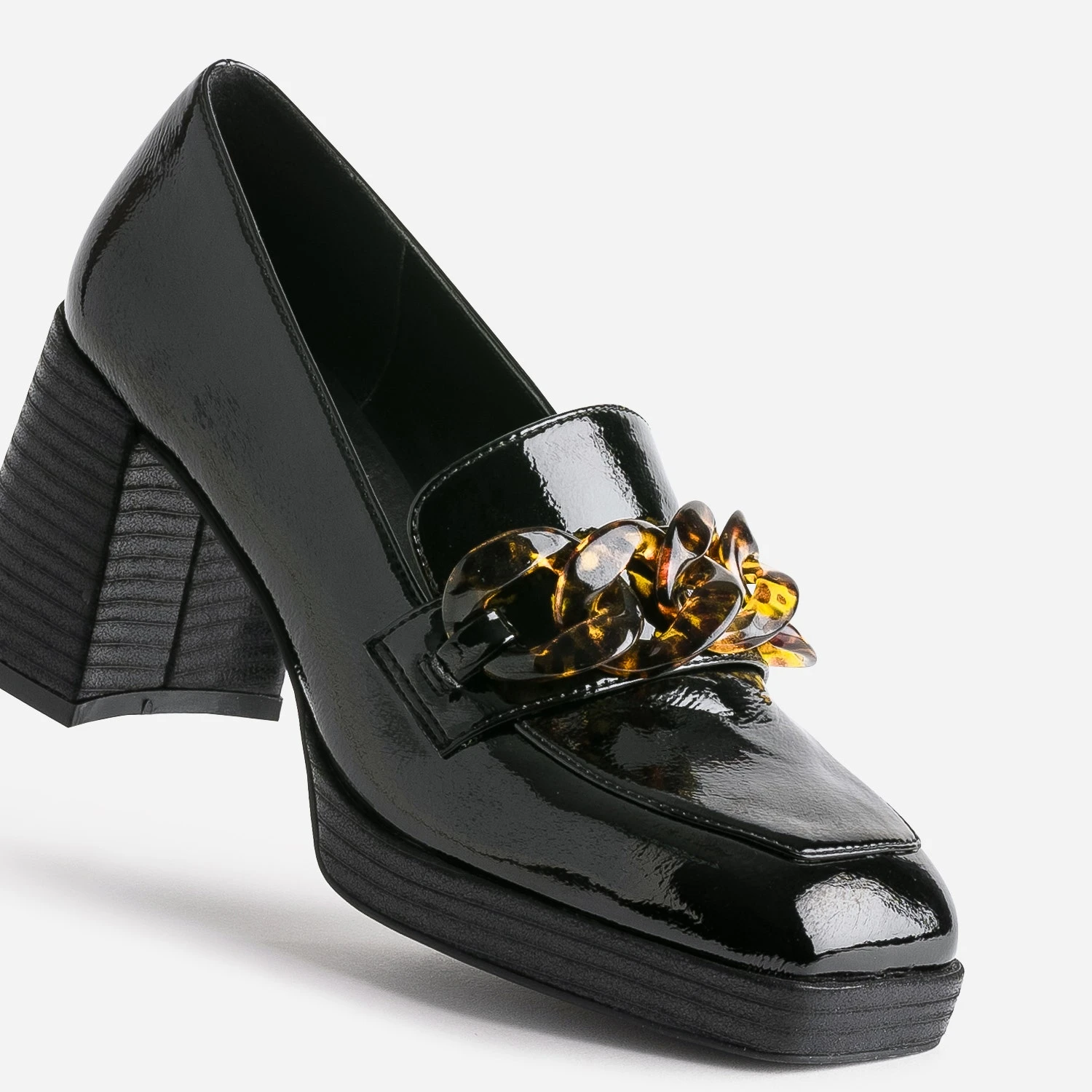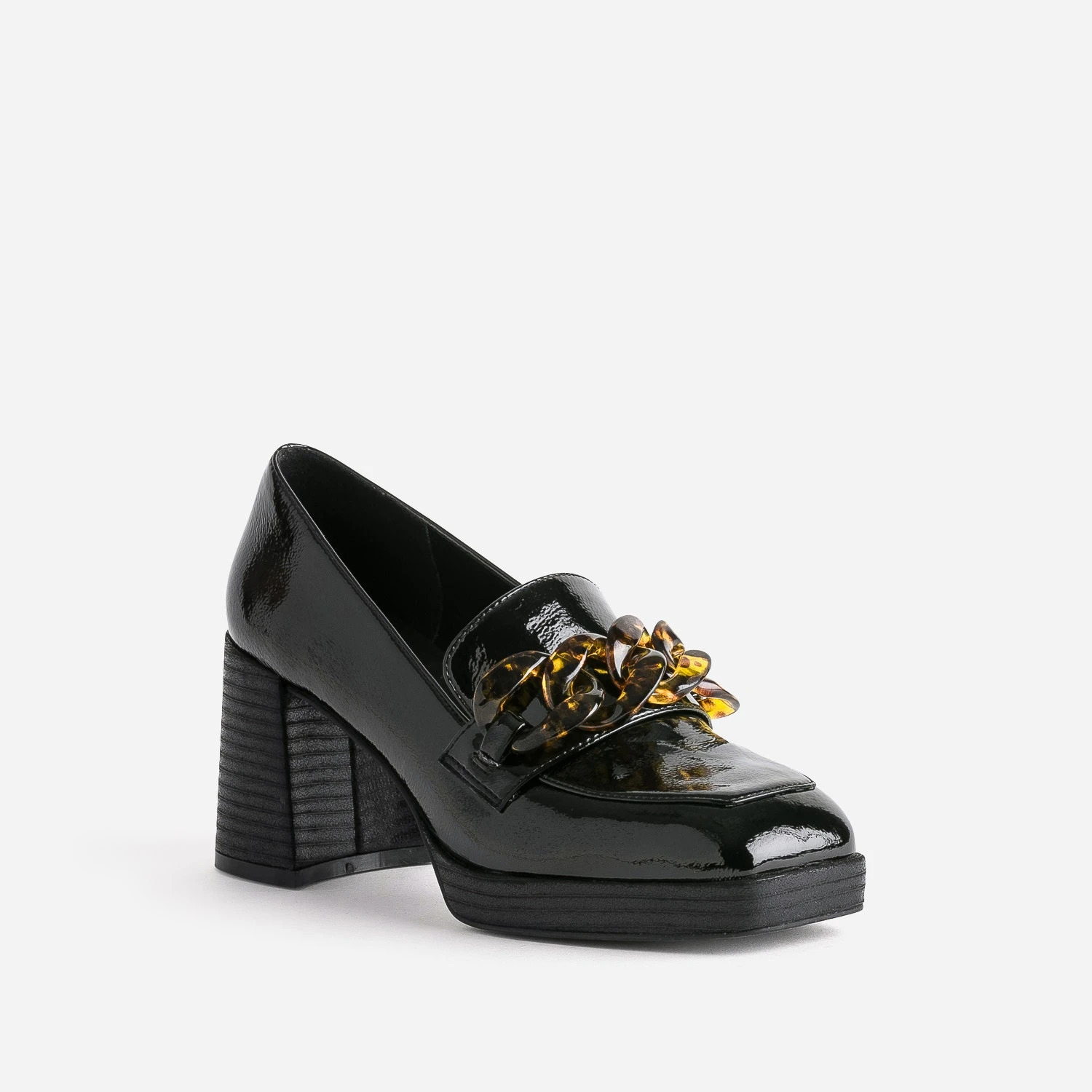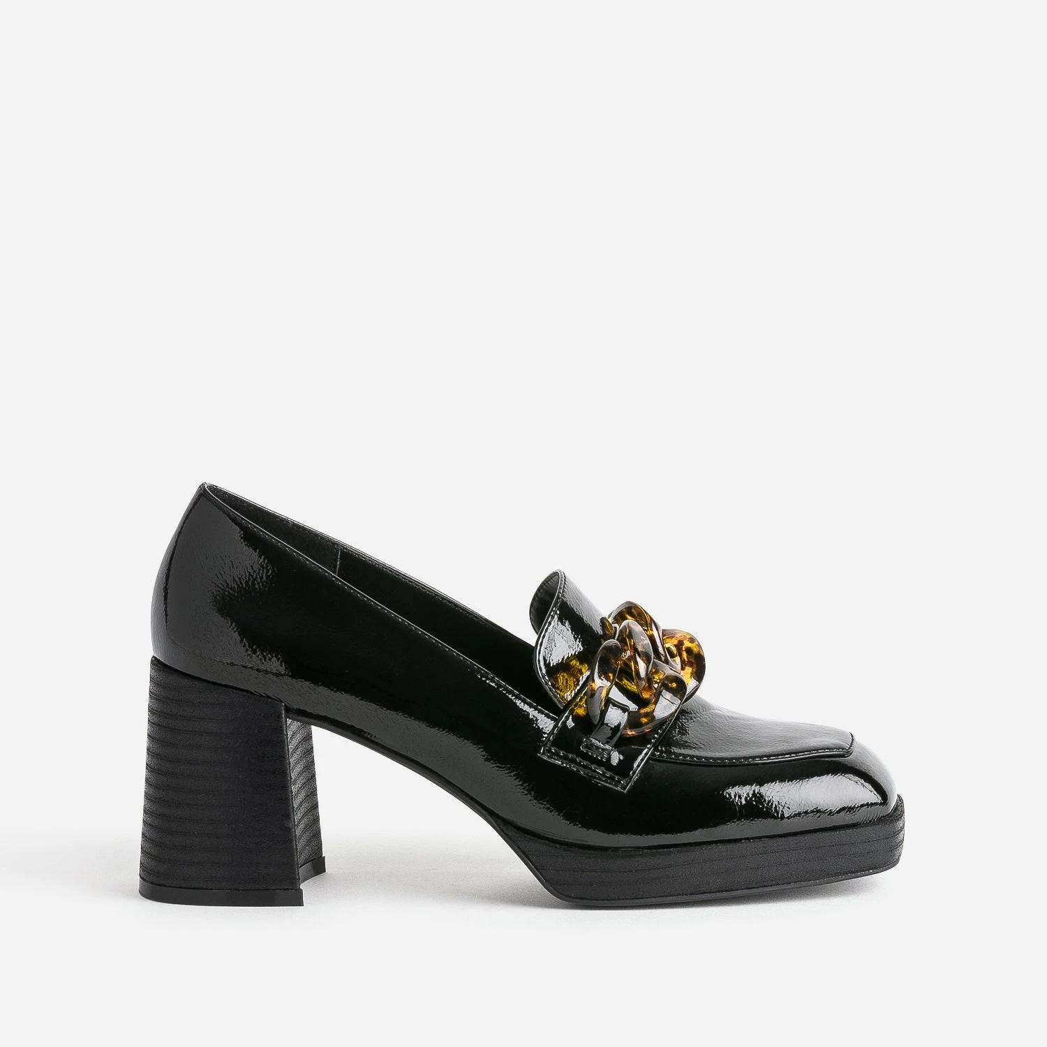 Le style baroque s’invite sur ce mocassin pour femme. Bout carré, plateforme et talon flare imitation bois, coloris noir avec finition vernie et surtout, une maxi chaîne façon écaille, posée sur le dessus du pied. Marquez son originalité et votre différence, en l’associant à un vestiaire d’écolière faussement sage : chemise blanche, cravate, jupe, blazer et pantalon à pinces.
