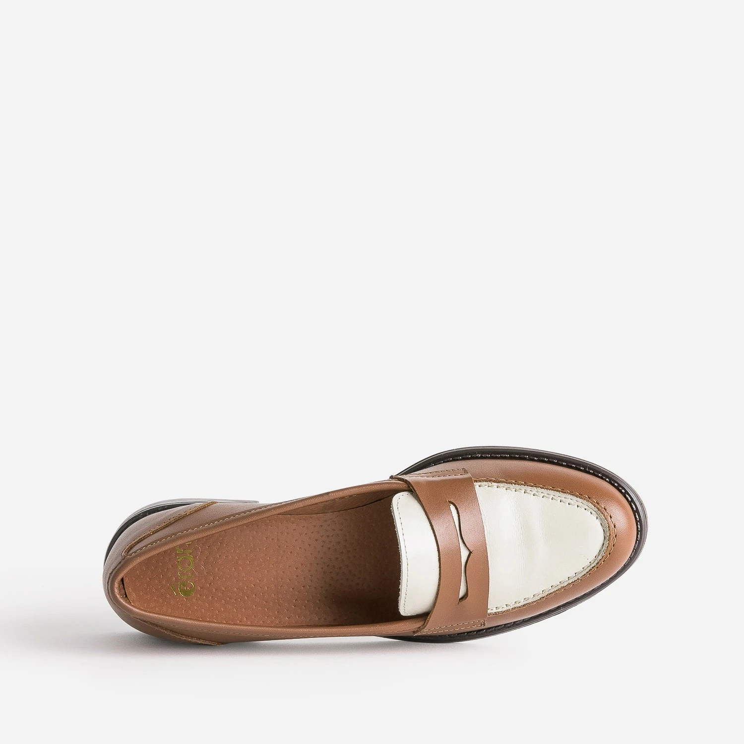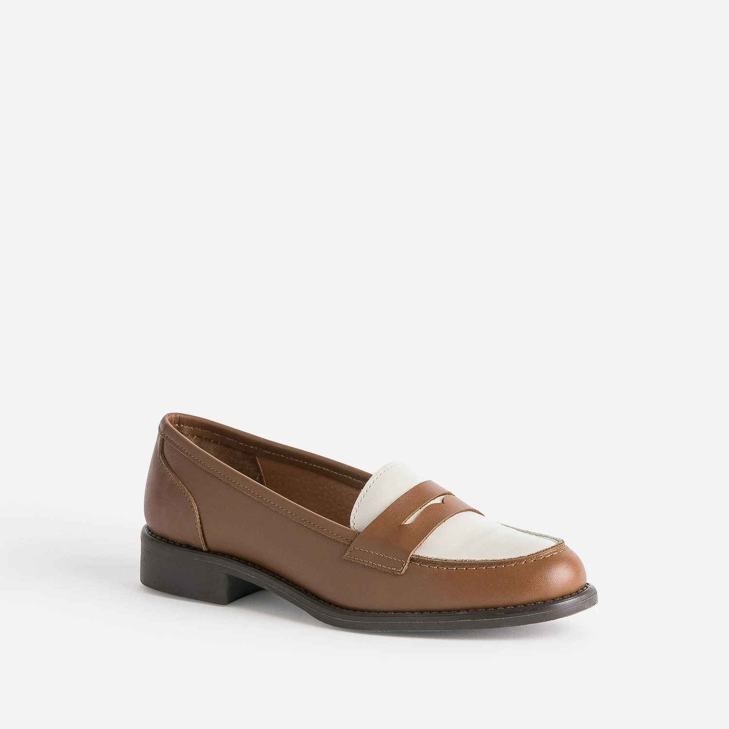 Jeu de bicolore maîtrisé pour le mocassin pour femme. En cuir, il associe le camel à un empiècement écru, sur le dessus, contrastant avec la découpe-masque. Préférez-le avec un costume pied-de-poule sur fond beige, avec une chemise blanche et un jean brut, avec un pull écru et un pantalon camel.
