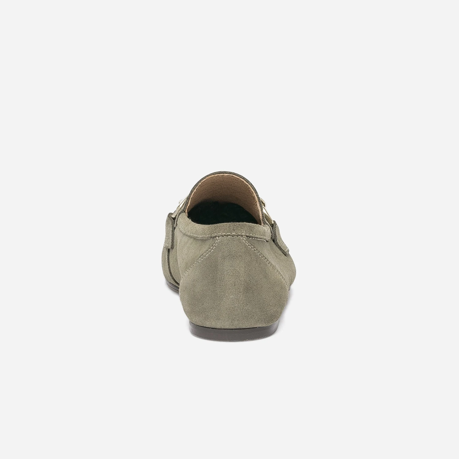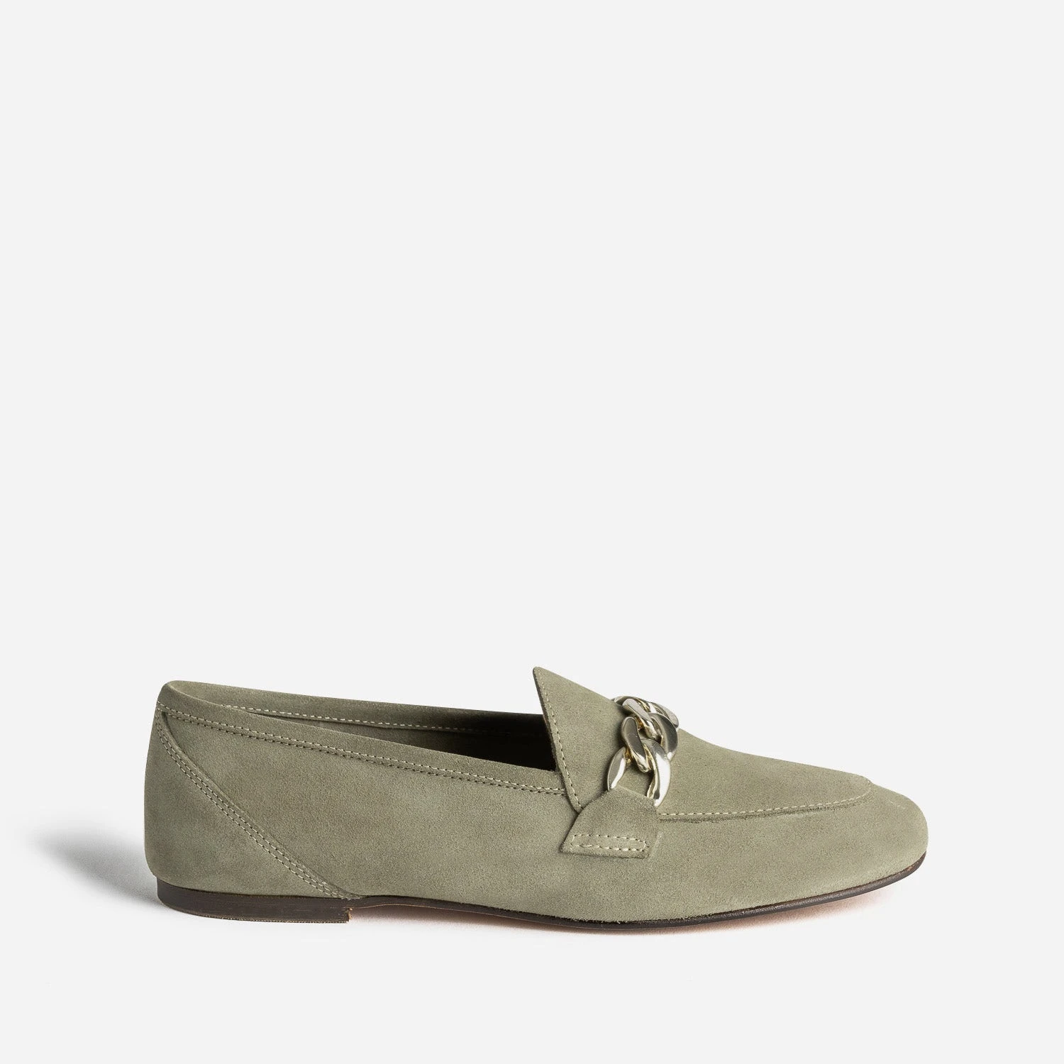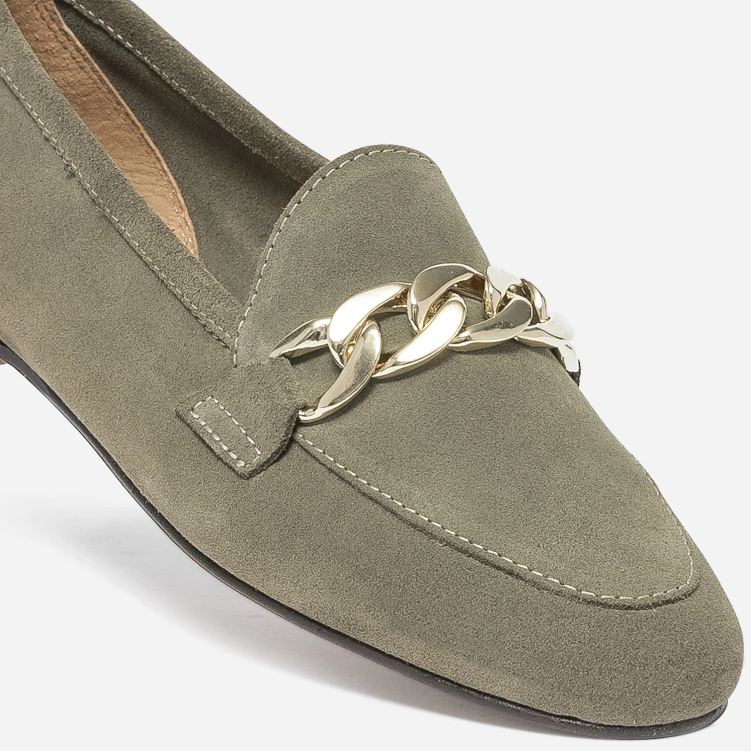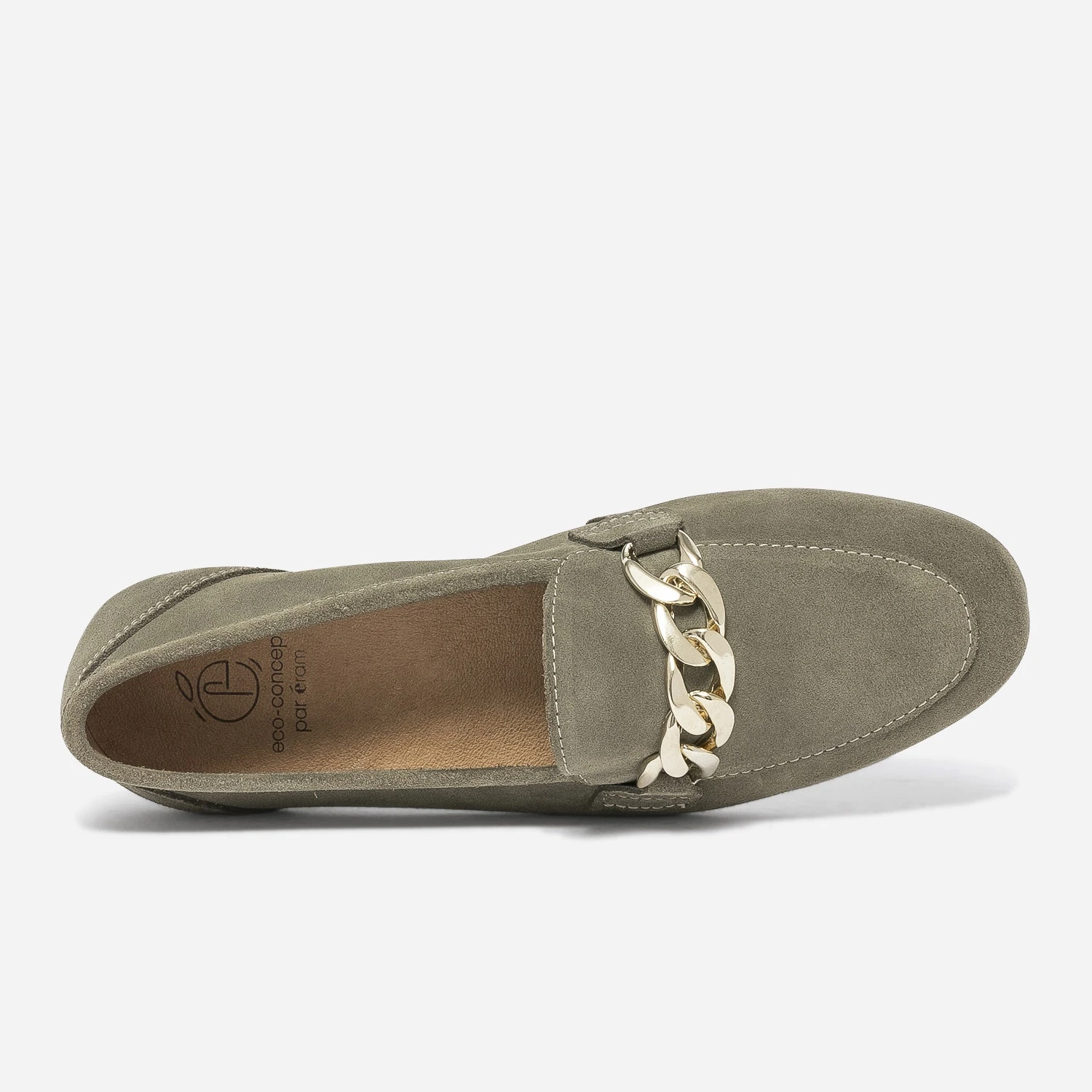 En cuir velours et non doublé, ce mocassin femme est gage de confort avant tout. Son coloris kaki s’inscrit dans la tendance et sa maxi chaîne en métal doré apporte une touche chic. Associez-le avec des tons automnaux, comme le camel, le safran ou le bordeaux.