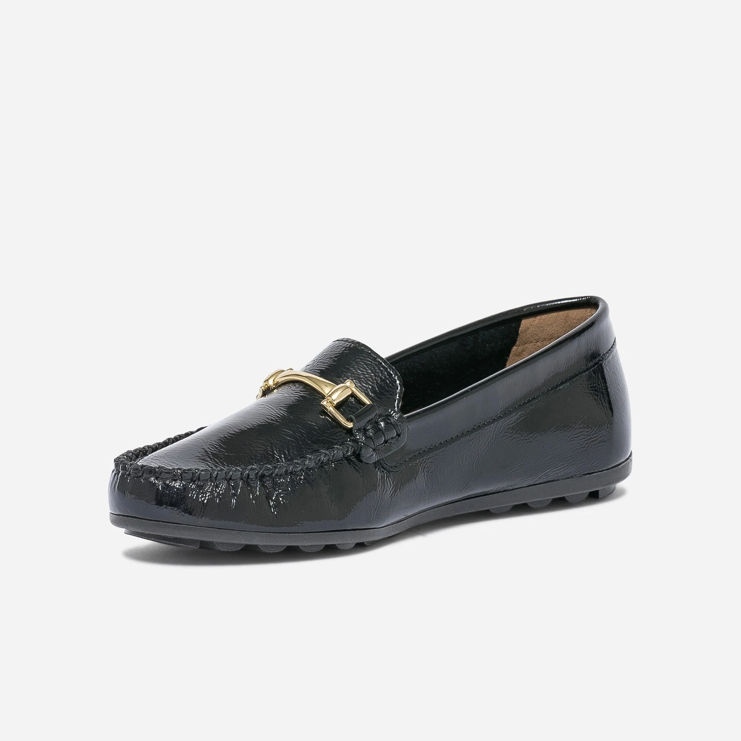 Le mocassin est idéal pour gérer l’entre-saison en douceur. Il se porte impérativement nu-pieds pour profiter de la souplesse et du confort du cuir. Coloris noir, il accueille une finition vernie très chic, souligné d’un mors doré. Un modèle à privilégier avec des pièces unies dans les tons neutres.