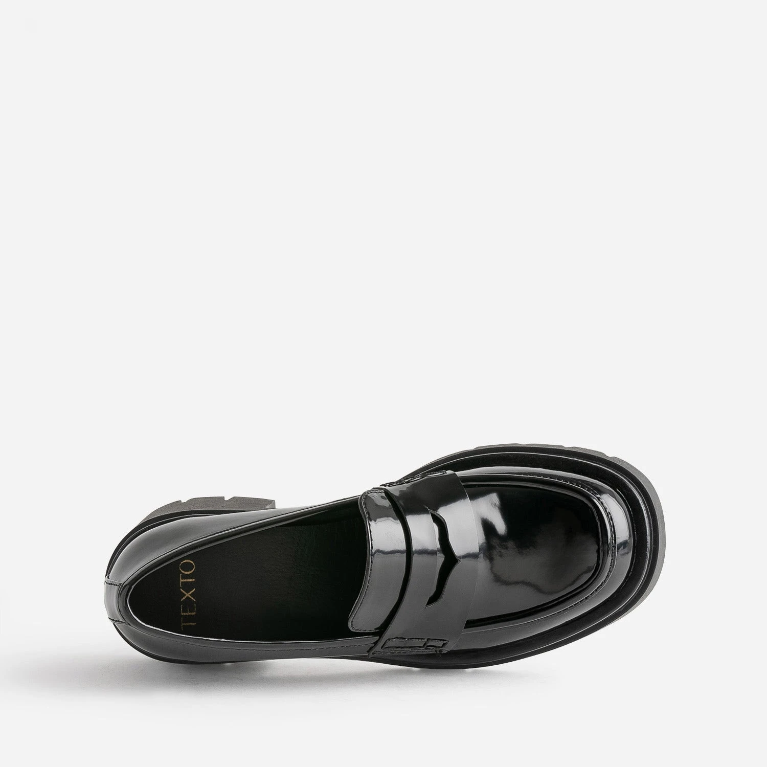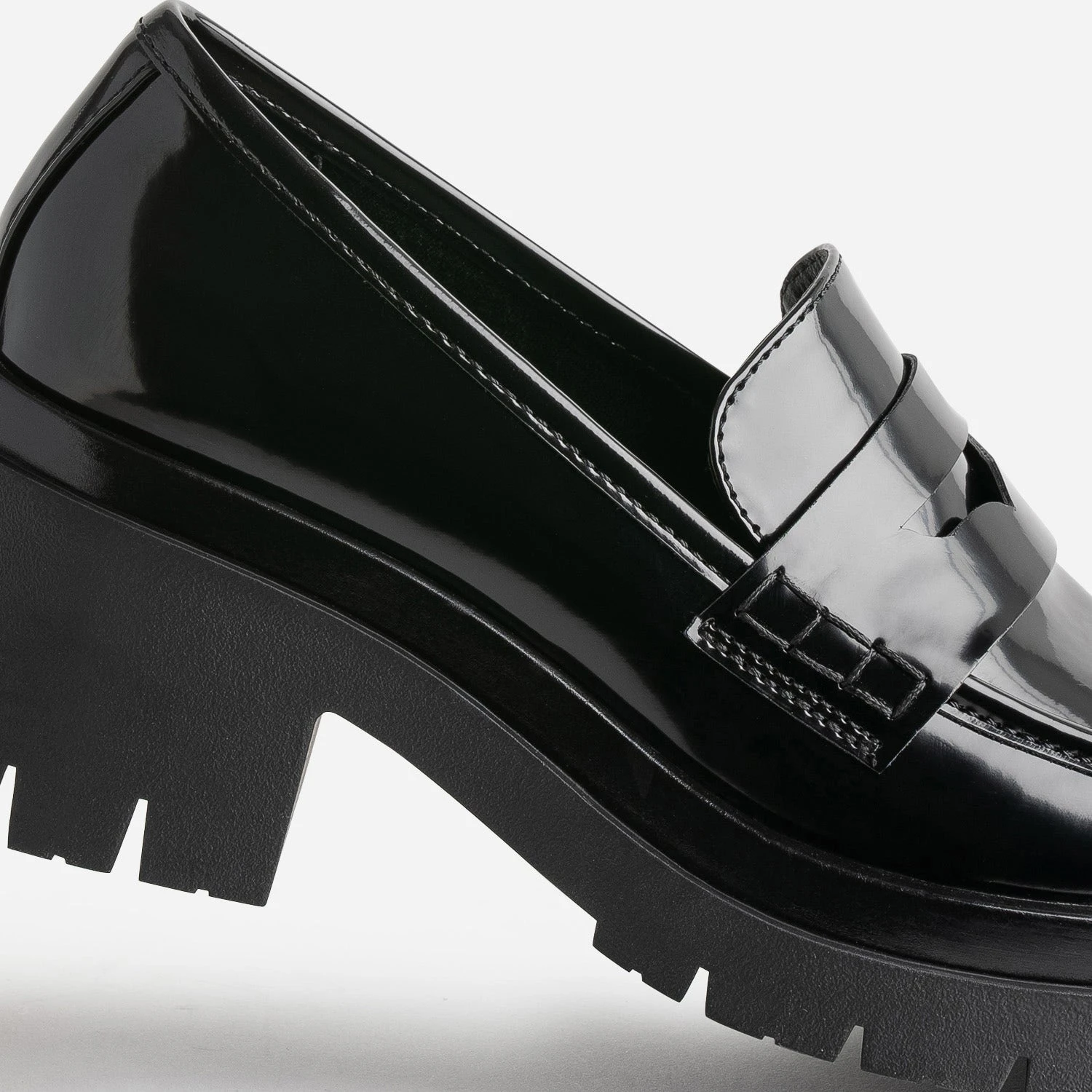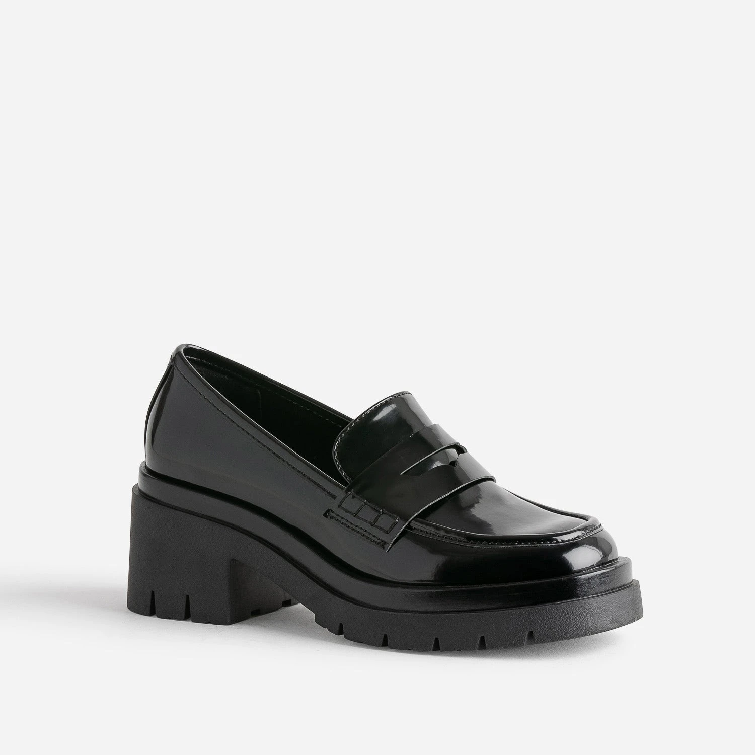 Fan des mocassins ? Adeptes des talons ? Essayez ce mocassin à talon. En matière synthétique noire et légèrement glacée, il est monté sur une semelle épaisse et crantée, et un talon large qui assure une parfaite stabilité. Dessus, la découpe-masque conserve sa place. Un modèle à décaler avec un look preppy , robe ou jupe patineuse et socquettes blanches.