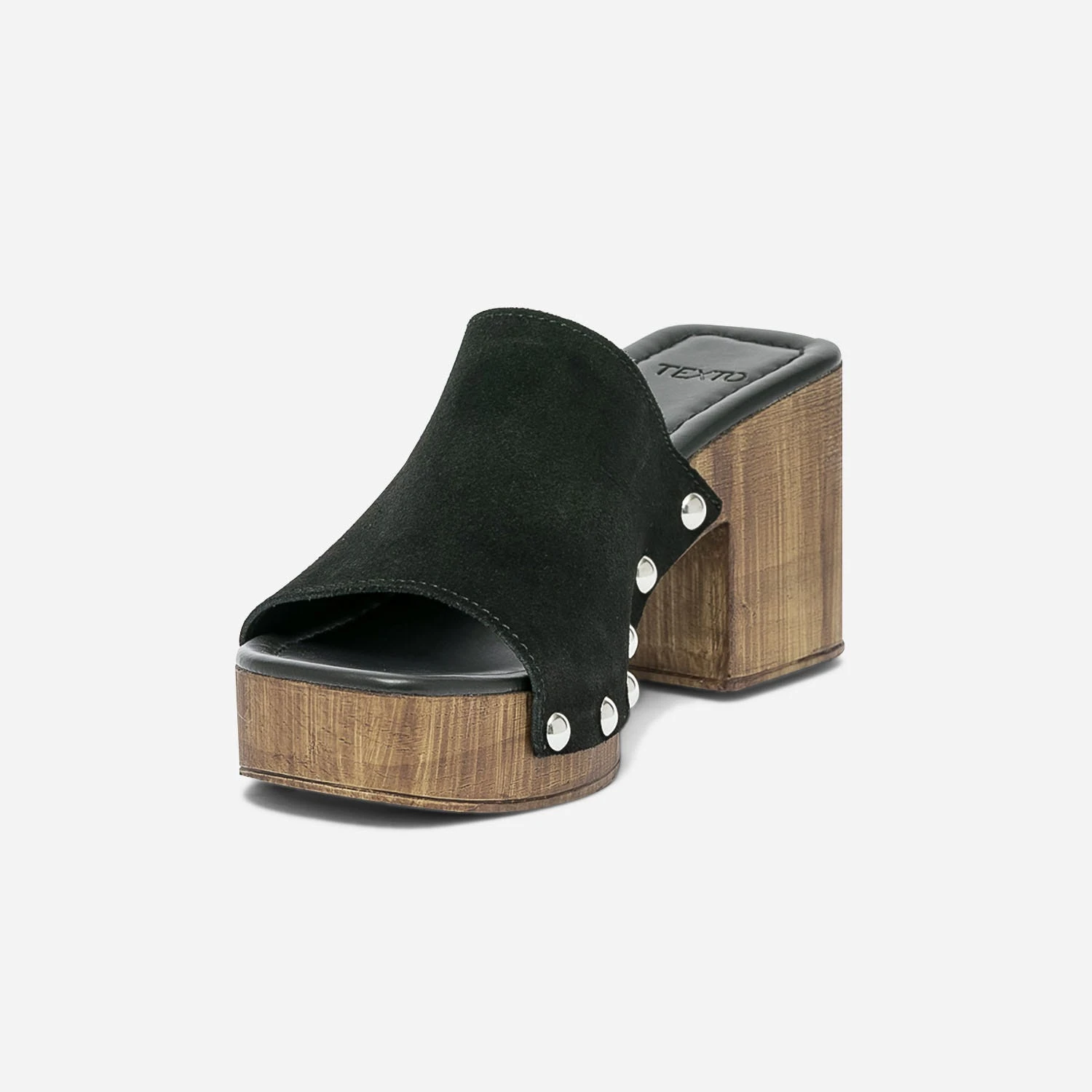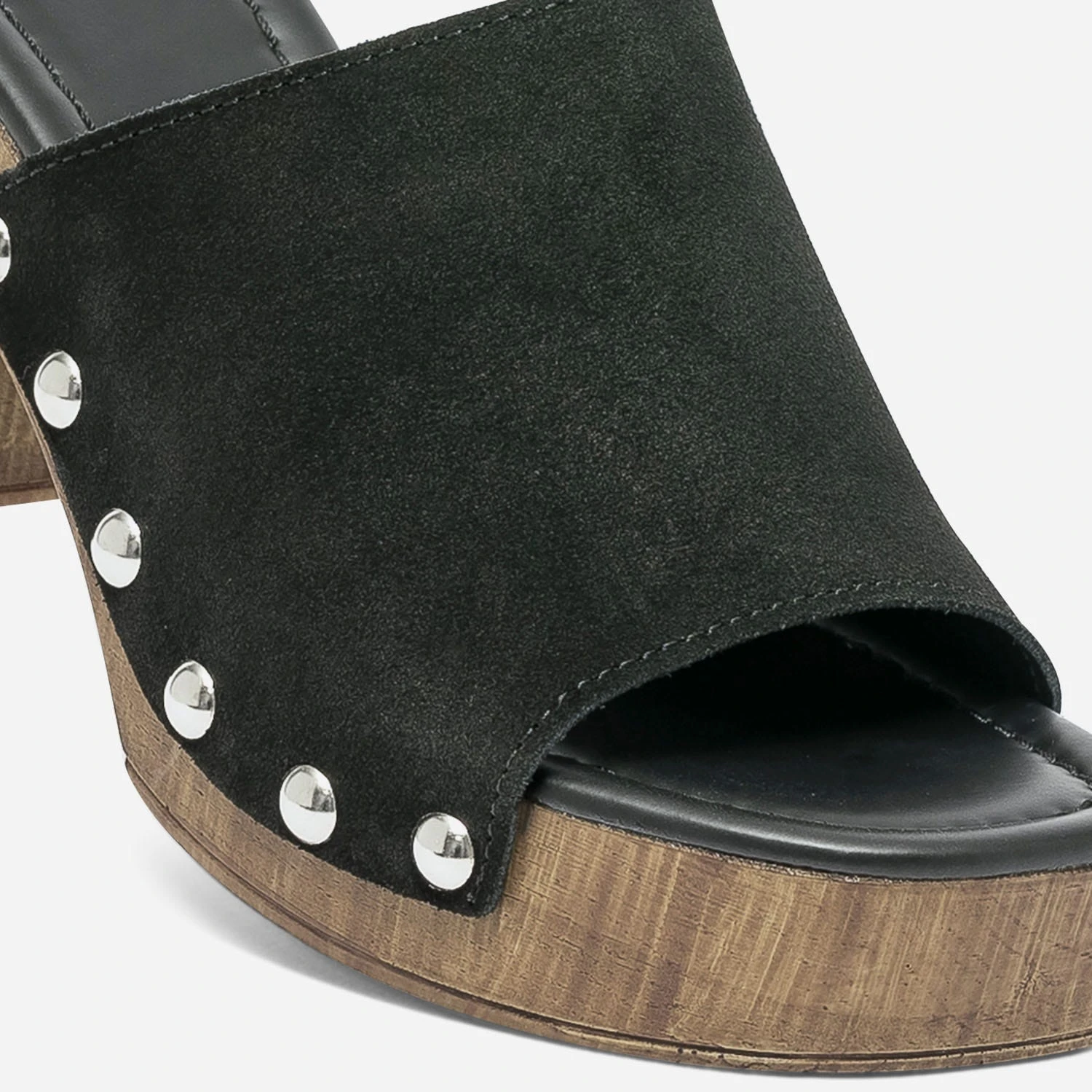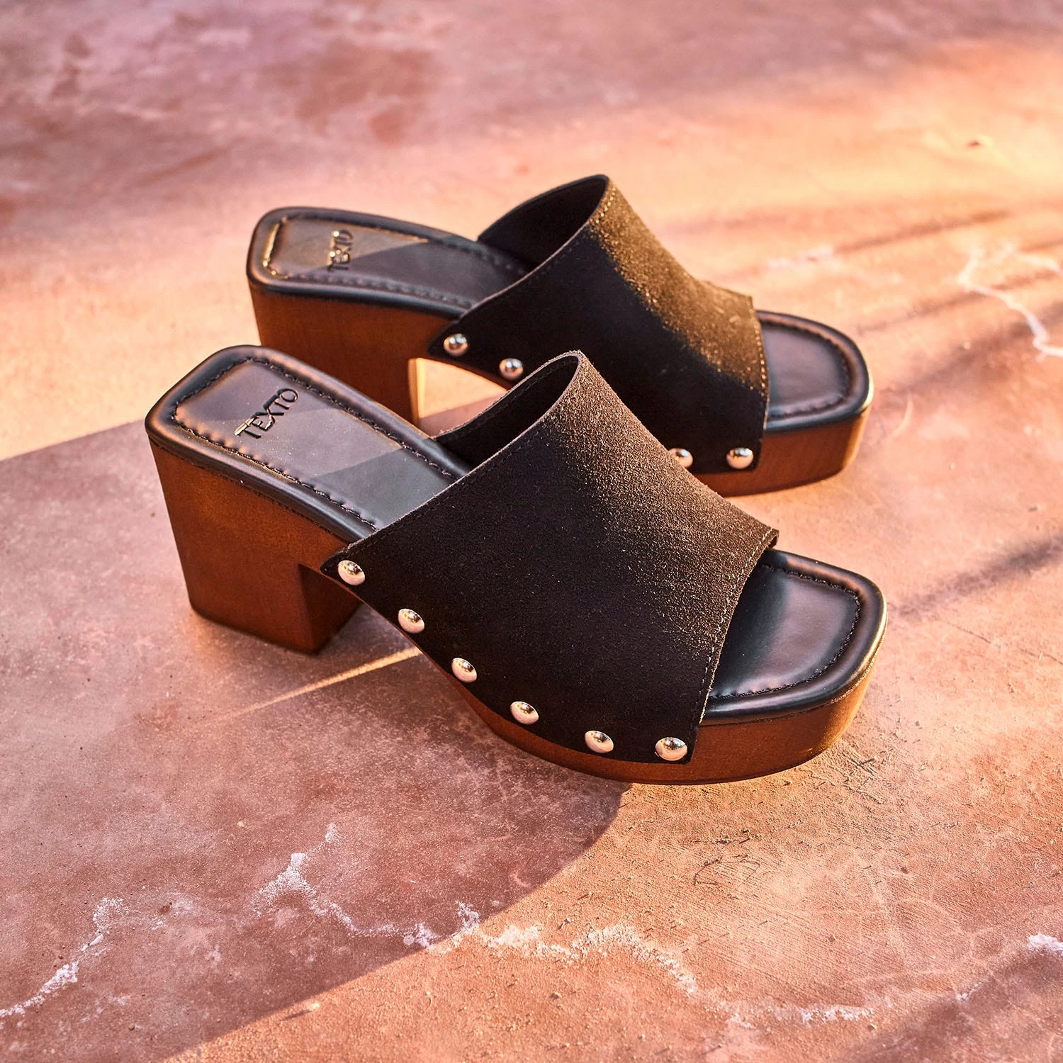 L’esprit seventies anime cette mule pour femme. En cuir velours noir, la large bride, doublé d’un talon carré imitation bois, assurent un parfait maintien du pied. Les maxi clous posés de chaque côté signent un style bohème rock à souhait. Un modèle à associer avec une blouse brodée et un jean flare noir.