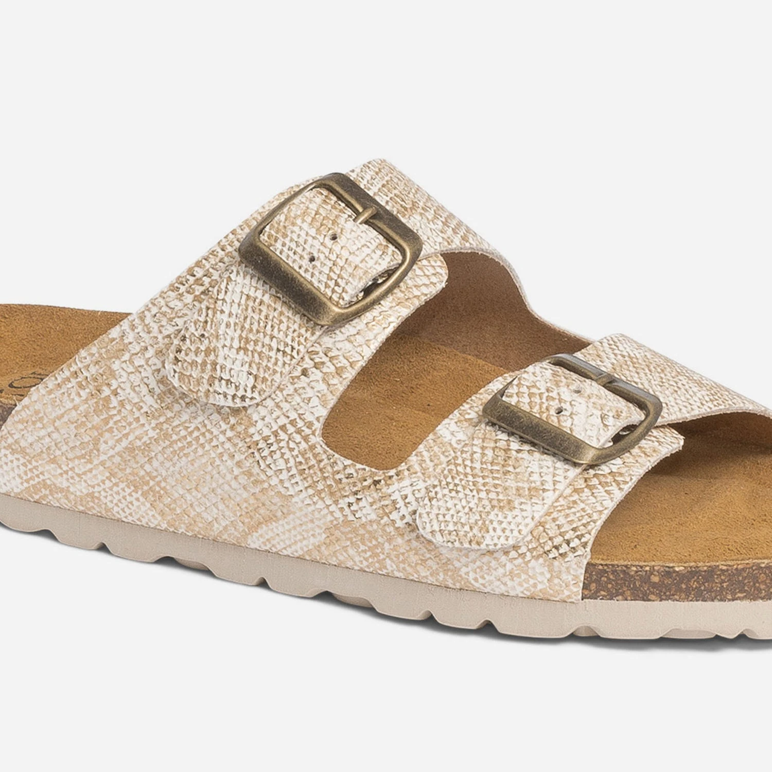N’hésitez plus. La semelle anatomique est la solution pour un confort absolu. Cette mule pour femme séduit par ses 2 larges brides grises, rythmées d’un imprimé effet python avec touches de blanc et de doré. Un modèle plébiscité par les fashionistas, avec un tee-shirt loose et un jean cropped.
