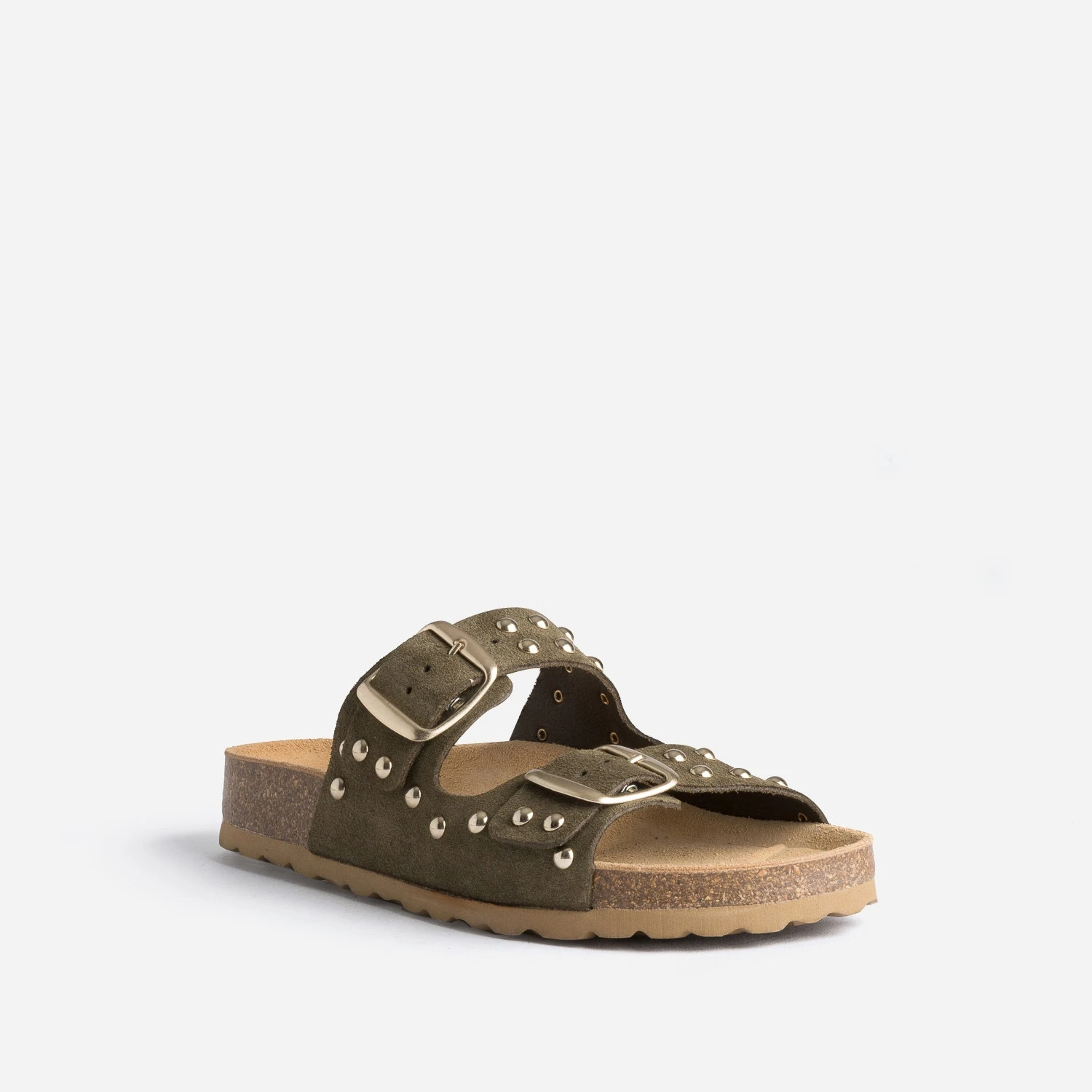 Il n’y a que celles qui ne l’ont pas encore essayée qui peuvent encore y résister ! La mule anatomique assume son côté irrésistible, par son confort et son style, alliés dans un parfait équilibre. Déclinée en coloris kaki, elle présente deux larges brides en cuir velours, décorées de clous en métal doré et ajustables par boucles. Elle est montée sur une semelle première ergonomique en cuir velours, un pur bonheur pour la plante du pied. Un modèle ultra rock, à imaginer avec un tee-shirt à épaulettes et un short en jean à franges, en total look black or white.