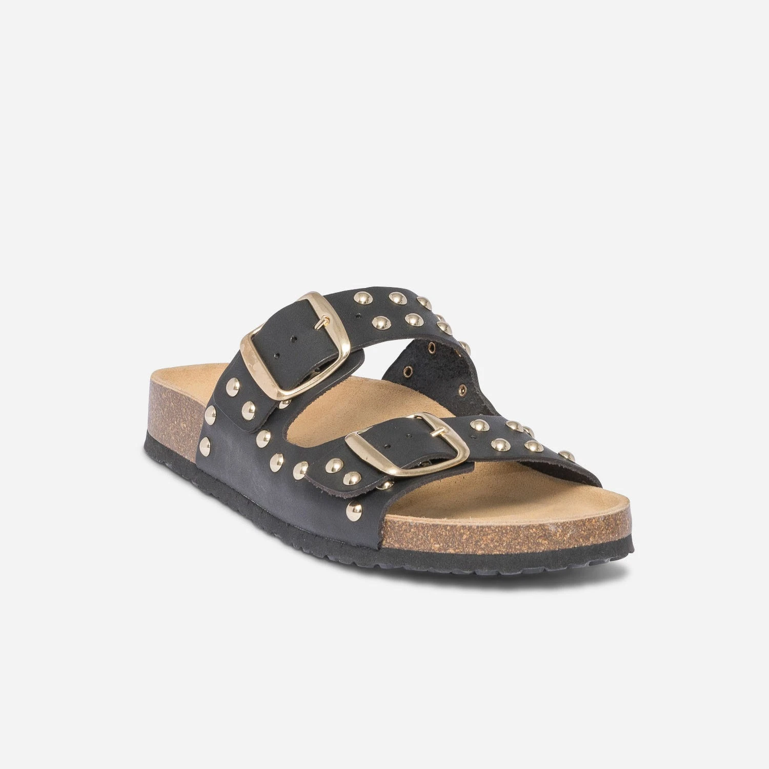Il n’y a que celles qui ne l’ont pas encore essayée qui peuvent encore y résister ! La mule anatomique assume son côté irrésistible, par son confort et son style, alliés dans un parfait équilibre. Déclinée en coloris noir, elle présente deux larges brides en cuir, décorées de clous en métal doré et ajustables par boucles. Elle est montée sur une semelle première ergonomique en cuir velours, un pur bonheur pour la plante du pied. Un modèle ultra rock, à imaginer avec un tee-shirt à épaulettes et un short en jean à franges, en total look black or white.