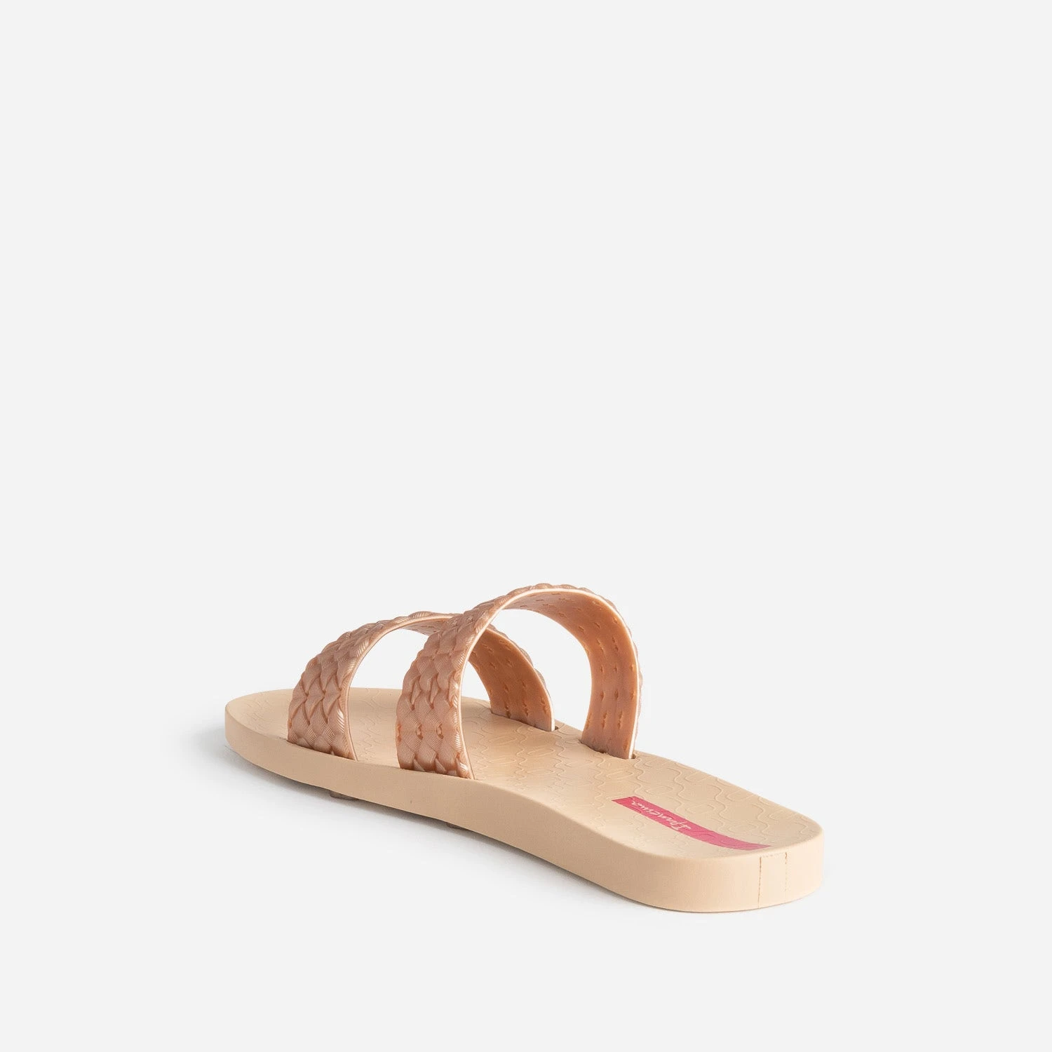 Changez pour la mule. Beige nude, elle maintient le pied par deux brides tressées légèrement blush et irisée, et la semelle est animée d’un motif graphique, en écho à celui du remblai de la plage d’Ipanema. Un modèle idéal pour la plage ou la piscine, facile à glisser dans la valise de week-end ou de vacances.