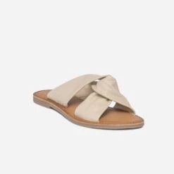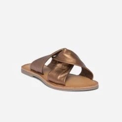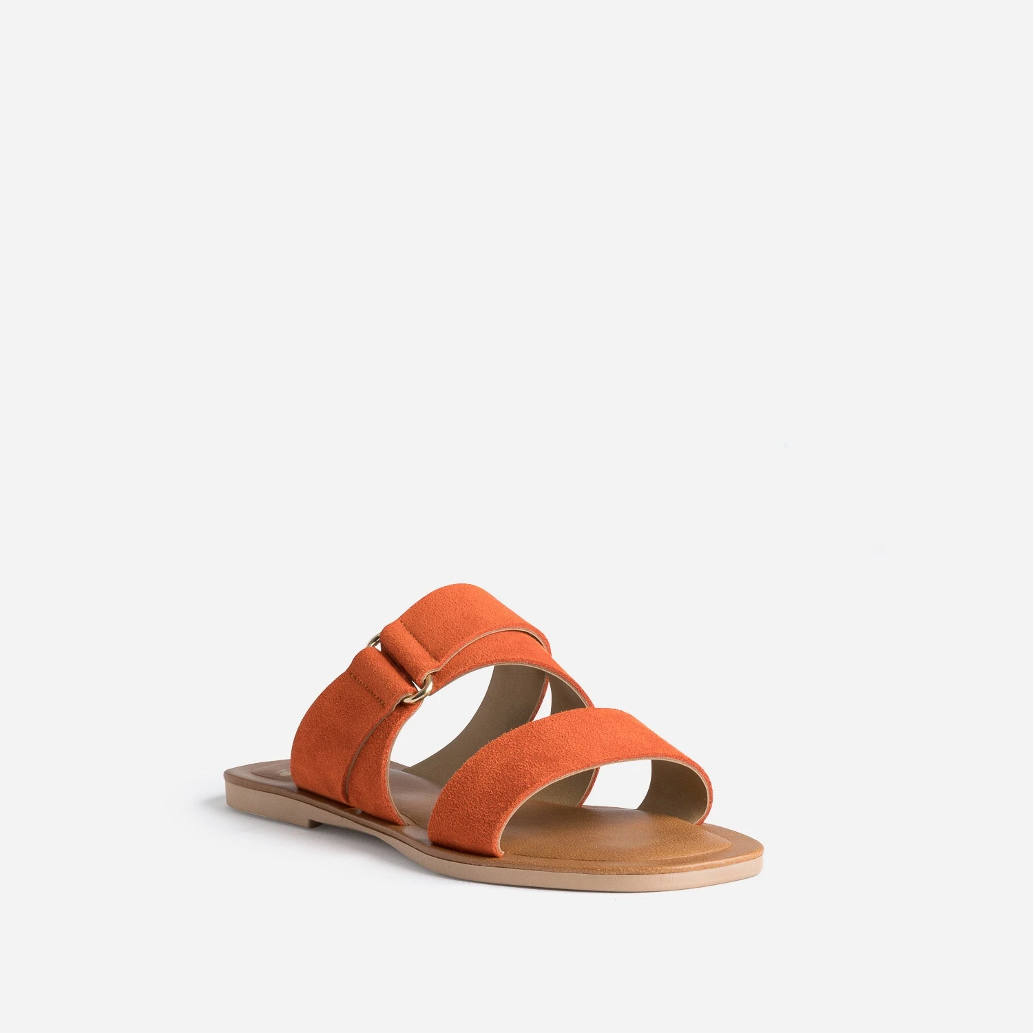 1, 2, 3 brides, pour cette nouvelle mule pour femme. Elles sont confectionnées en cuir velours, maintenues par un anneau en métal doré sur le cou-de-pied et montées sur une semelle plate à bout carré. Un modèle décliné en coloris orange, sublime avec une tenue en camaïeu de beige et vernis assorti.