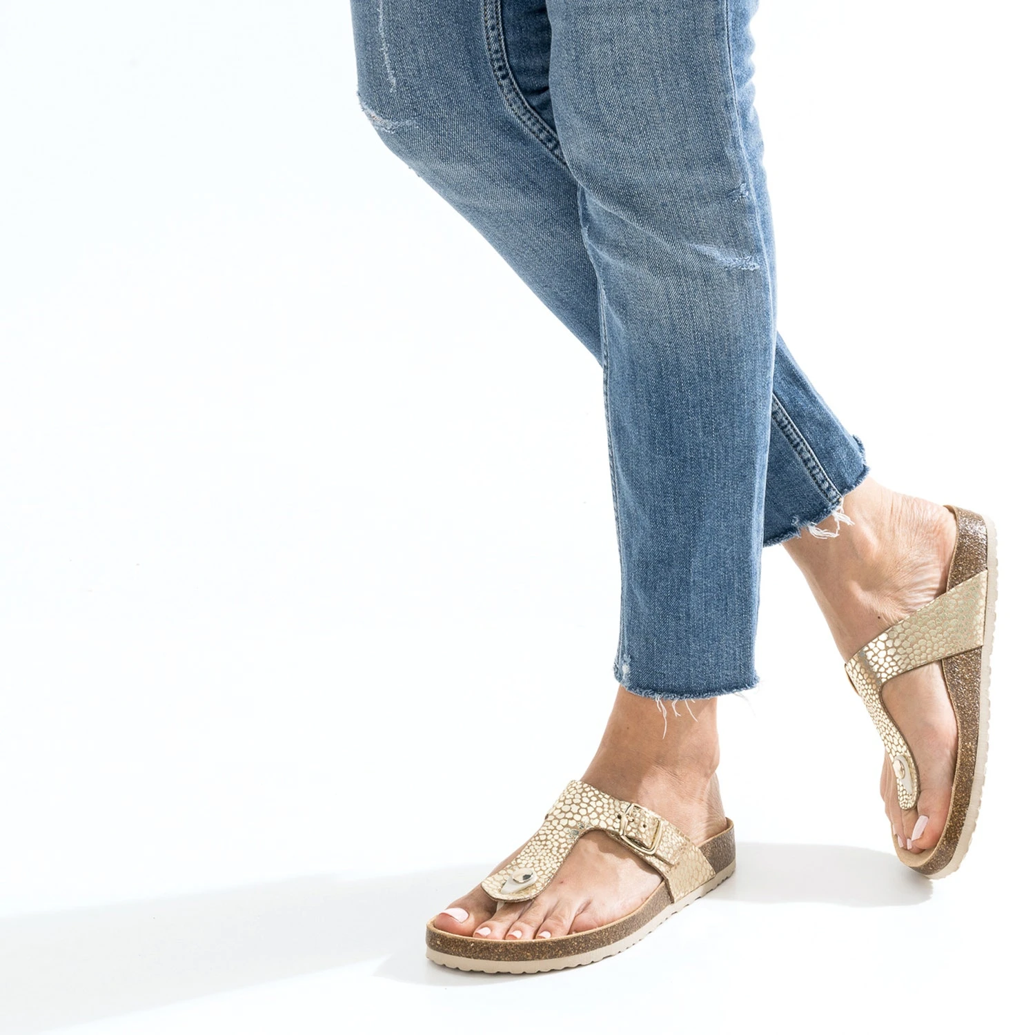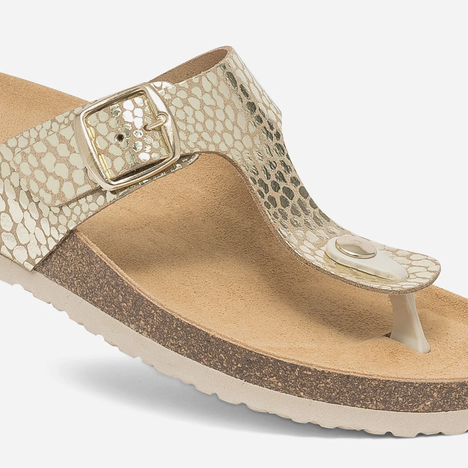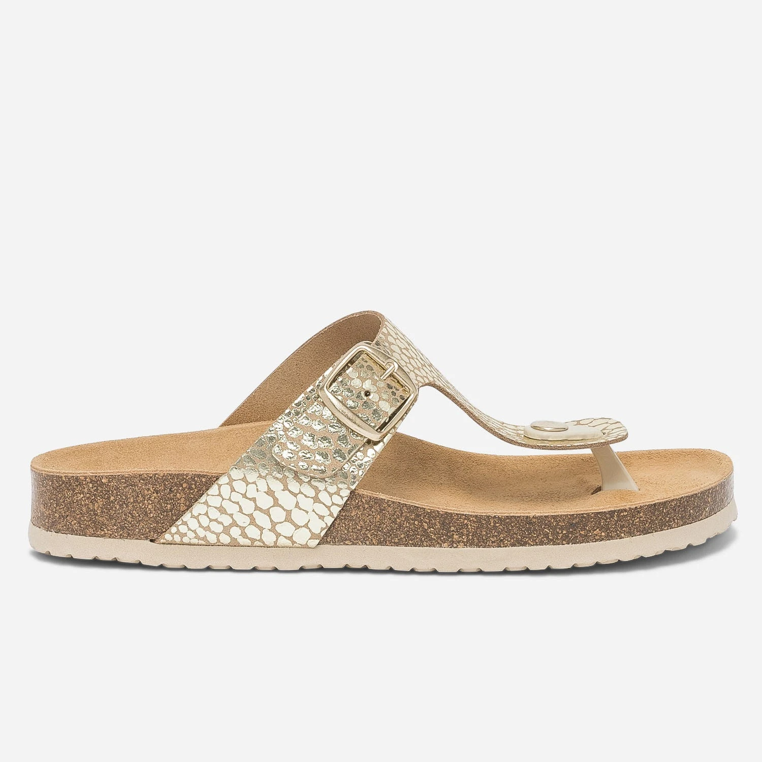 Pourquoi on aime cette tong ? Pour sa semelle anatomique, spécifiquement étudiée pour soulager le pied et offrir un confort optimal. Pour sa confection, en cuir doré twisté d’un effet python ton sur ton sur les brides et en cuir velours beige sur la semelle. Elle signe un style casual largement plébiscité par les modeuses. L’essayer, c’est l’adopter !