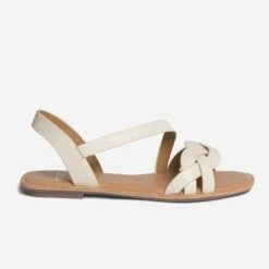 Cette sandale femme est à un modèle à prix tout doux, à collectionner pour l’été ! En matière synthétique lisse beige clair, elle se démarque par une bride tressée sur le dessus du pied et une bride plus fine du cou-de-pied jusqu’à la cheville. Plate, elle vous accompagne tout au long de la journée.