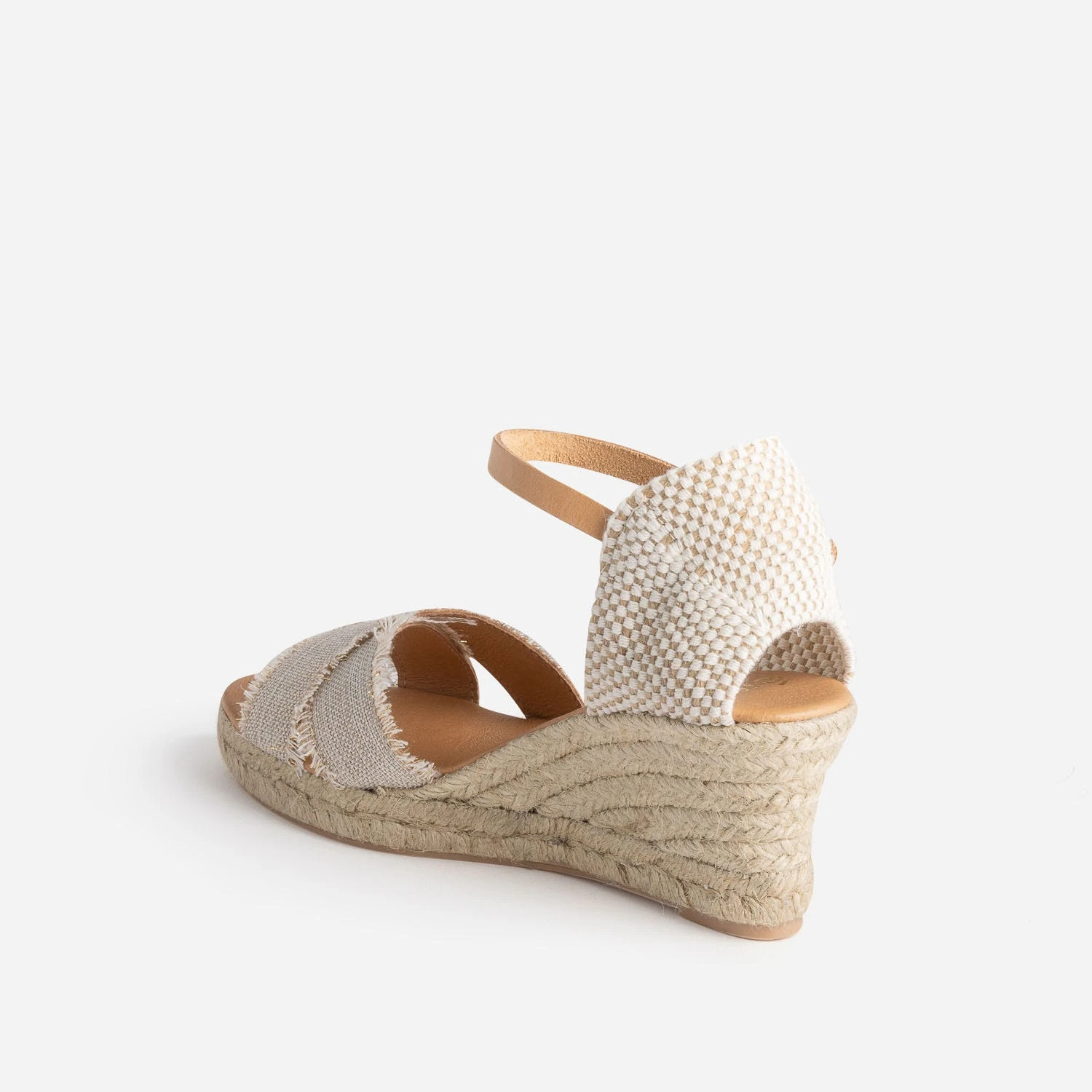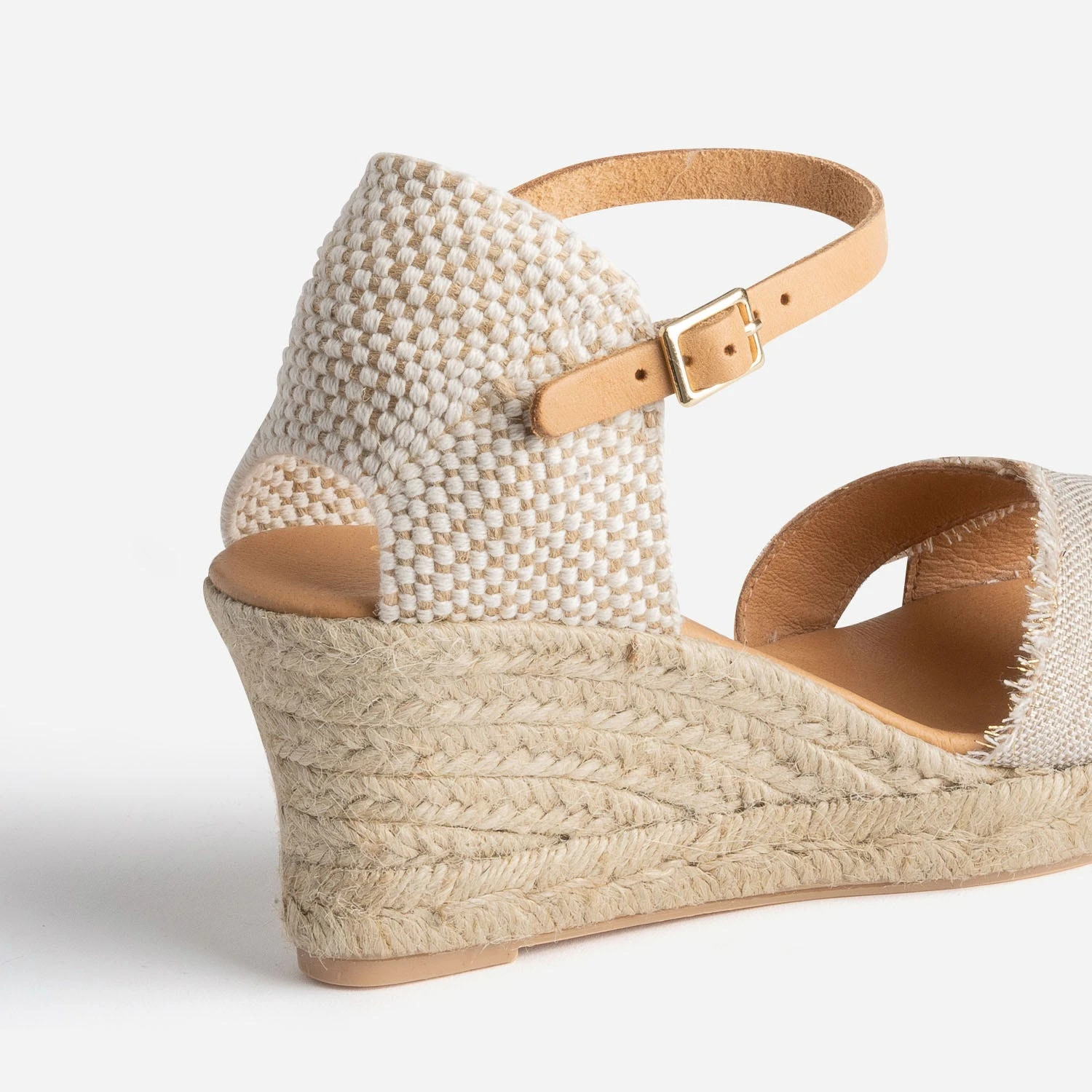 Look bohème décontracté assumé pour cette sandale à talon compensé en corde. Les deux brides en toile adoptent un coloris beige avec fils dorés et finition bords frangés. Avec une veste de costume en lin beige sur un jean blanc, au bureau, ou avec un combi short en jean bleu, en week-end, elle s’adapte à vos tenues estivales, avec une facilité déconcertante.