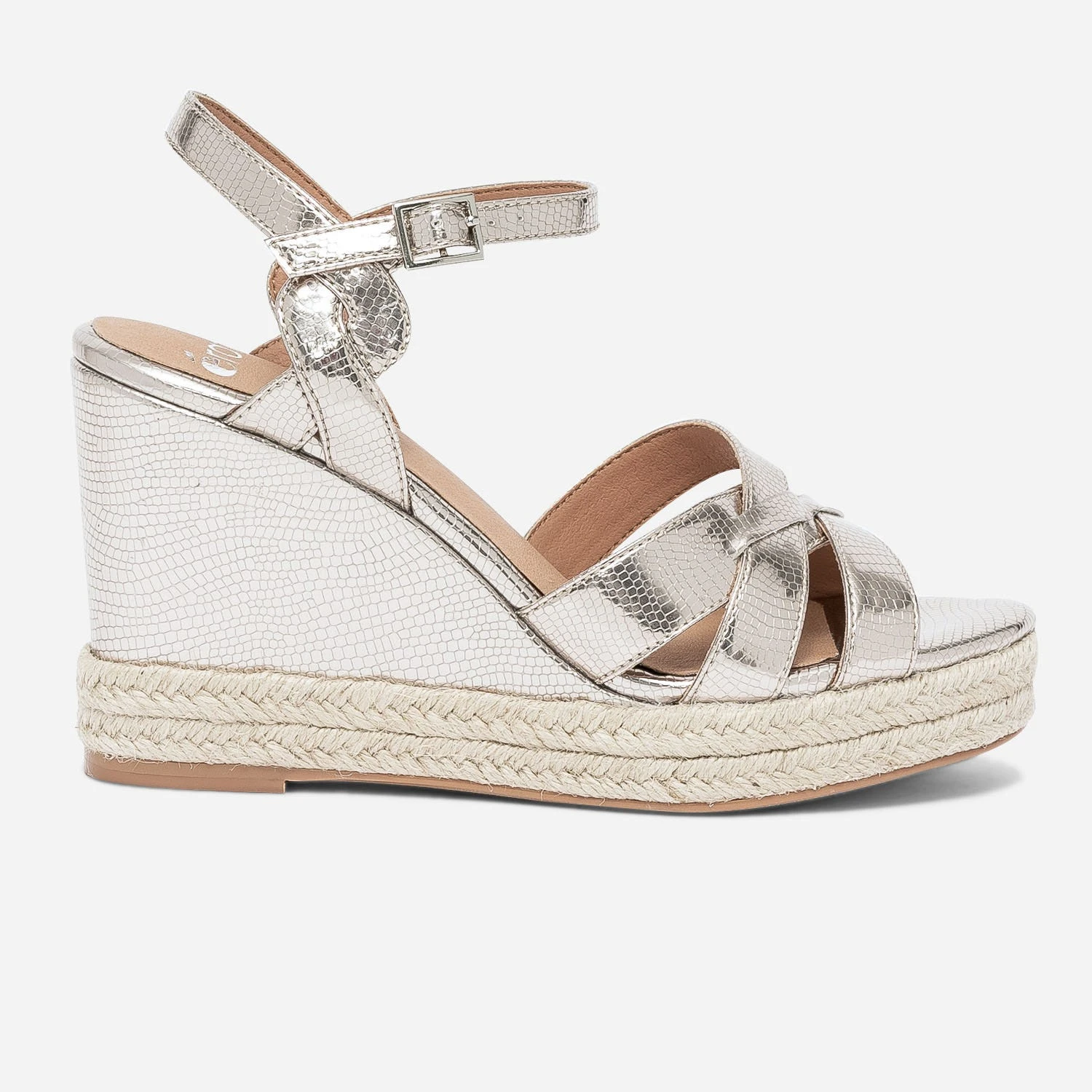 Le motif python fait toujours son petit effet. En matière synthétique dorée légèrement cuivrée, il anime cette sandale femme par un embossage étudié. Montée sur un talon compensé bi matière, souligné de corde naturelle, elle allonge indiscutablement la silhouette. Un modèle pensé pour finaliser une tenue de fête, avec une tenue dans les tons pastel.