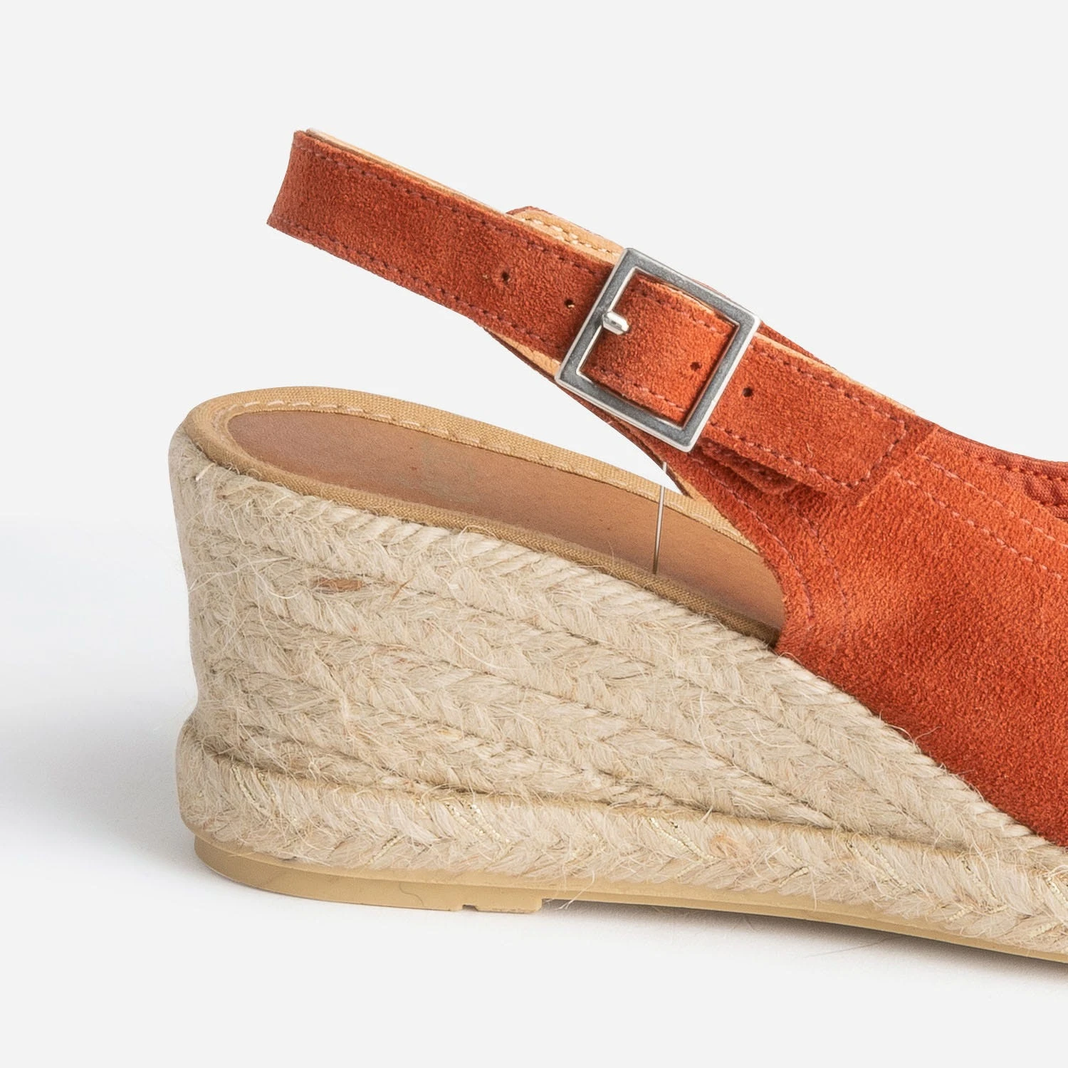 L’espadrille prend de la hauteur. Revisitée par un talon compensé, elle accueille deux larges brides en cuir velours terracotta, croisées sur le dessus du pied, libérant le bout des orteils. Elle se ferme par une boucle carrée en métal blanc sur la cheville. Portez-la avec des matières naturelles, lin ou coton, et des tons doux, beige ou camel, ou plus foncés, comme le prune ou le kaki.