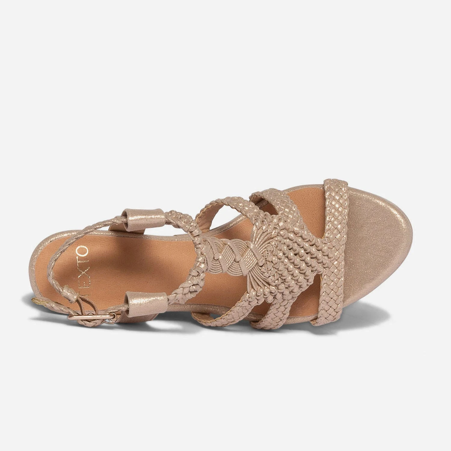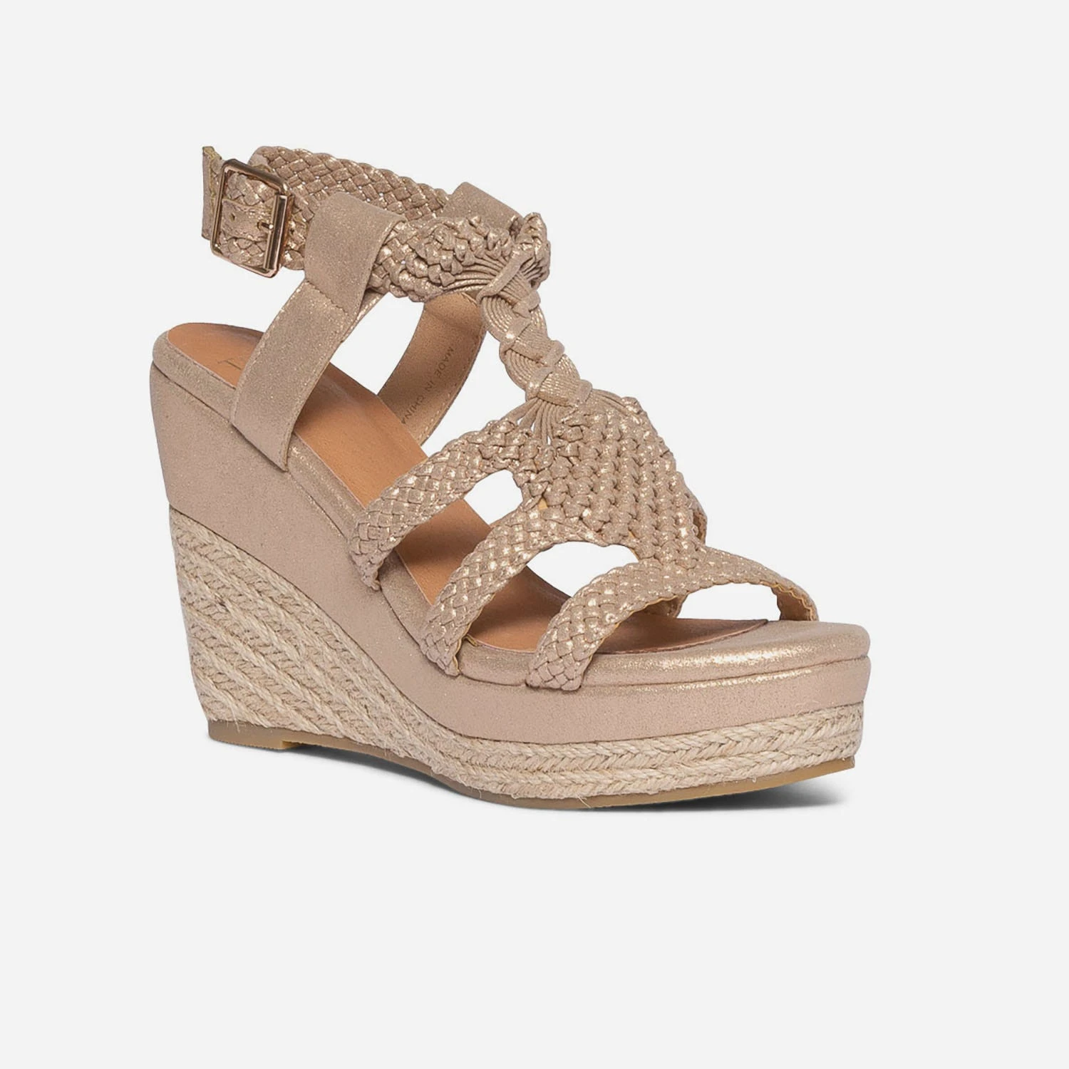 ça vous dirait de prendre 10 cm sans rien faire ? Essayez cette sandale compensée en corde. La cambrure s’adapte à la plante du pied, grâce à un patin avant de 3 cm. Confectionnées en matière synthétique, ses brides s’harmonisent par des jeux de tressage, des nœuds et des entrelacs étudiés. Son coloris ? Un beige avec finition irisée d’une grande beauté. Un modèle qui renouvelle l’esprit bohème, avec chic.