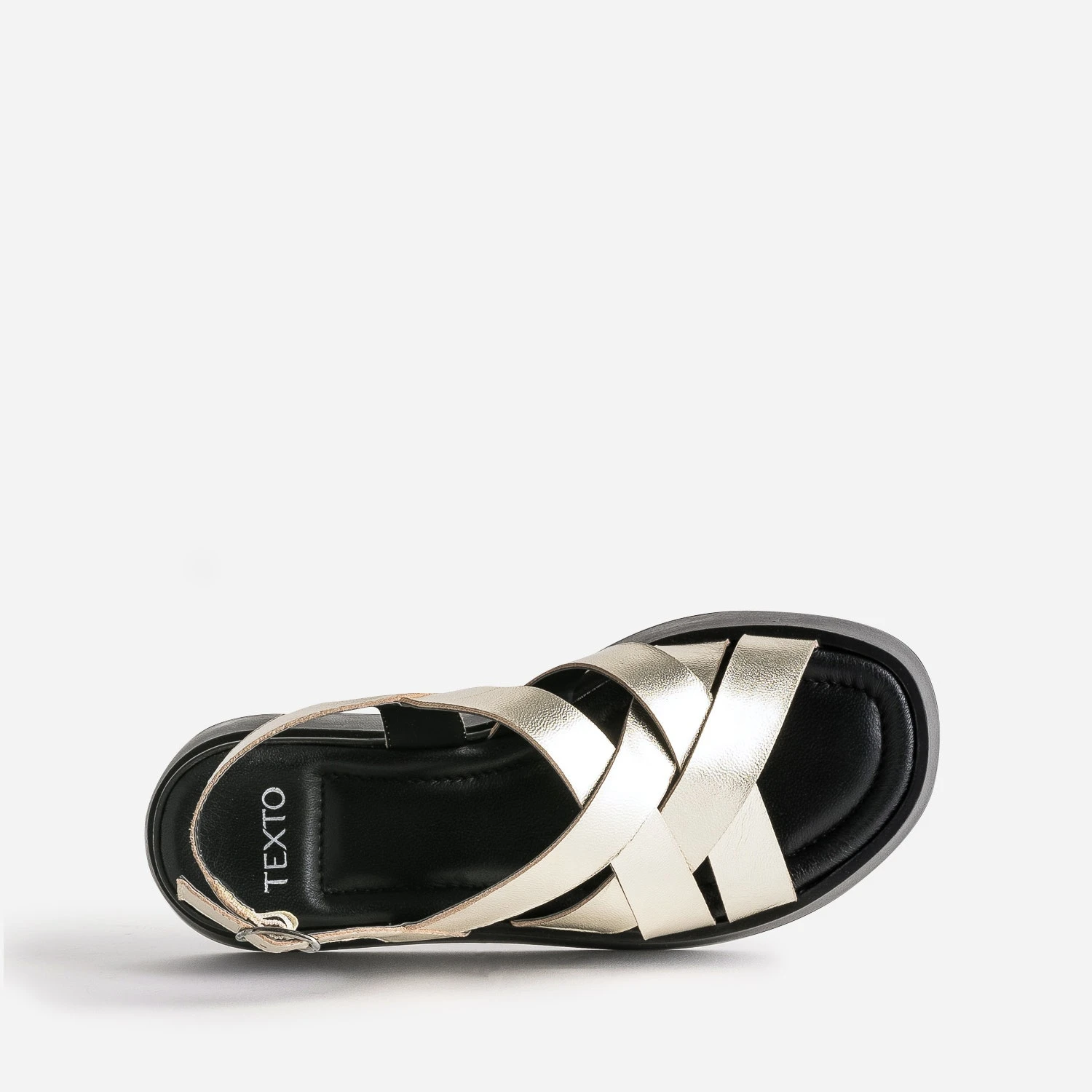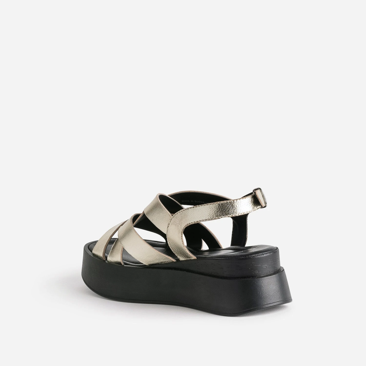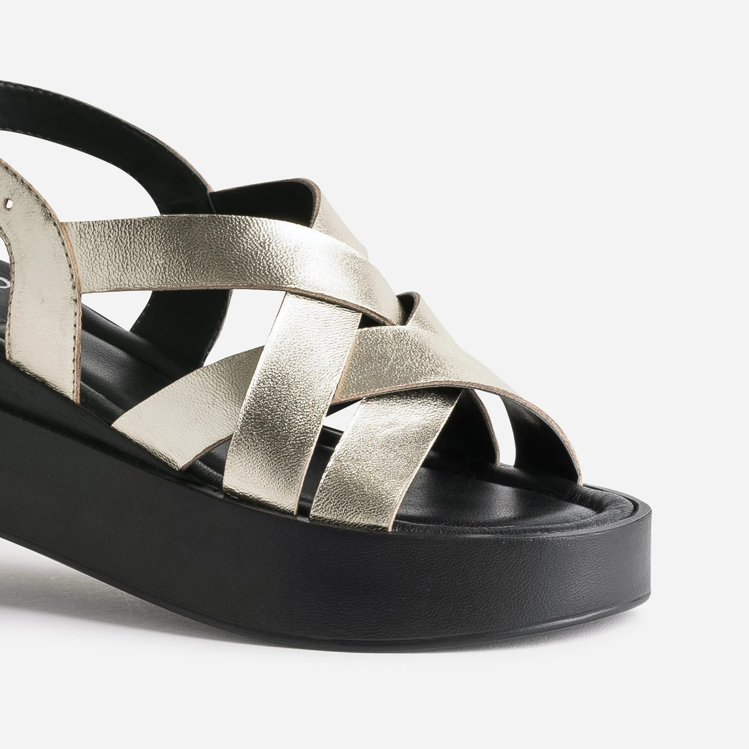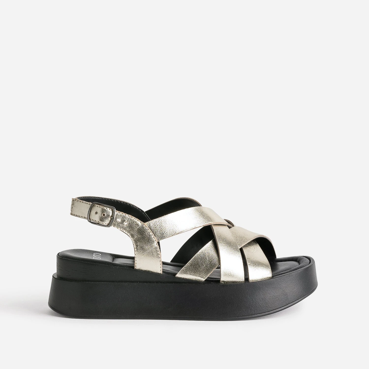Brides croisées en cuir doré sur maxi semelle noire compensée : cette sandale pour femme s’annonce comme une pépite de la saison. Préférez-la avec un look s’autorisant des pièces à volume : sweat, top loose, pantalon large.