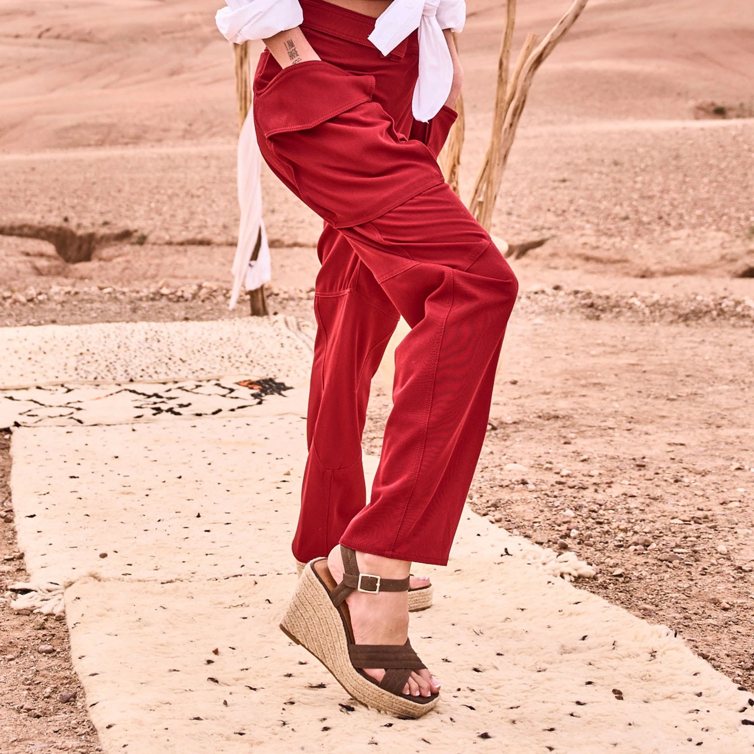 10 cm à l’arrière, 3 cm à l’avant. Cette sandale compensée est un essentiel du shoesing d’été. En textile suédé, elle opte pour un coloris kaki, tendance, un bout carré, moderne, et une semelle en corde, bohème. Un modèle à porter avec robes et combinaisons-pantalons unies ou imprimées.