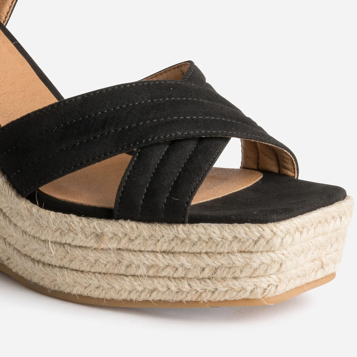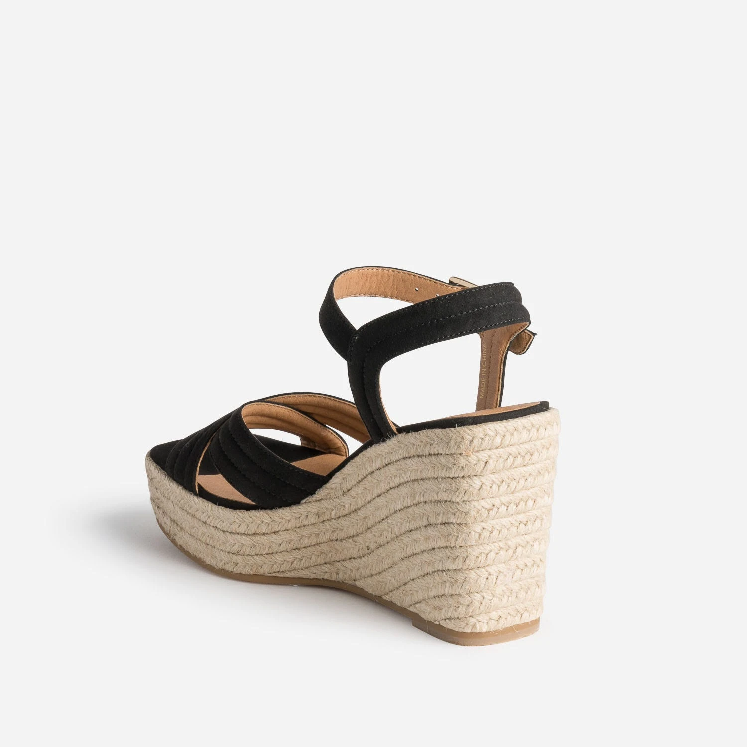 10 cm à l’arrière, 3 cm à l’avant. Cette sandale compensée est un essentiel du shoesing d’été. En textile suédé, elle opte pour un coloris noir, neutre, un bout carré, moderne, et une semelle en corde, bohème. Un modèle à porter avec robes et combinaisons-pantalons unies ou imprimées.