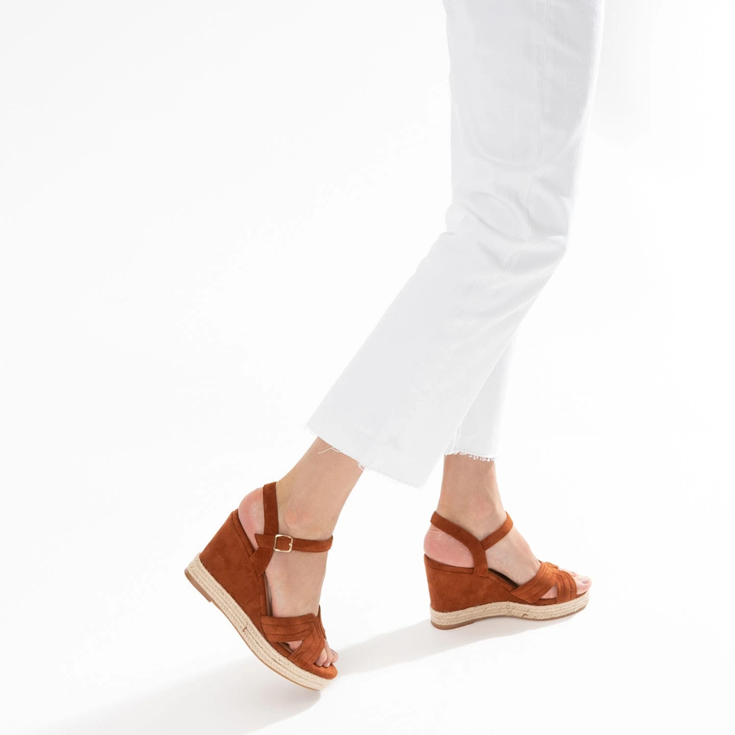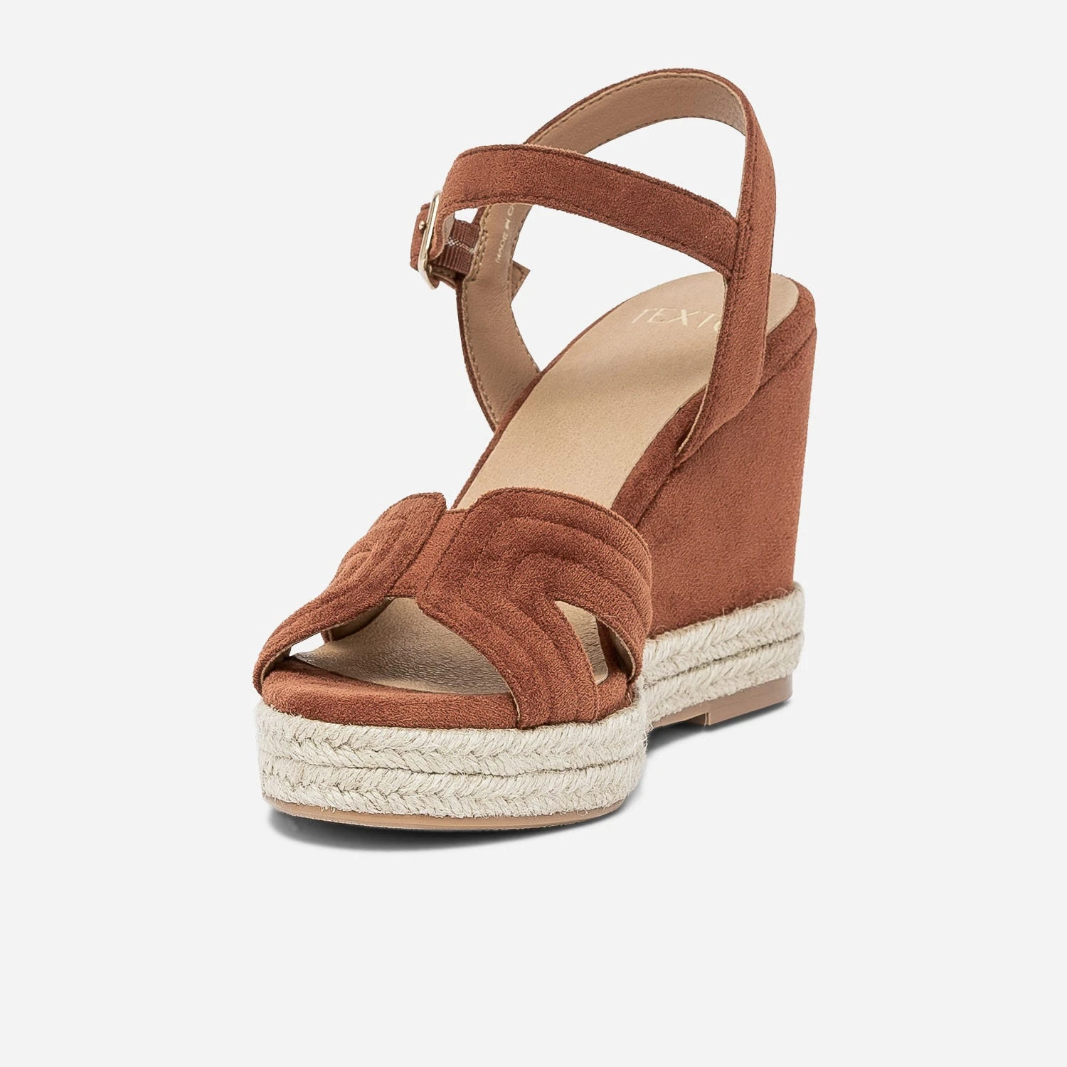 Et si vous changiez ? Et si vous profitiez de l’été pour infuser, dans vos looks, un coloris épicé ? C’est l’idée de cette sandale compensée pour femme. En textile suédé, elle séduit par une large bride fantaisie, en soutien de la bride cheville, pour maintenir le pied. Le talon bi matière, de 10 cm à l’arrière et 2,5 cm à l’avant, est souligné de corde naturelle, et permet une cambrure du pied optimale. Un modèle à associer avec des teintes chaudes, comme le jaune safran ou le camel, et à essayer avec du beige ou du kaki.