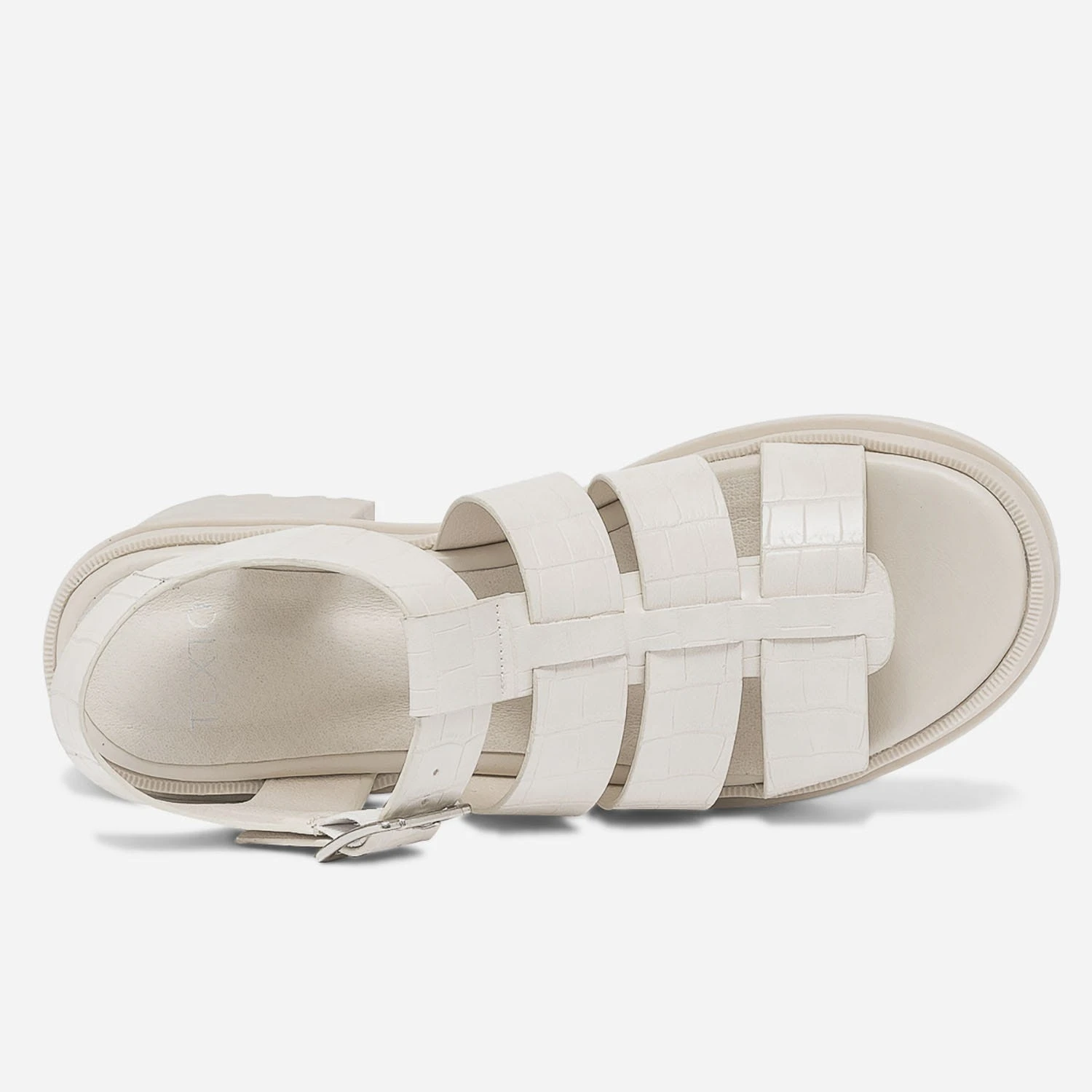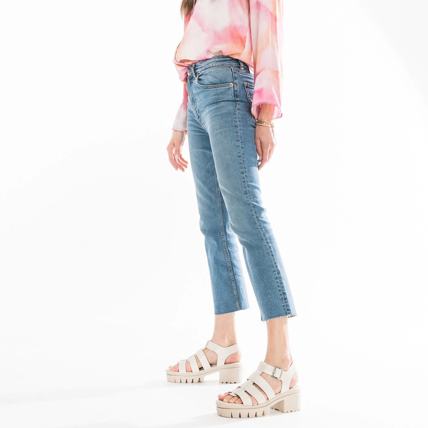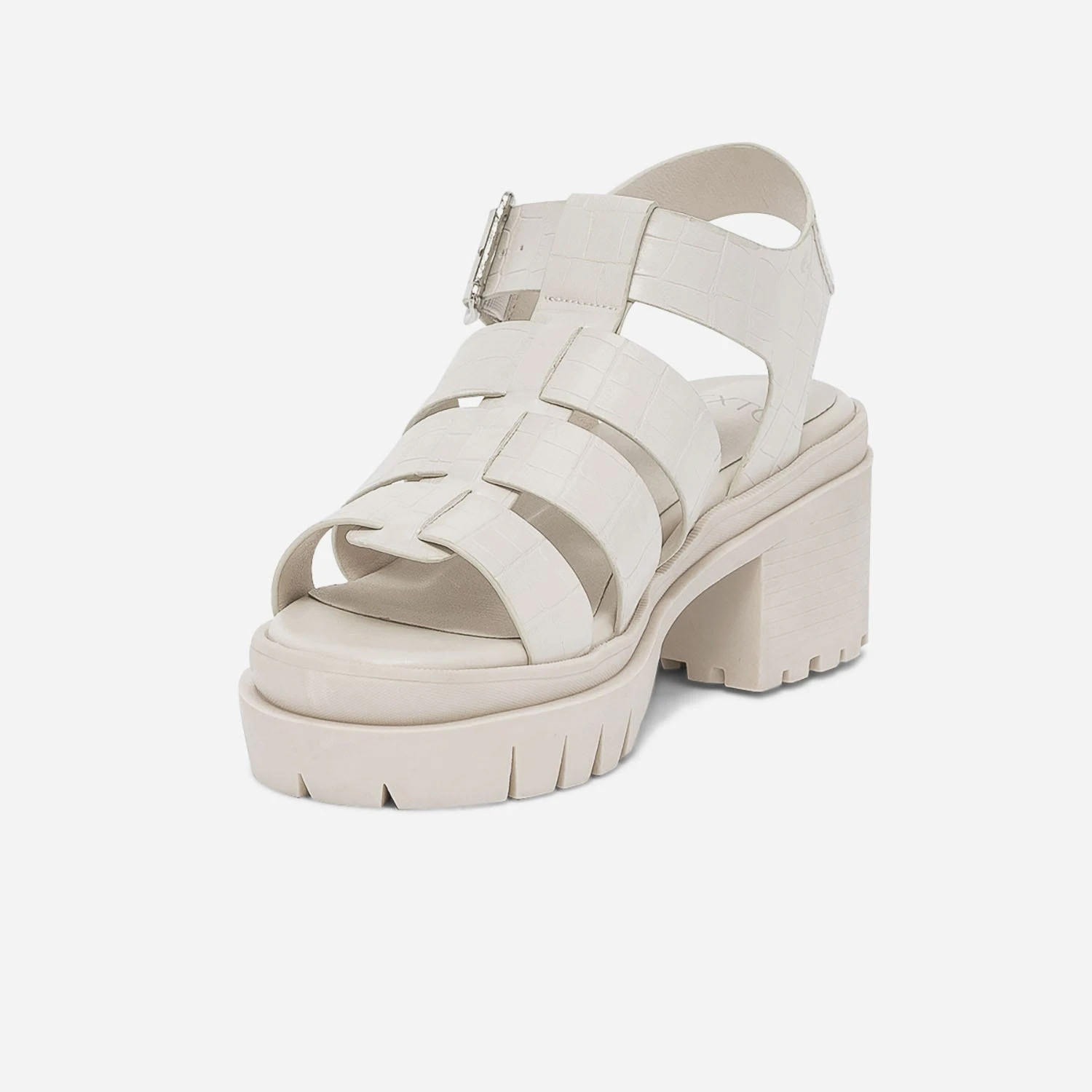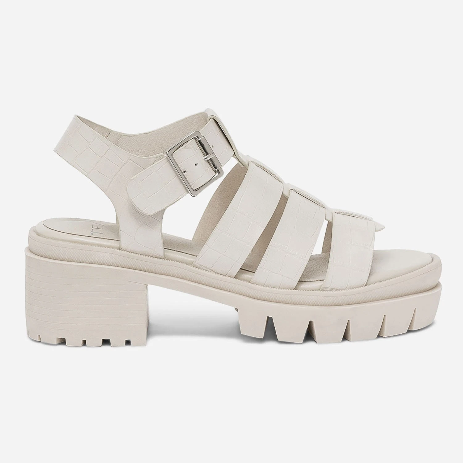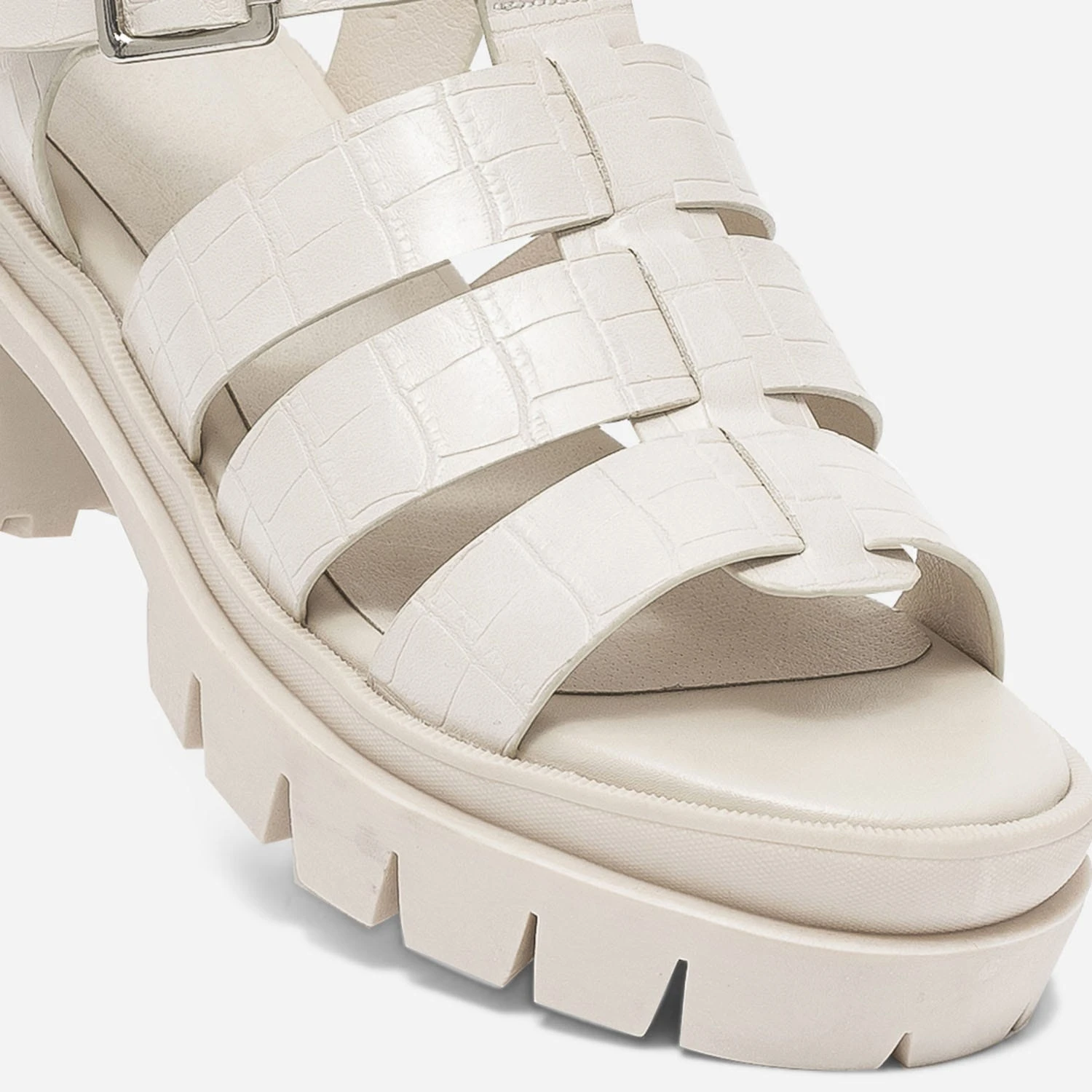 La sandale se réinvente. Les modèles plus imposants ont définitivement la cote cette saison. En matière synthétique écrue, la sandale femme se pare d’un embossage effet croco sur ses larges brides et se ferme par une boucle carrée en métal argenté. Montée sur une semelle épaisse et crantée, elle affirme un style décontracté inspiré du streetwear. Un modèle à jouer avec des vêtements fluides, comme un cropped top et un pantalon large.