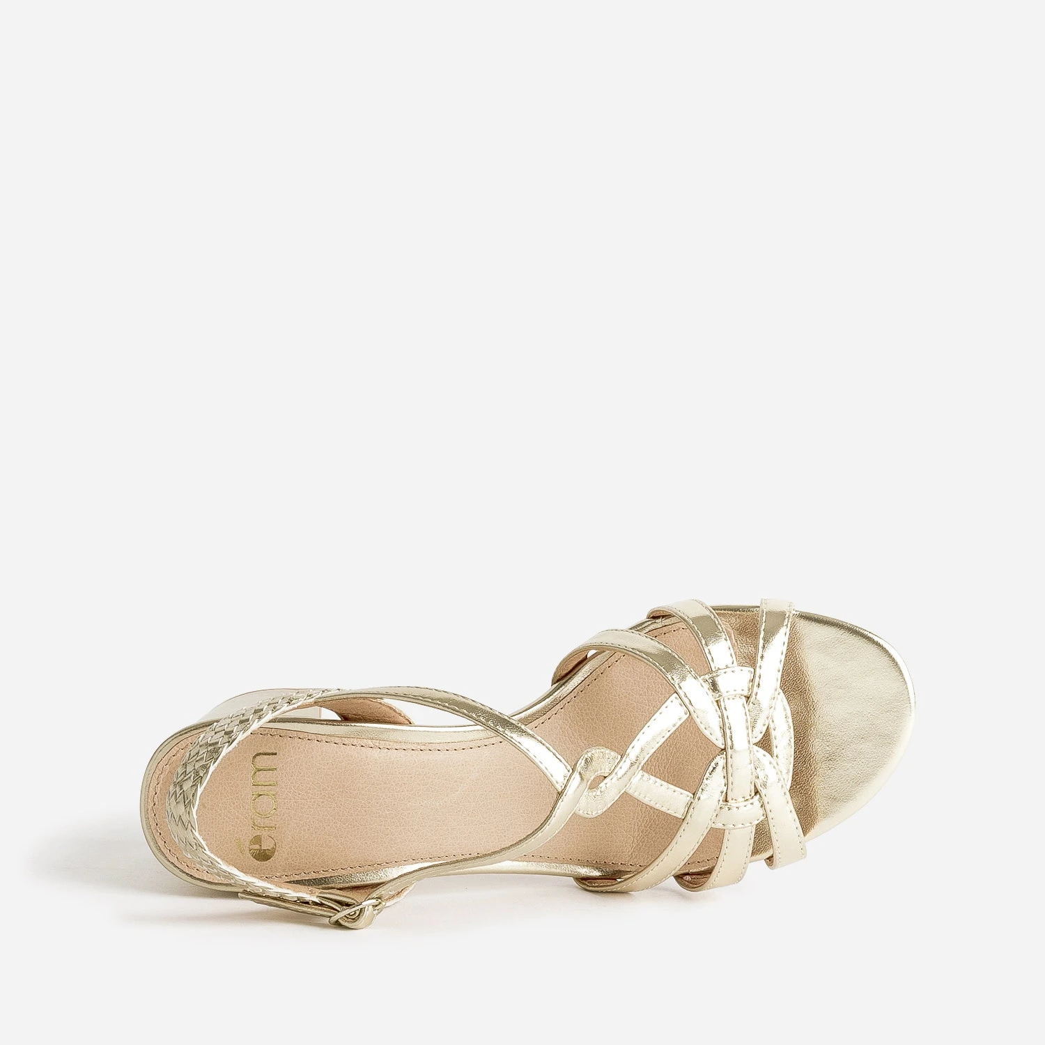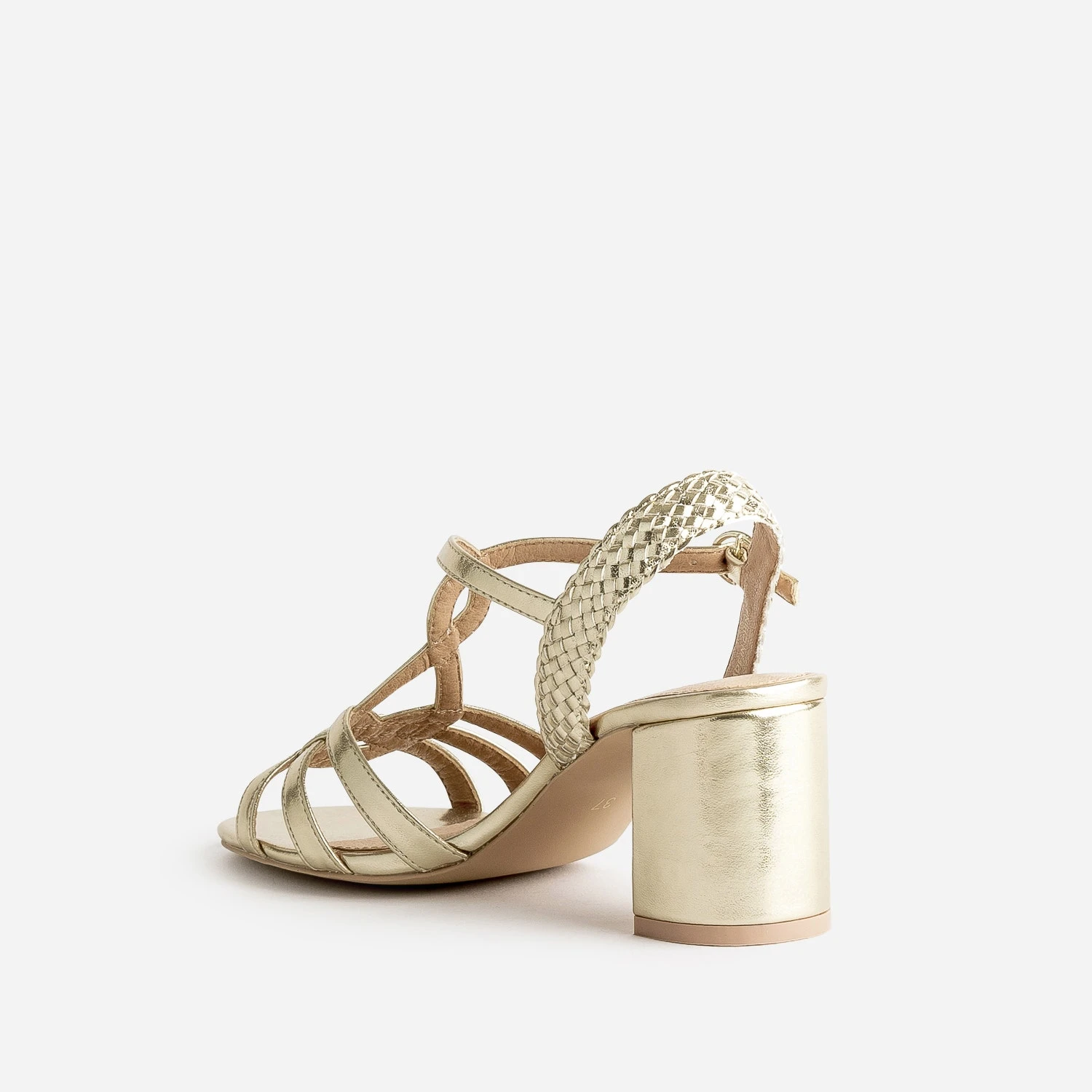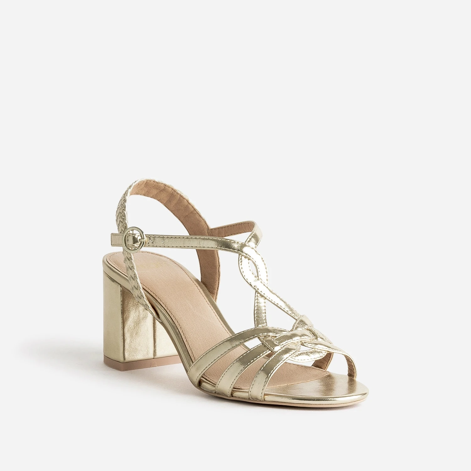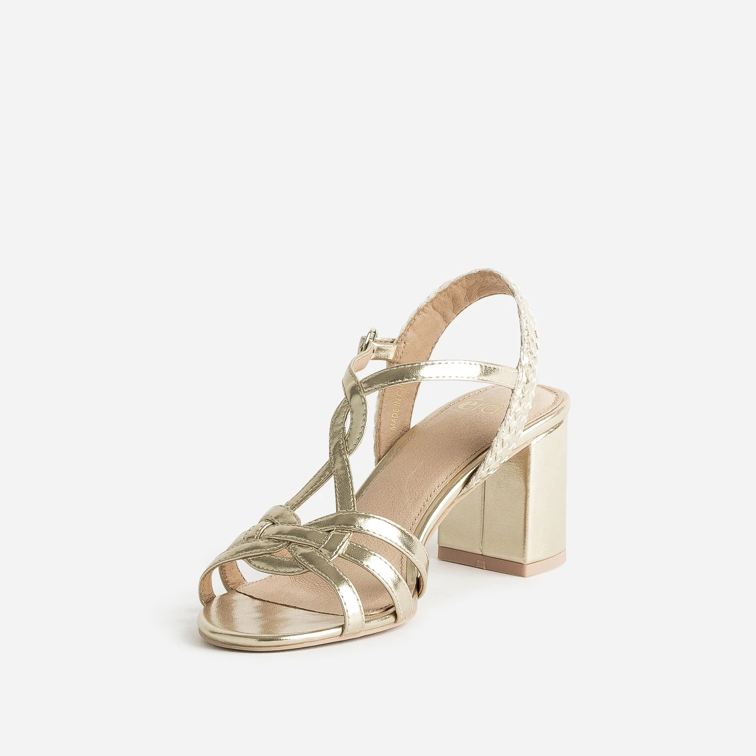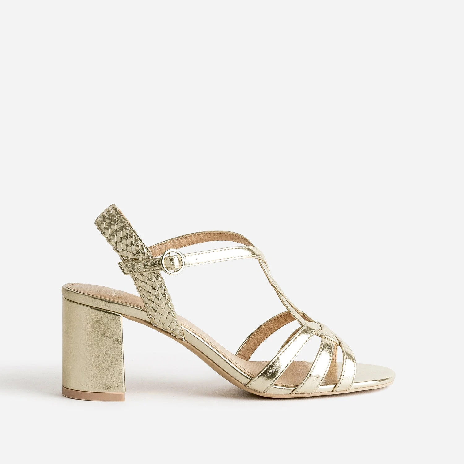 Une sandale dorée, et c’est toute la tenue qui gagne en chic. Entrelacs et tressage sur les brides, talon large de 7 cm, elle affine le pied et allonge n’importe quelle silhouette. Un modèle idéal avec une tenue de cérémonie, ou au quotidien, avec une blouse et un jean droit un peu court.