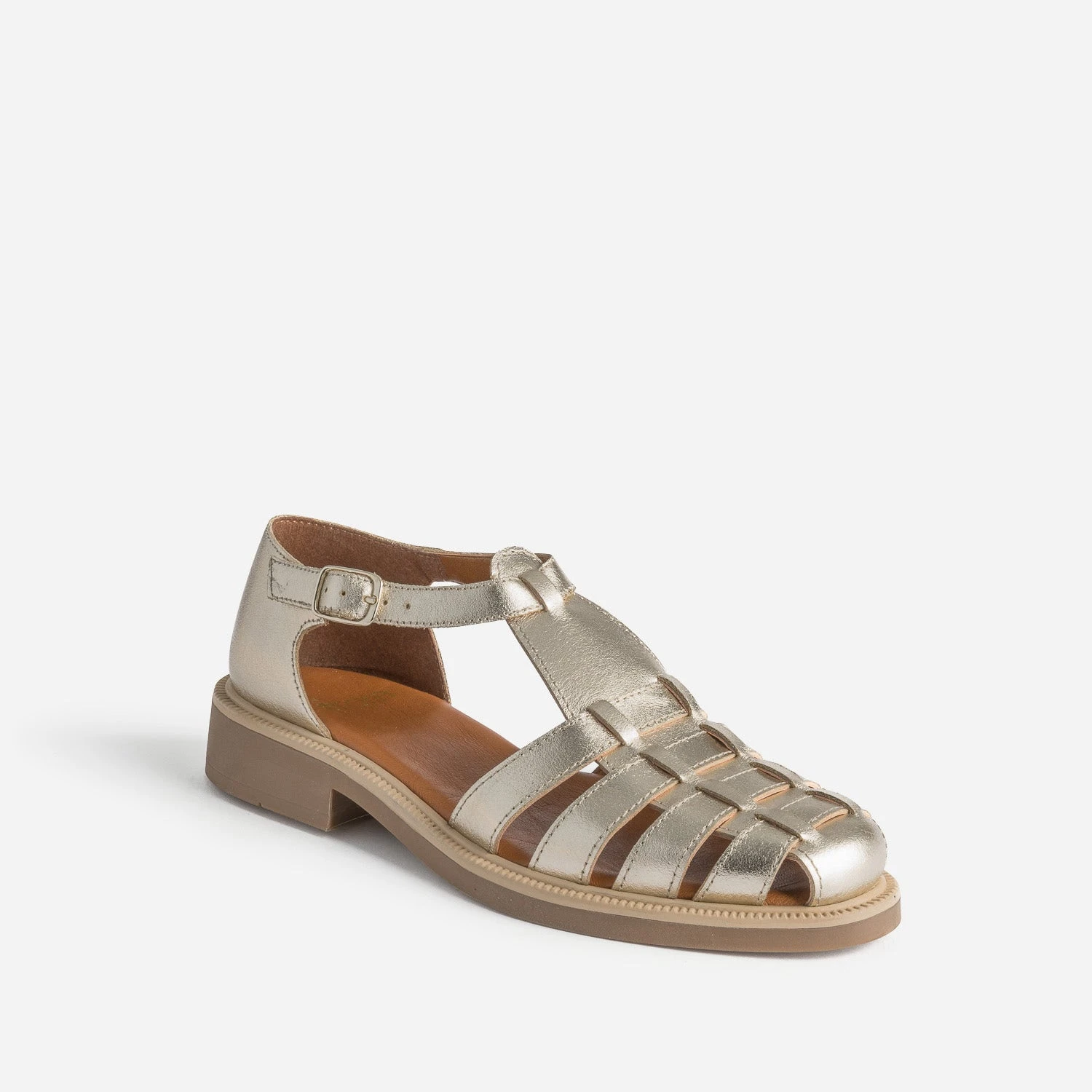Pas vraiment ouverte, ni complètement fermée, cette sandale femme est un modèle intemporel, idéal dès la mi-saison. En cuir lisse doré, elle se caractérise par un jeu de brides multiples, tressées sur le dessus du pied, un contrefort rigide et une bride à la cheville. Plate, elle se porte aussi bien avec une robe qu’avec un pantalon.