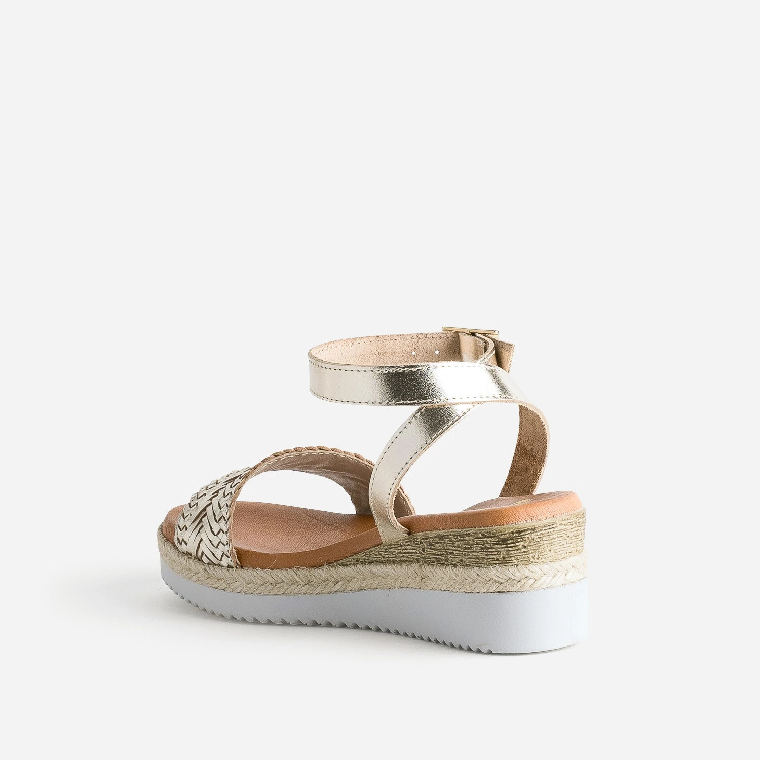 Compensée juste ce qu’il faut, la sandale femme est un essentiel du shoesing estival. En cuir non doublé, elle séduit instantanément quand vous y déposez votre pied. Son secret ? Une première en cuir moussée, pour un confort absolu, et deux brides, une tressée et une lisse, pour maintenir le pied. La semelle blanche esprit sport est rehaussée d’une tresse en corde esprit bohème, dans un mix de tendances parfaitement maîtrisé. Déclinée en coloris or, elle matche facilement avec les couleurs de la saison.