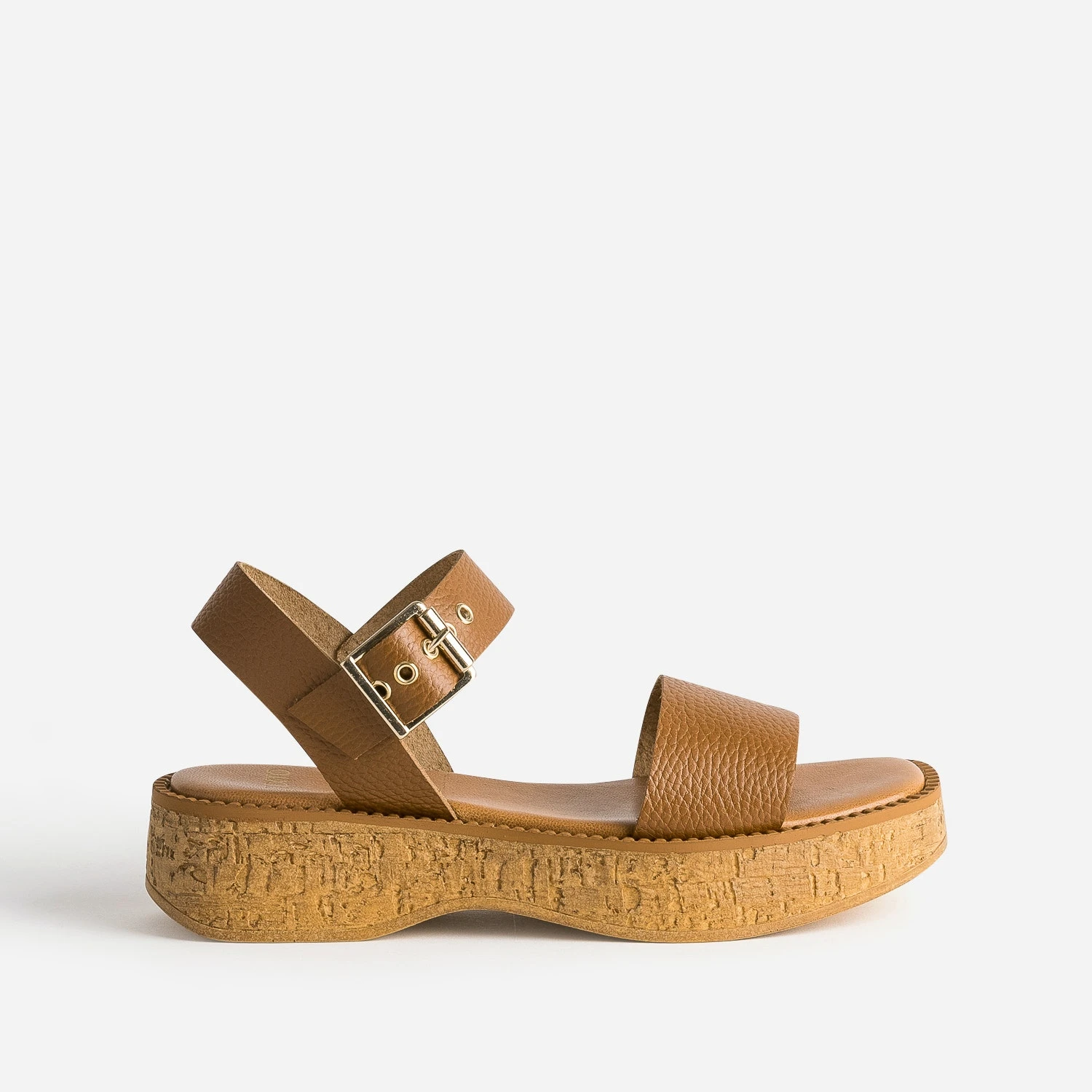 Gage de chic, la silhouette monochrome s’imagine dans des déclinaisons de beiges, uniquement. La sandale pour femme ne déroge pas à la règle. En cuir grainé marron, qui n’est autre qu’un beige très foncé, elle est montée sur un talon compensé imitation liège, en ton sur ton. La bride cheville s’ajuste par une boucle carrée en métal doré. Chemise en lin écrue, pantalon en lin beige, panier en raphia sont ses meilleurs alliés.