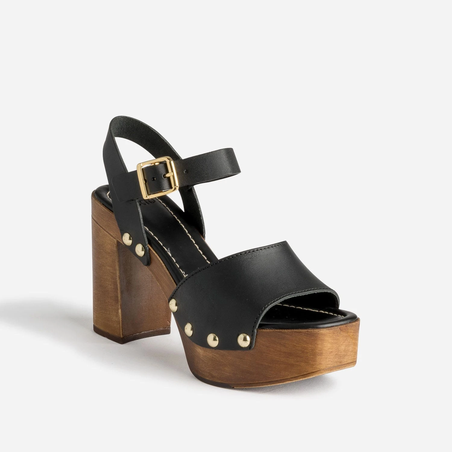 10,5 cm de talon à l’arrière. 3,5 cm de patin à l’avant. Cette sandale pour femme adopte toute l’audace des seventies, par une semelle imitation bois foncé. En cuir noir, la large bride à l’avant et la bride cheville sont maintenues par des clous en métal doré sur les côtés. Allongez encore votre silhouette, avec un top fluide à lavallière, un pantalon flare et une belle capeline.