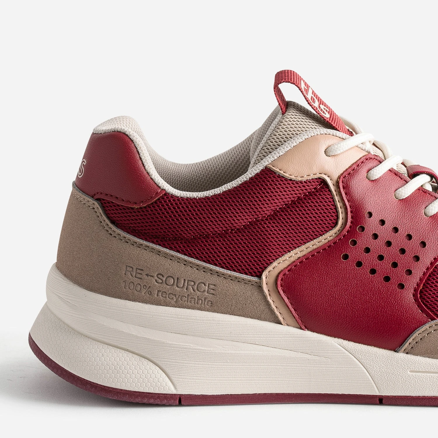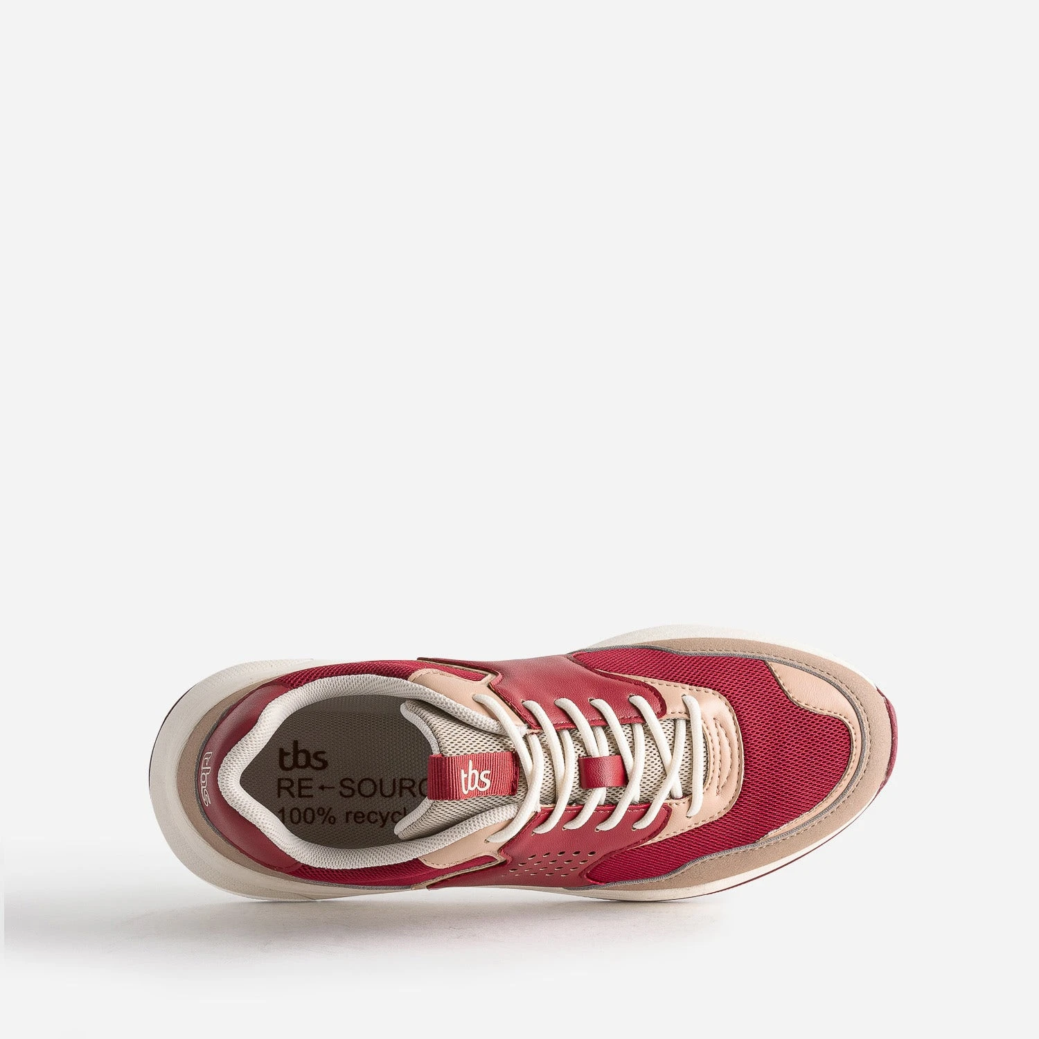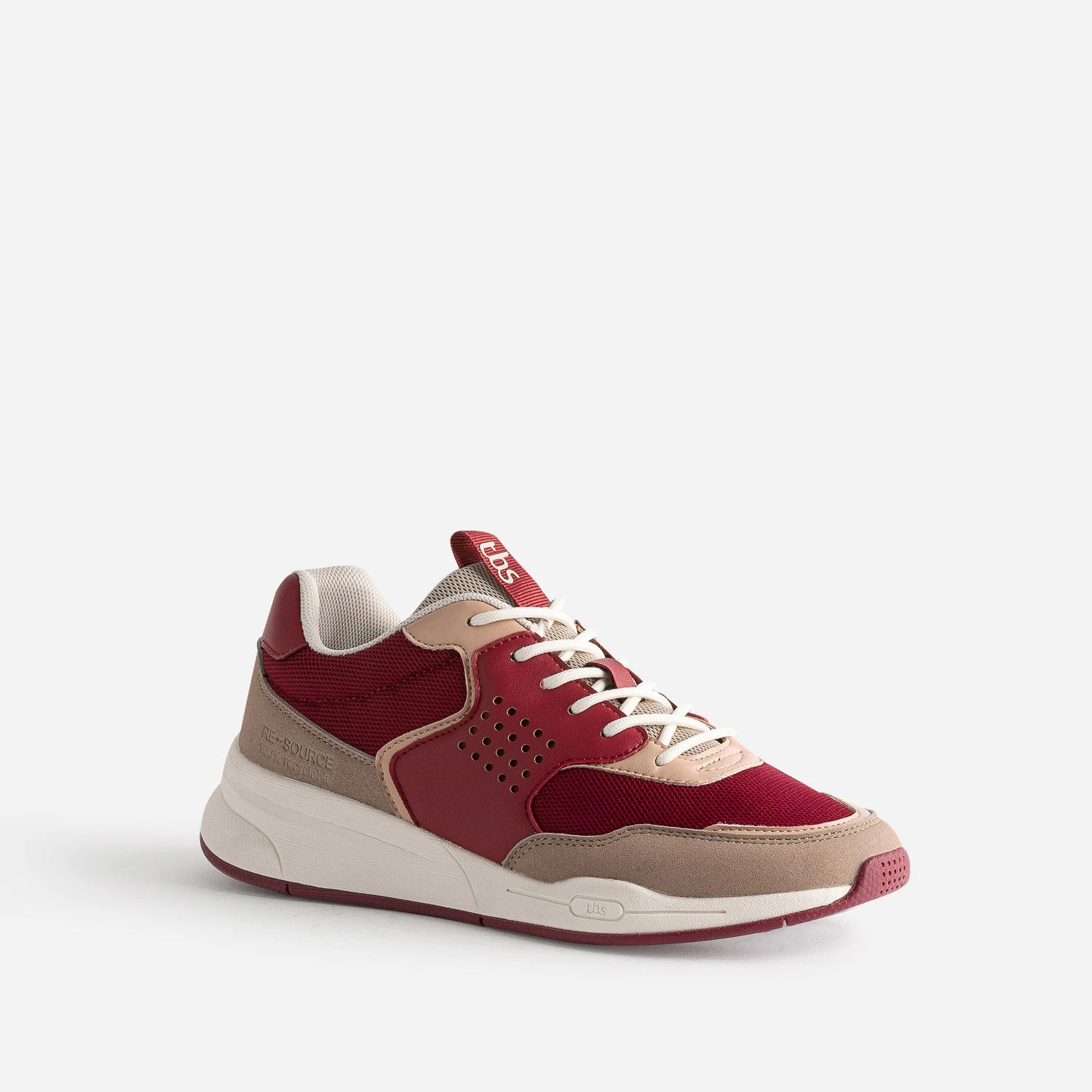Soucieux de répondre aux problématiques de recyclage, TBS a imaginé une basket engagée & responsable, à chaque étape de sa conception : RESOURCE, la première chaussure 100% recyclable. Les nuances de rouges, rouge foncé, rose et beige foncé, s’harmonisent sur cette tennis pour femme, par un jeu de matières vegan judicieux. Elle se ferme par un lacet contrasté.