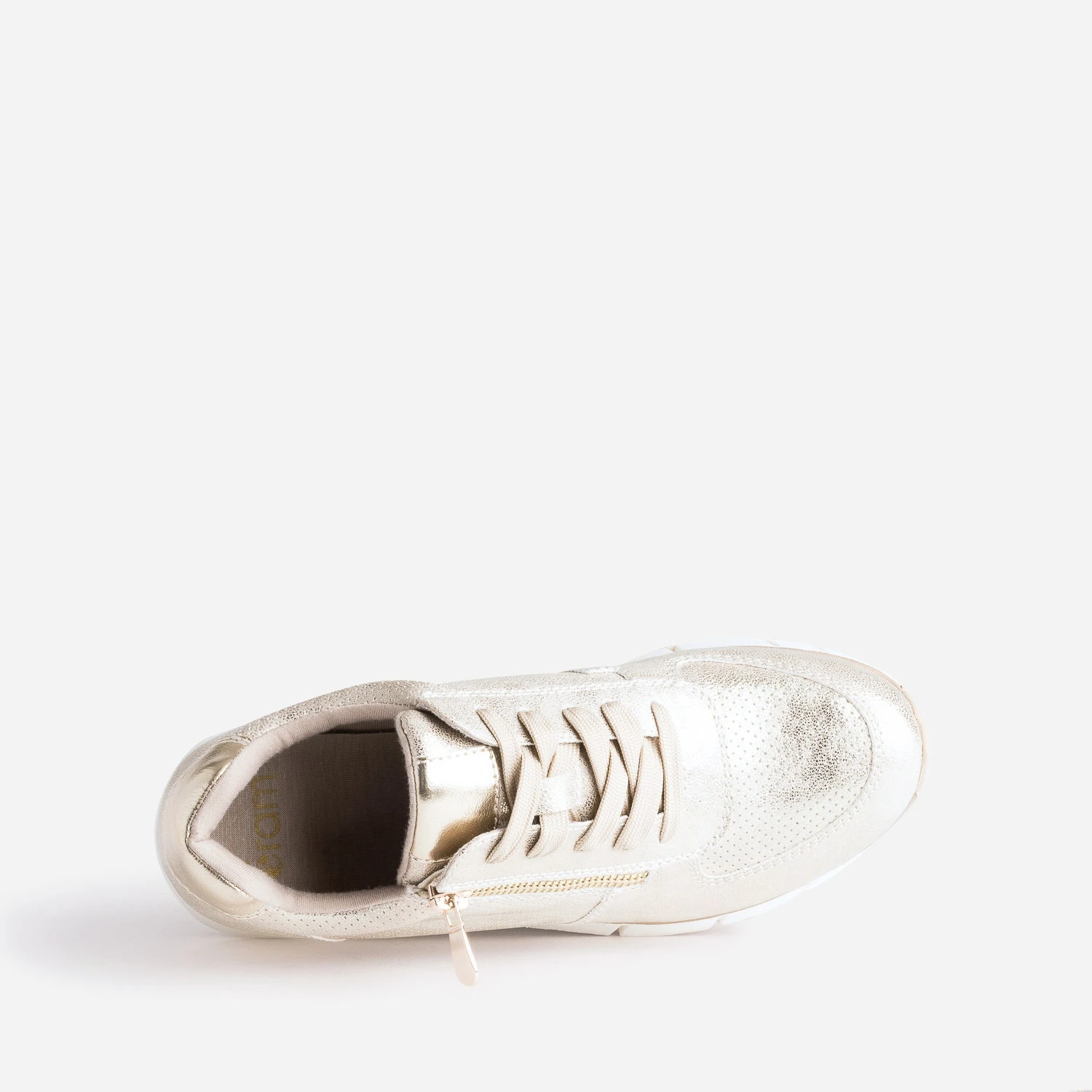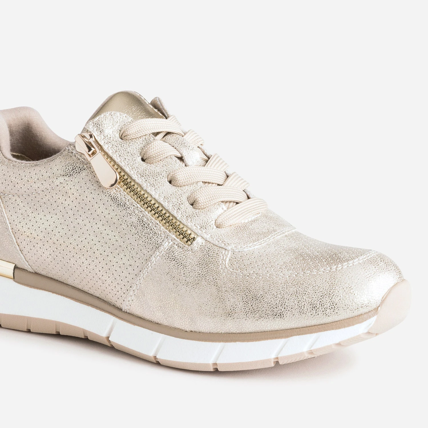 La tennis n’est désormais plus réservée au cours de sport. En textile suédé, elle s’offre un coloris beige et une finition dorée. Le dessus et les côtés sont marqués de perforations, alors que la languette et le contrefort sont rehaussés de matière synthétique lisse or, en écho à la barrette qui souligne le talon. Un modèle très féminin, à porter en toutes occasions.
