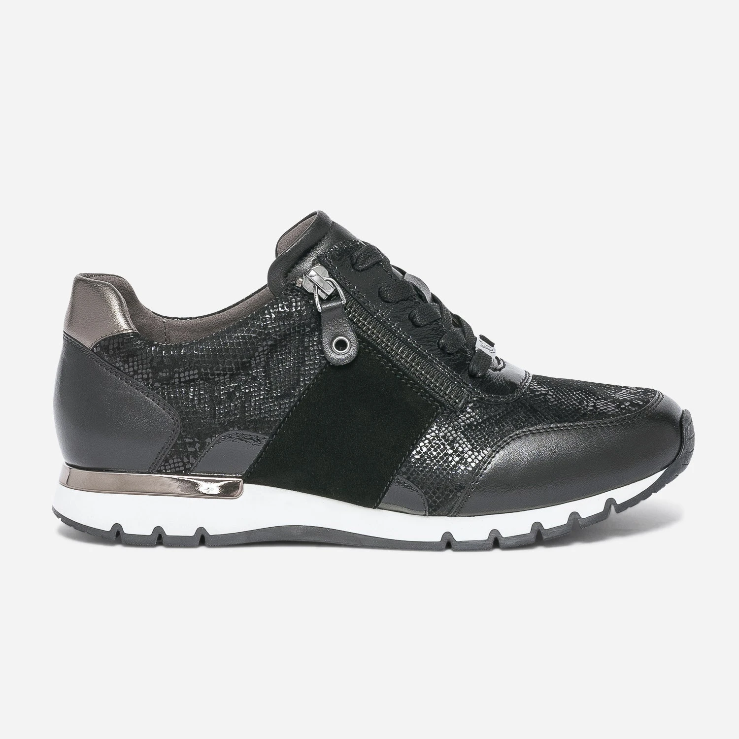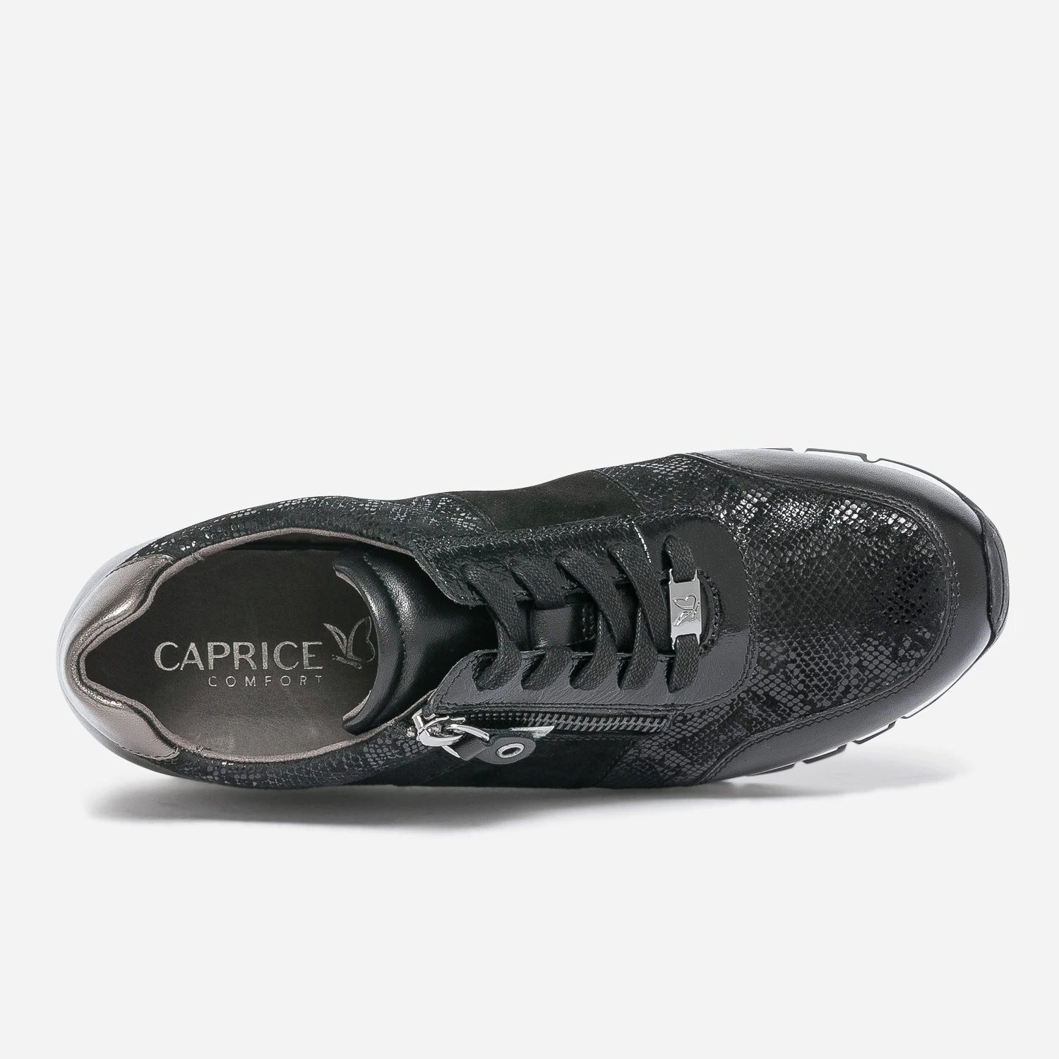 Spécialiste du bien-être, la marque CAPRICE propose des chaussures au confort incomparable. Vous aimez marcher ? Essayez cette nouvelle sneakers basse pour femme. D’abord pour sa doublure synthétique et sa première en cuir qui bénéficie de la technologie ‘onAIR’, garantissant un meilleur amorti et une parfaite aération de la chaussure. Montée sur une semelle sport, crantée pour une adhérence optimale sur toutes les surfaces, elle séduit par ses associations de cuir noir, lisse et à imprimé effet python verni, ses empiècements suédés sur les côtés et son contrefort kaki métallisé. Un modèle fermé par lacet et zip latéral à privilégier avec une tenue casual.