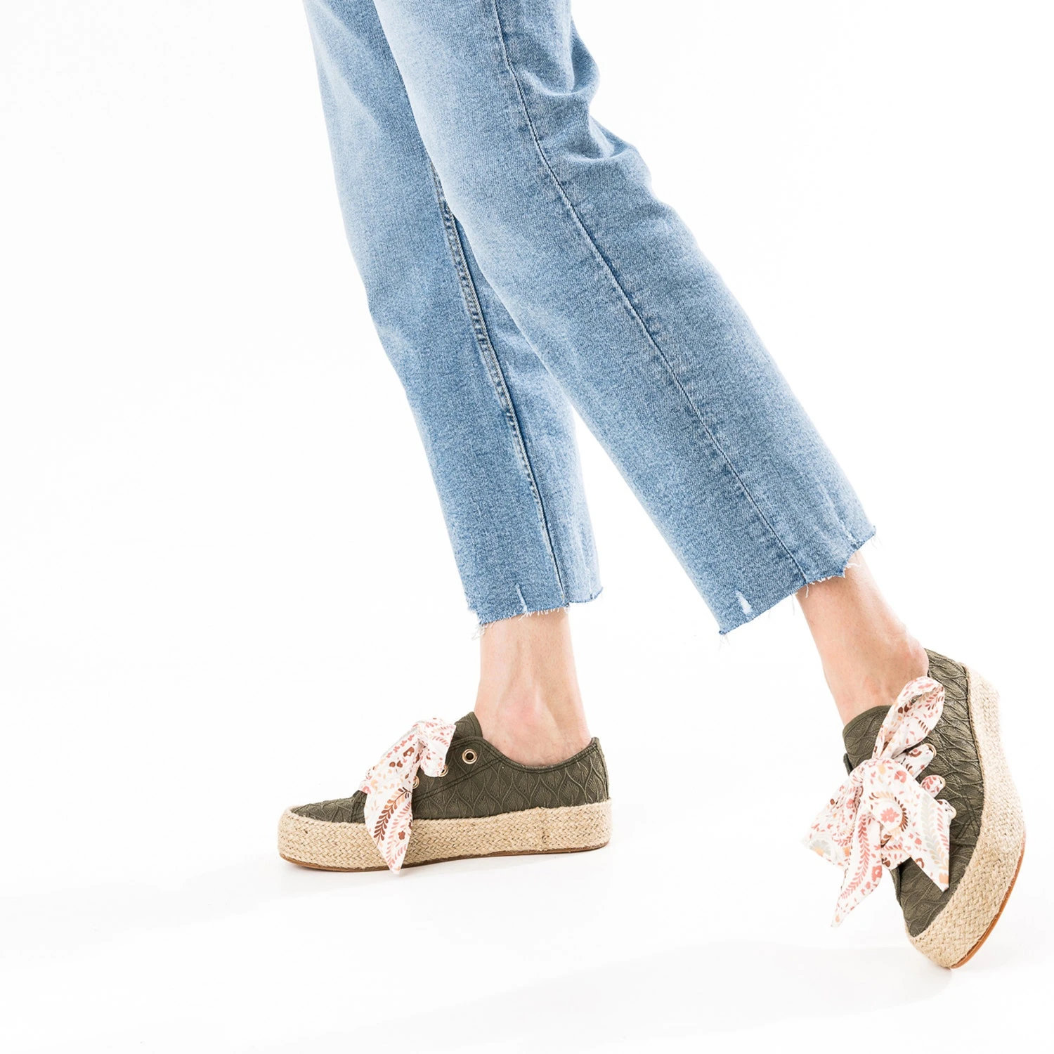 Mi-tennis, mi-espadrille, cette sneakers s’invite dans votre shoesing d’été. En textile kaki façon dentelle, elle est montée sur une semelle à plateforme de 3 cm recouverte de corde. Sa particularité : elle est livrée avec deux lacets, l’un ton sur ton, et l’autre imprimé fleuri, clin d’œil aux foulards vintage. Portez-la au quotidien avec un jean boyfriend de couleur et un sweat à message.