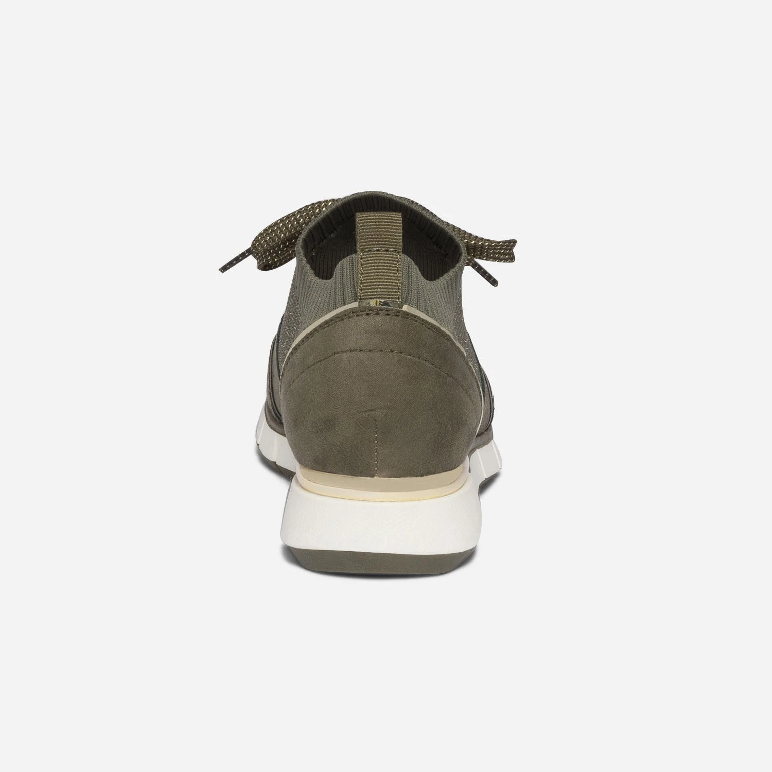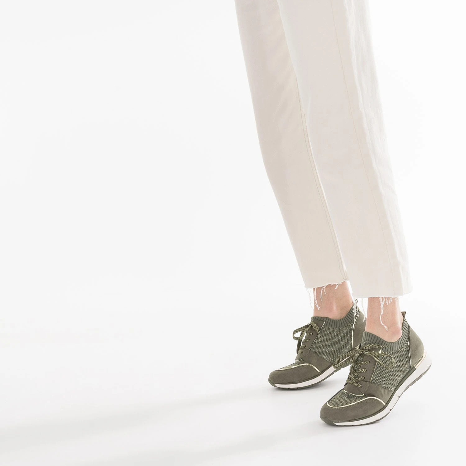 Allure urbaine et contemporaine pour cette tennis vert kaki. Majoritairement en textile tricoté, elle ne présente aucunes coutures et est finalisée par un bord-côte esprit chaussette pour un confort optimal. La semelle sport est décorée d’une baguette en métal doré, à l’arrière du pied. Un modèle à choisir pour un look minimaliste à tendance graphique, avec un sweat blanc à message et un pantalon large.