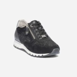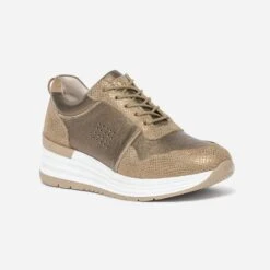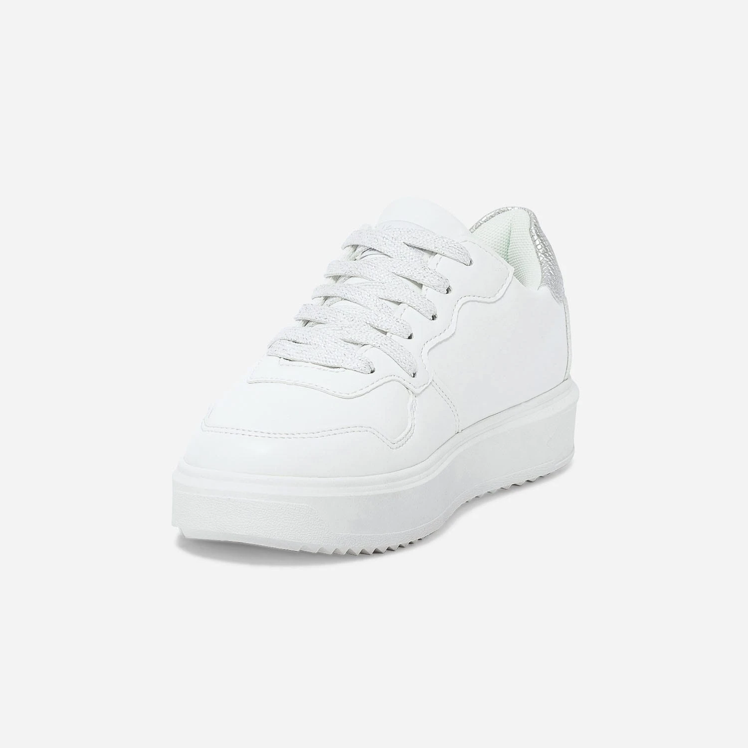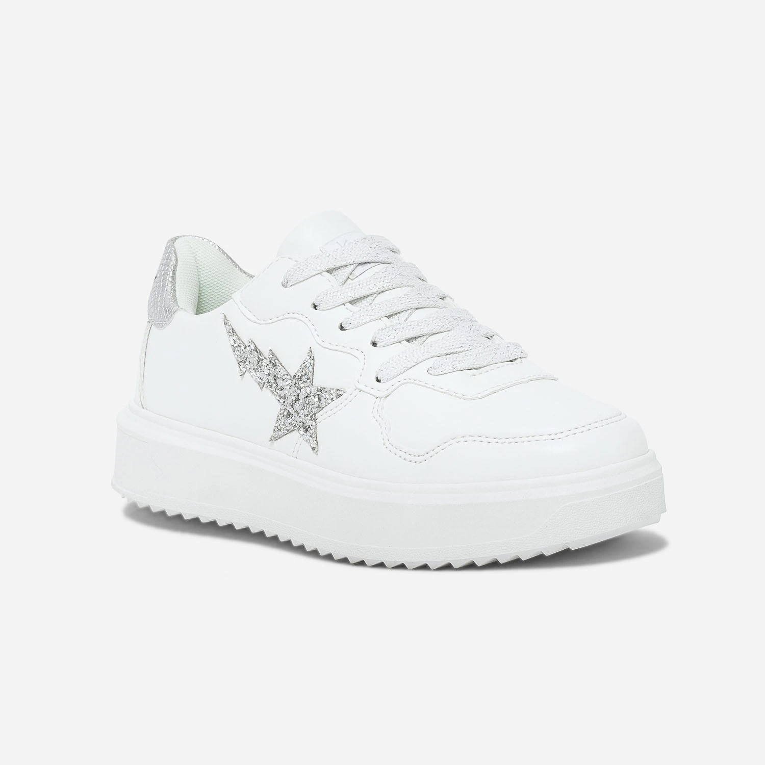 Dans la famille des tennis blanches, demandez ce modèle pour femme. En matière synthétique, elle marque son originalité par un badge étoile recouvert de paillettes argentées, en écho au contrefort embossé effet python. La semelle est légèrement compensée, pour moderniser l’allure. Un modèle dont vous ne pourrez bientôt plus passer.
