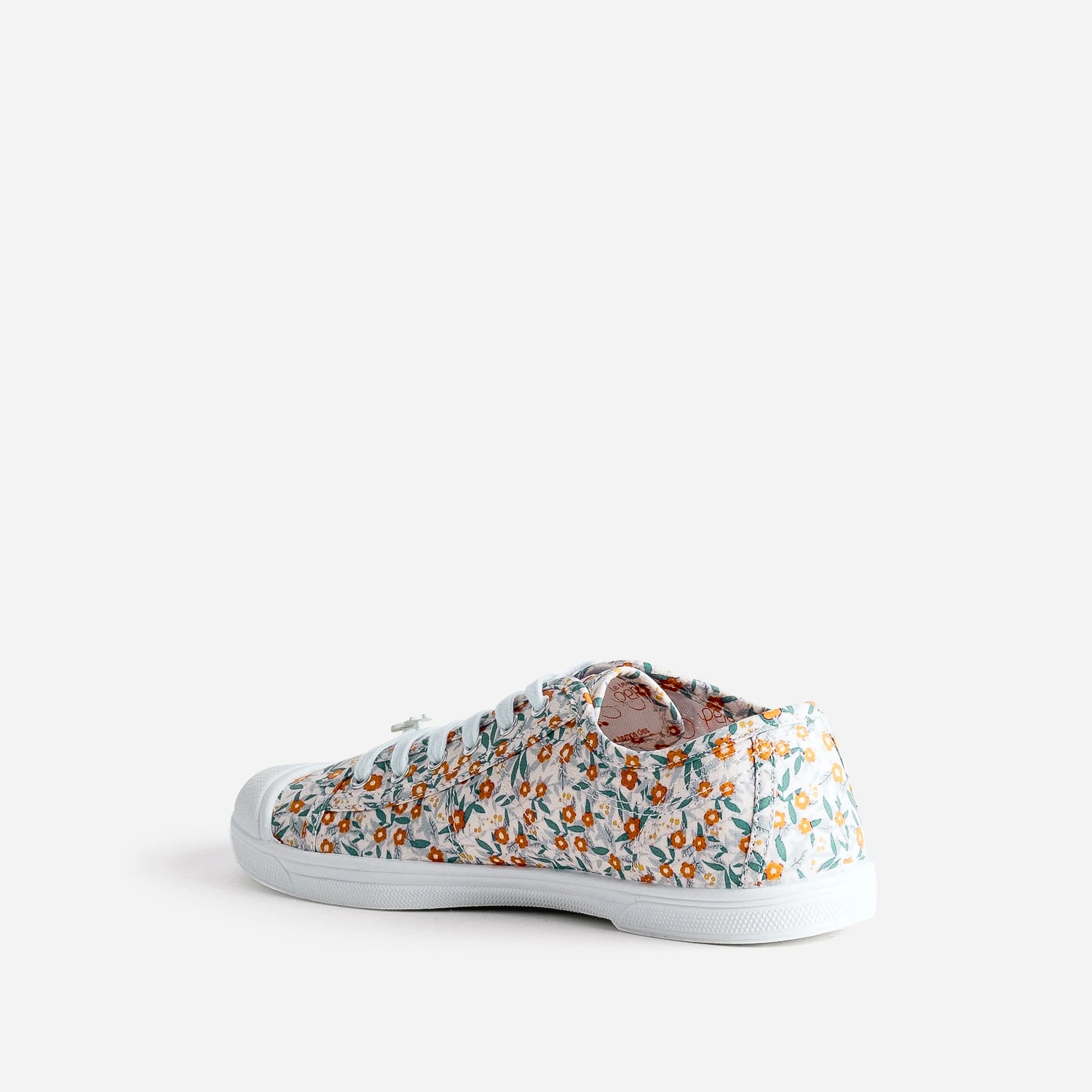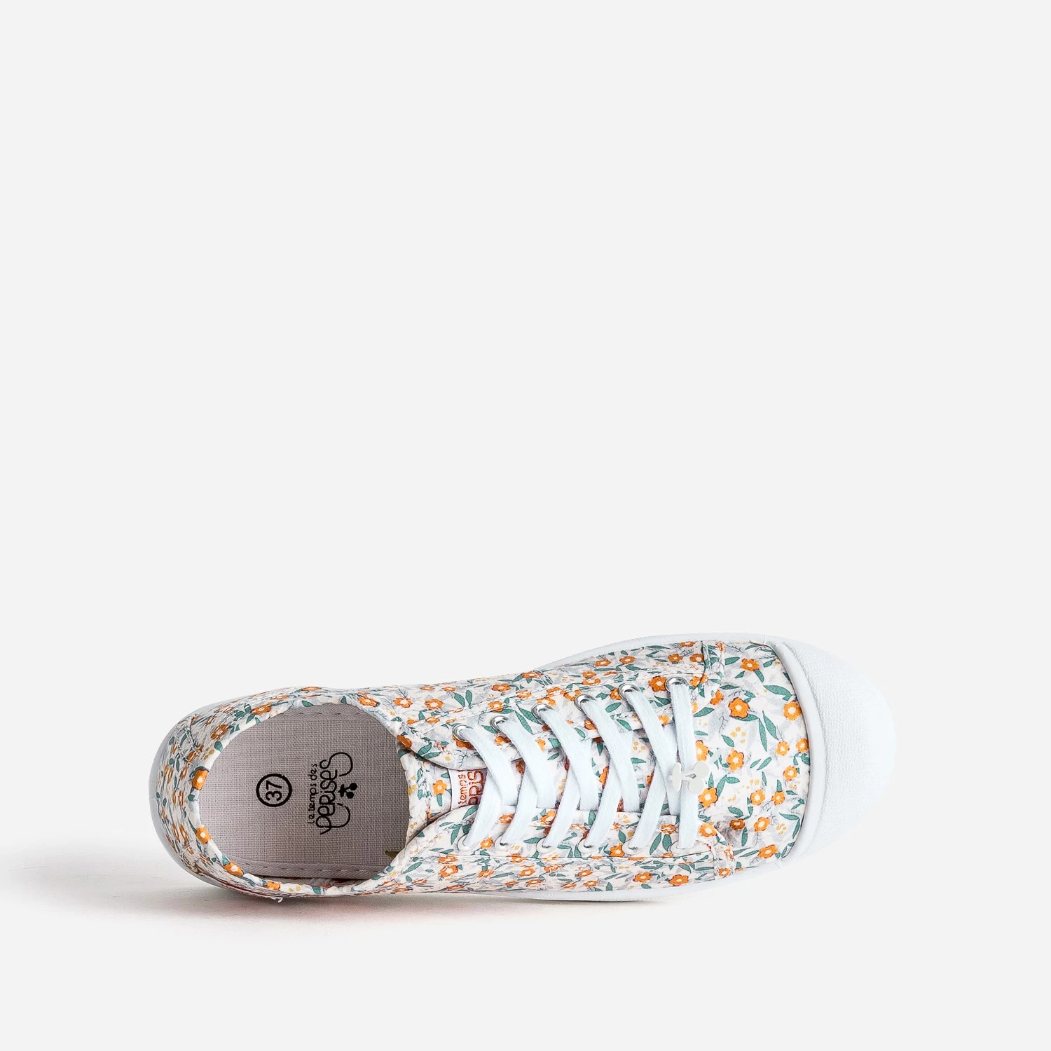 Cette tennis est un classique de la marque. En toile coloris beige clair, elle est rythmée de surpiqûres et d’un imprimé jardin avec feuillage vert et fleurs orange, et décorée d’un charm’ cerises en métal ton sur ton glissé sur le lacet. Languette et doublure intérieure accueillent un marquage noir, et le talon, une étiquette tissée avec le logo. Une basket basse pour femme, qui affirme sa différence.