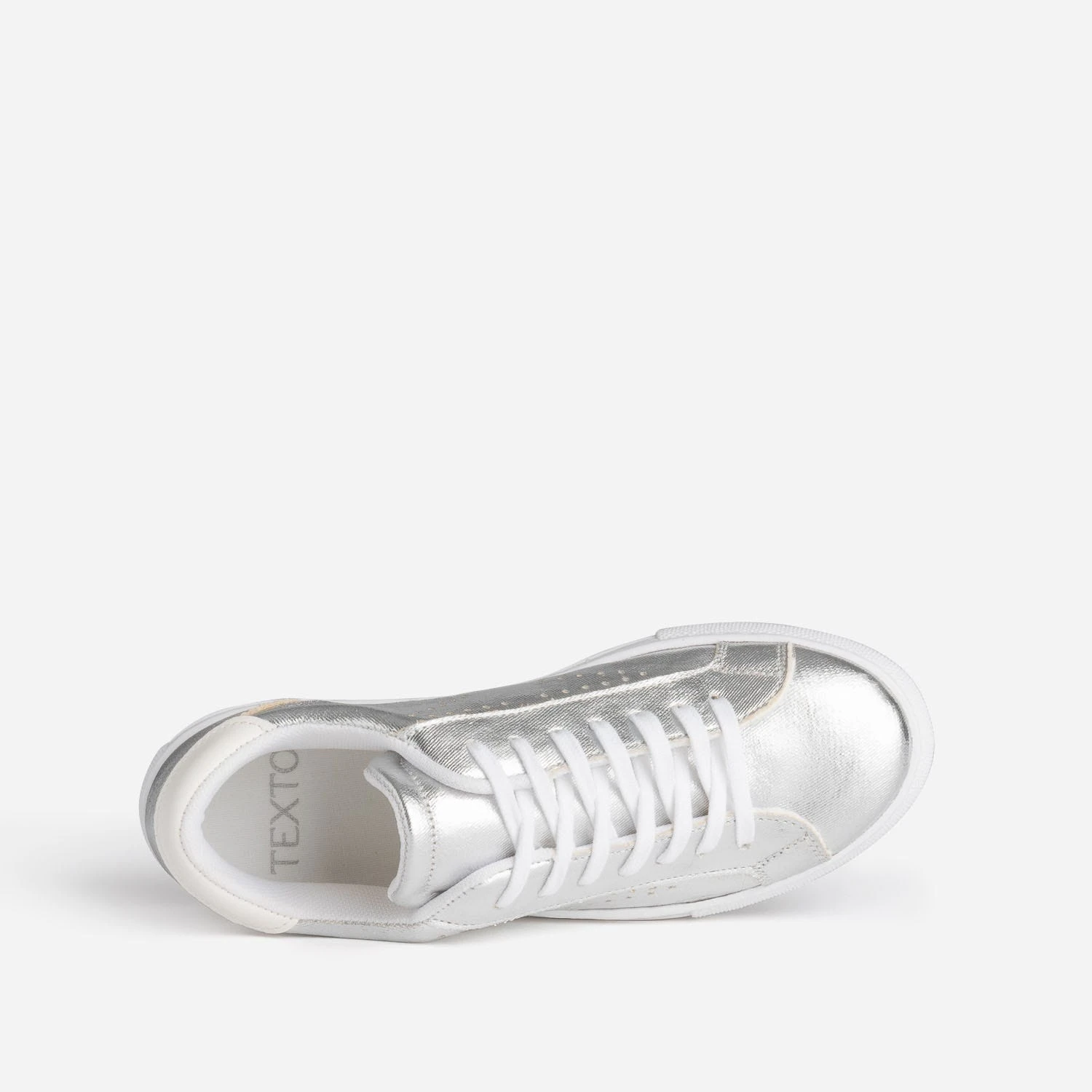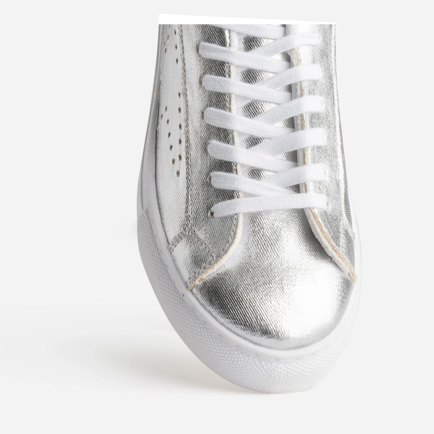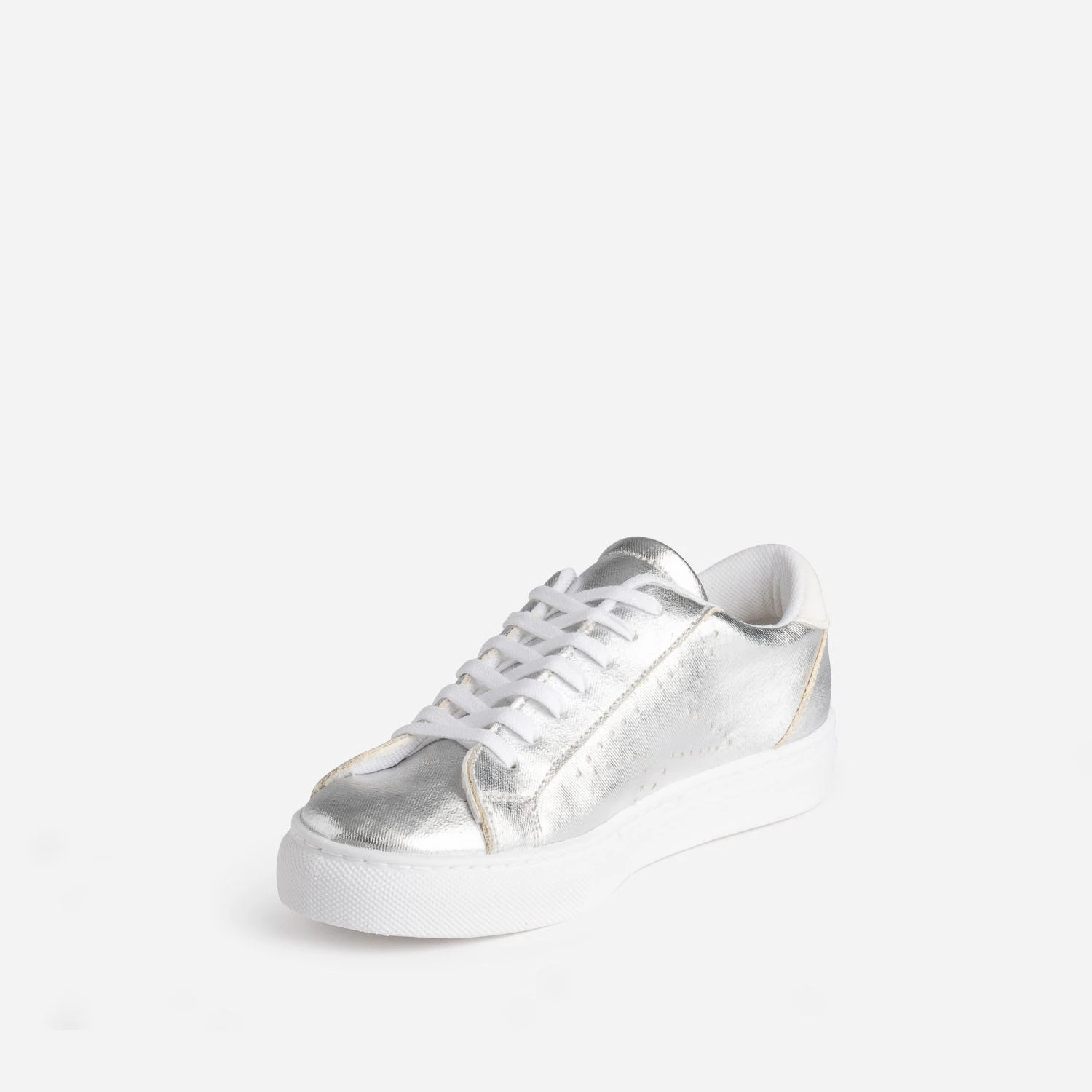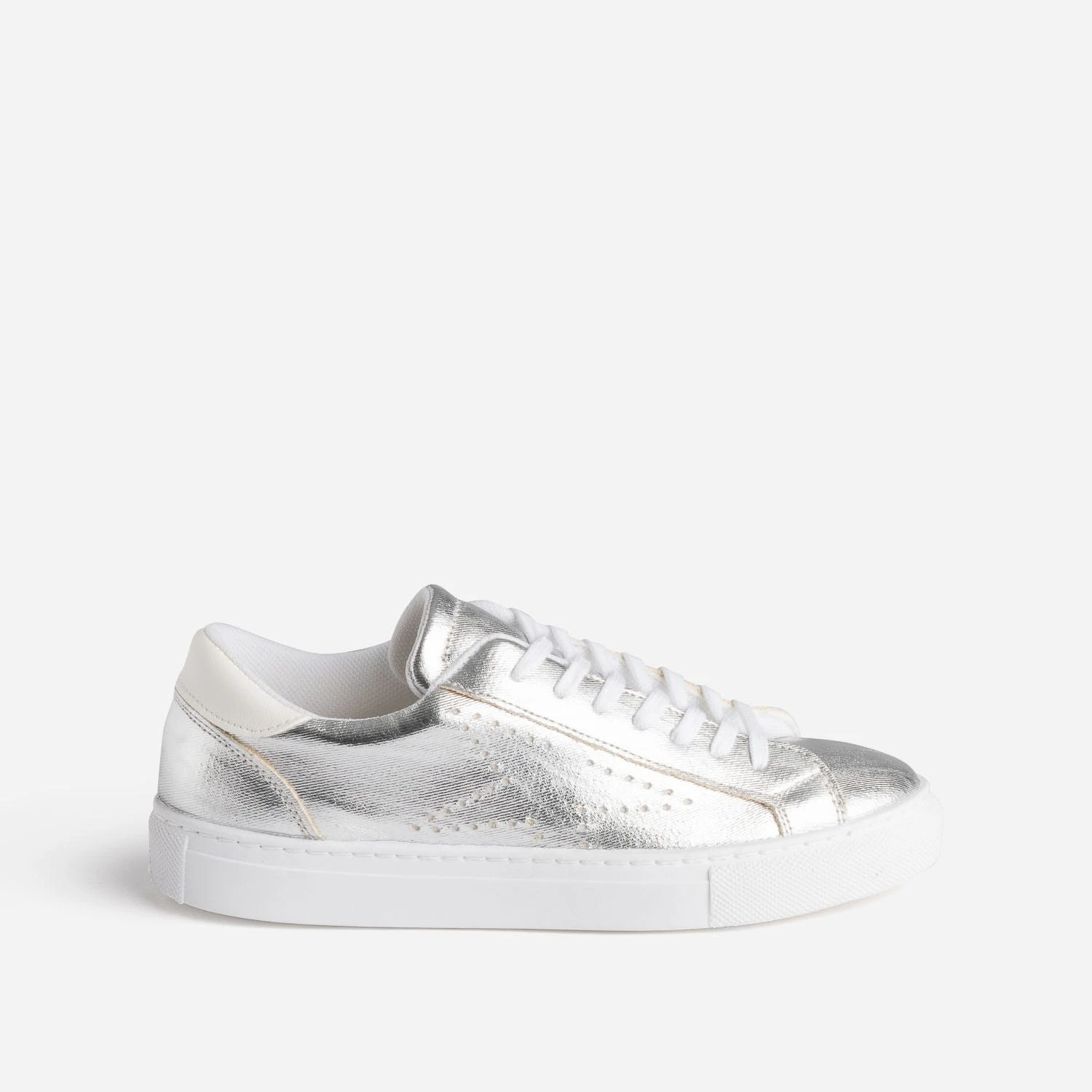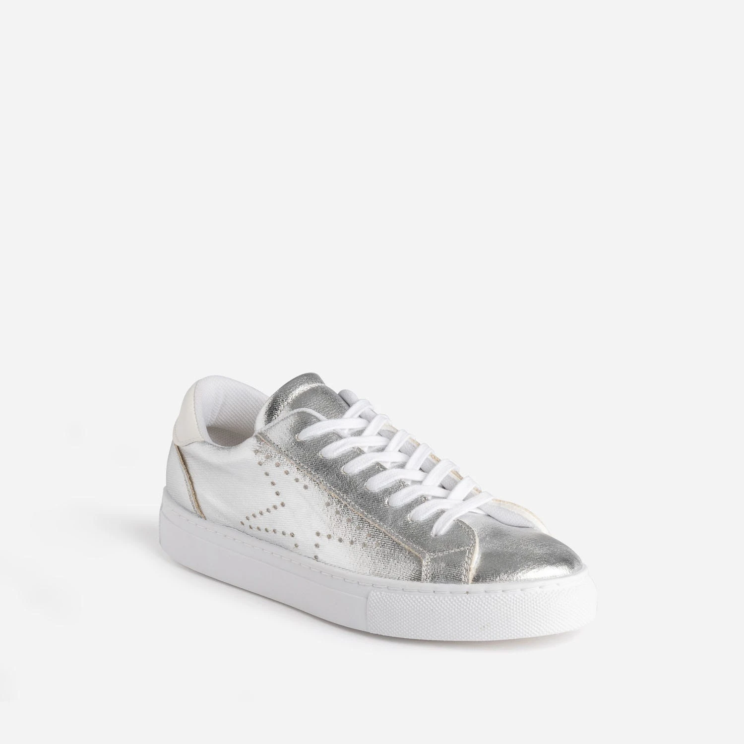 N’attendez pas pour briller ! Cette tennis femme s’autorise une version synthétique dans une version argent métallisée. Les côtés sont animés de perforations en forme d’étoile, et le contrefort, d’un empiècement blanc. Elle se ferme par un lacet plat blanc. Privilégiez-la avec des couleurs froides, vert, bleu, violet, avec les teintes pastel, amande, lilas, et avec les tons neutres, blanc, gris, noir.