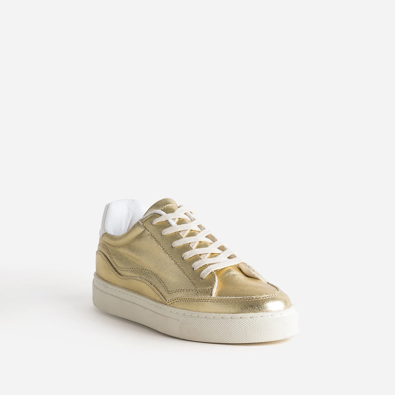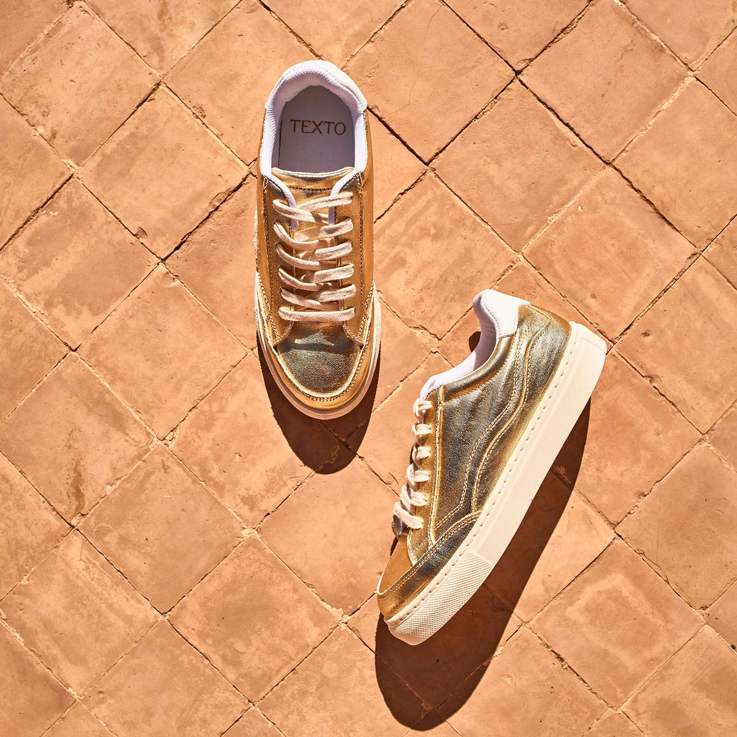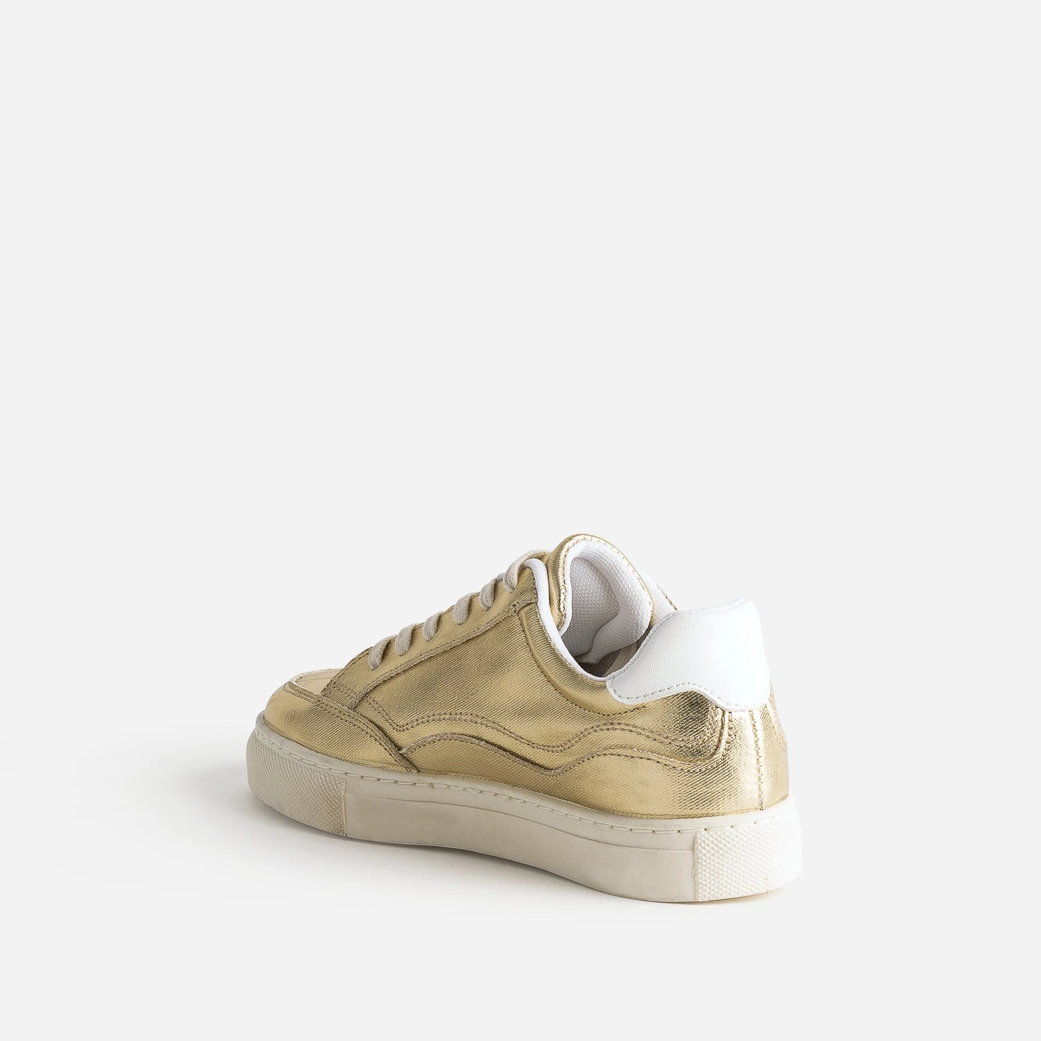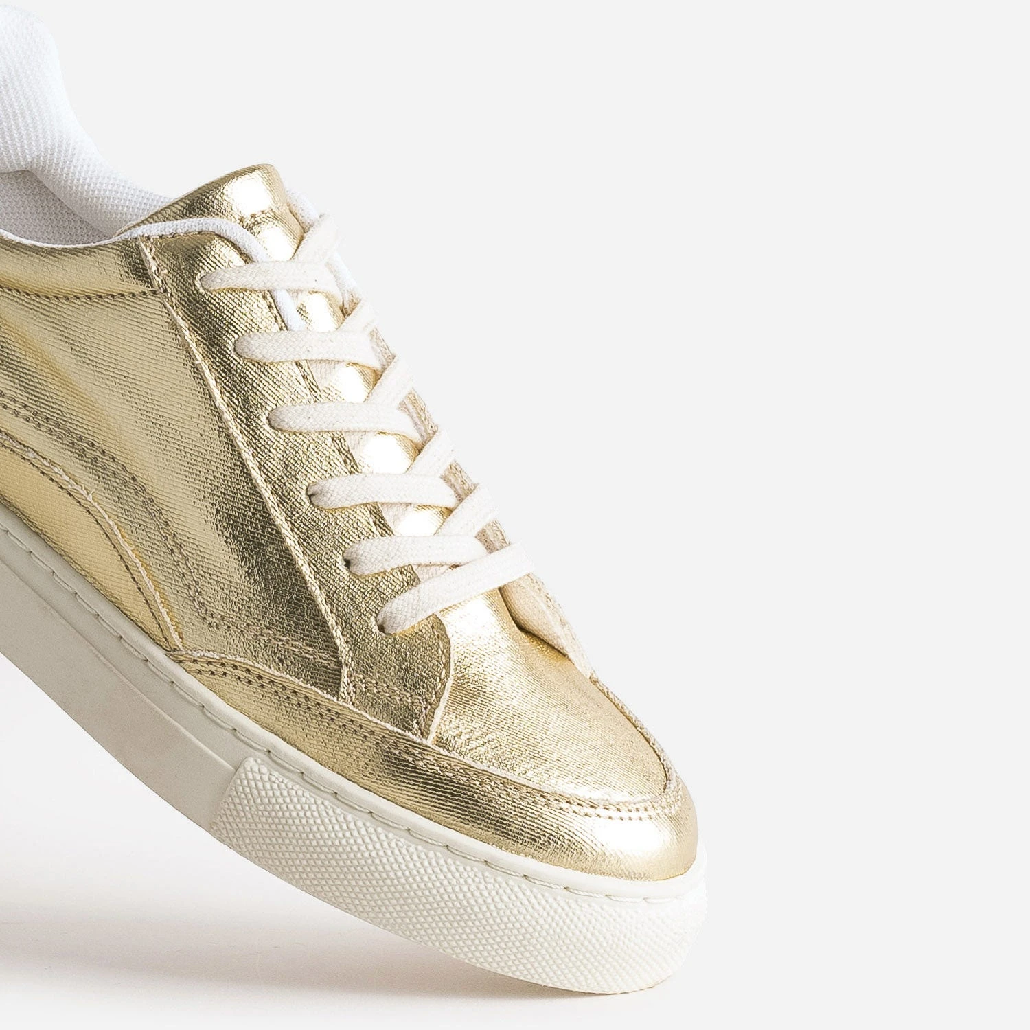 Impossible de rester insensible devant cette tennis femme. En matière synthétique, elle se décline en coloris doré, avec une finition enduite métallisée. Basse, elle se ferme par un lacet plat beige, en écho à la semelle. Le contrefort se détache par un coloris blanc. Un modèle idéal pour twister toutes les tenues, d’une touche chic, robe ou tailleur-pantalon.
