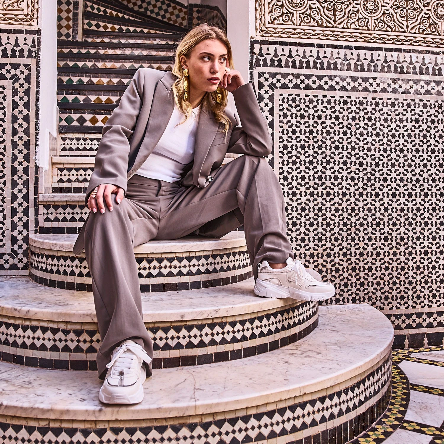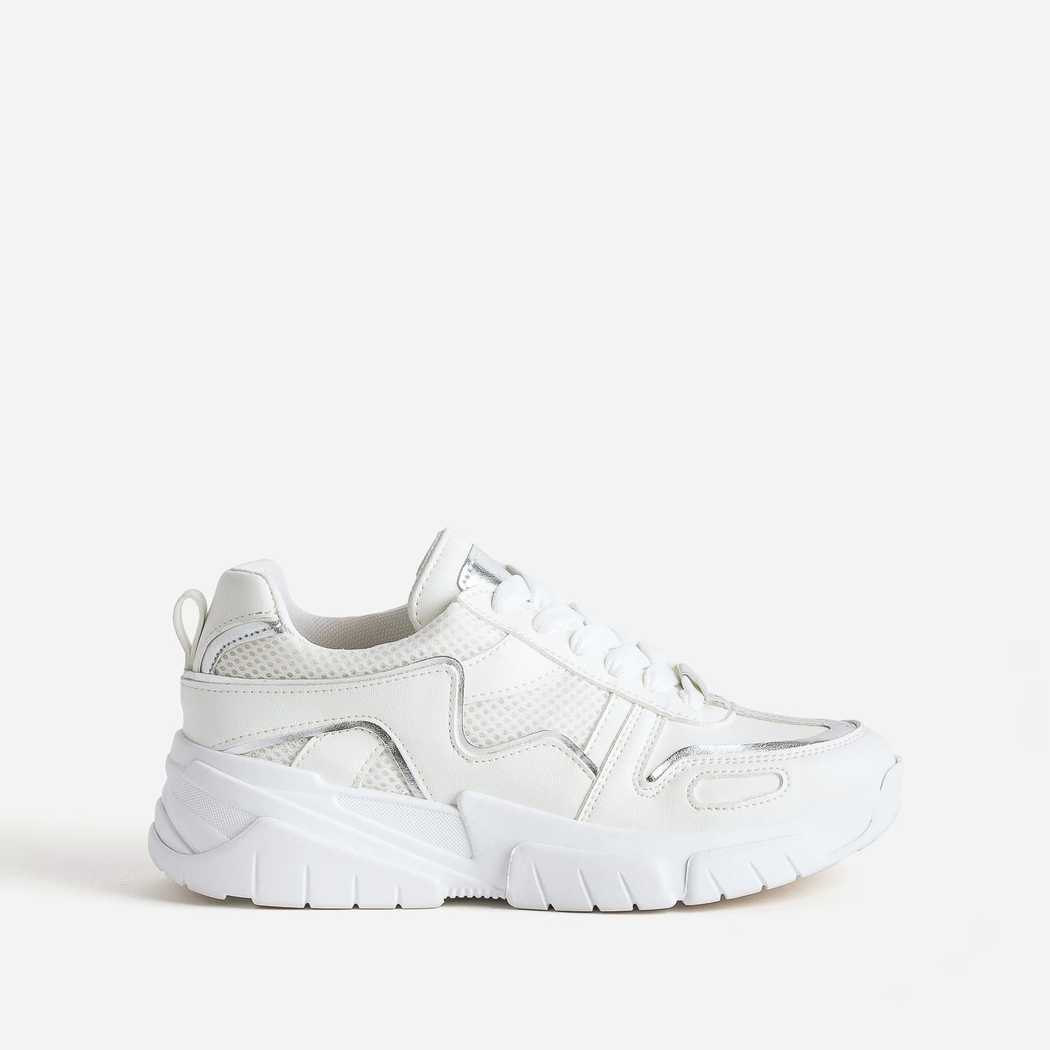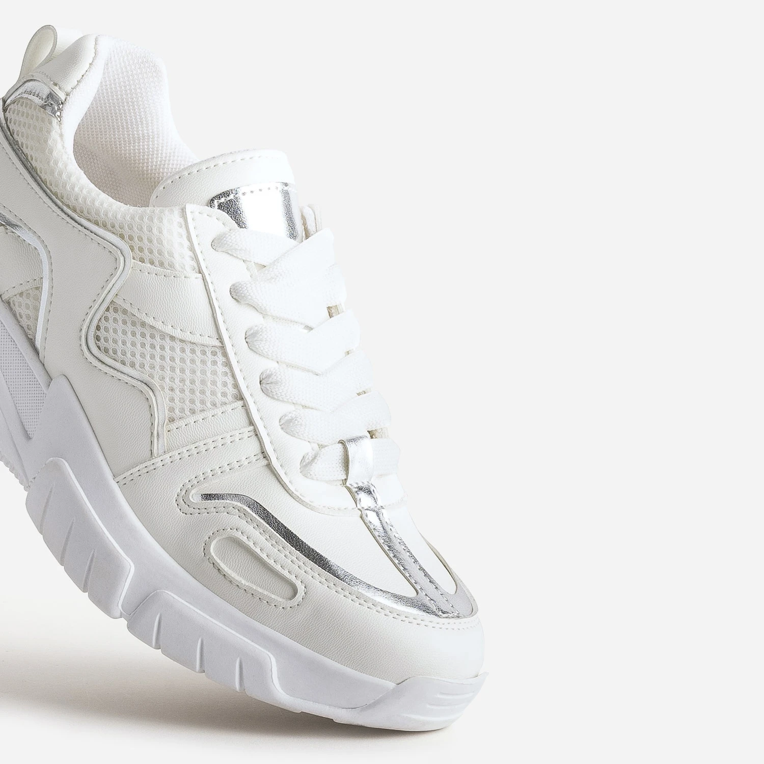 Mix de matières synthétiques lisse et mesh, association d’écru et de touches métallisées argentées, cette tennis femme défend un style sportswear, adapté pour le quotidien, hors des heures d’entraînement. Elle est montée sur une semelle épaisse, reliefée, légèrement compensée, qui fait prendre de la hauteur sans effort. Elle se ferme par un lacet plat ton sur ton. Un modèle à décaler avec un sweat pastel et un jean mom.