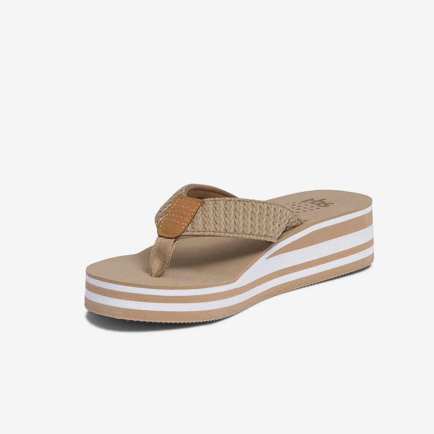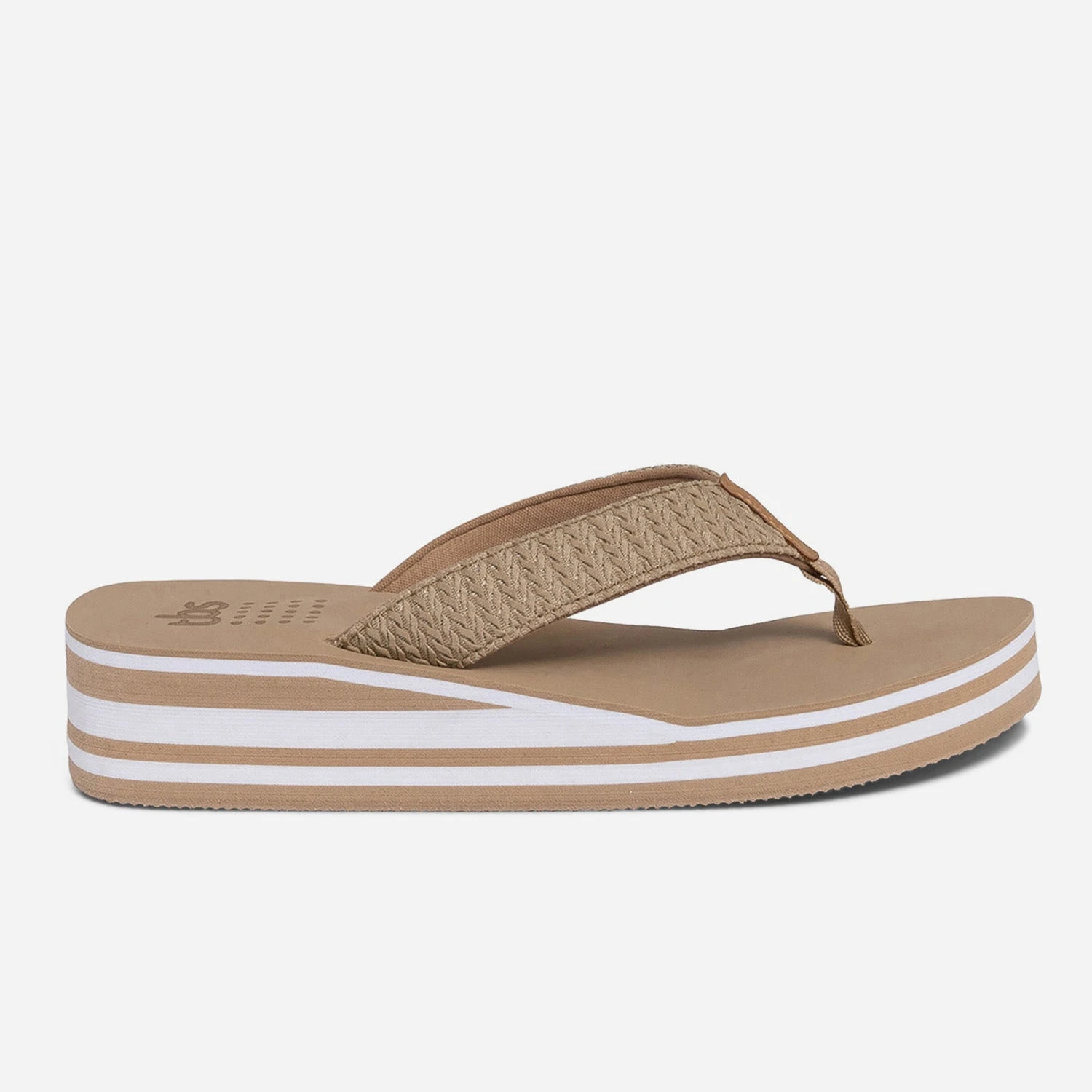Née du sport, la marque TBS trouve son ancrage dans l’univers nautique. Légitime à terre comme en mer, ses produits sont reconnus pour leur confort. Spécialement conçue pour déambuler dans les zones aquatiques (thalasso, piscine, bord de mer), la tong se réinvente par un talon compensé de 4 cm, rythmé de rayures blanches horizontales, et soulagé par un patin avant de 2 cm. Un modèle à dominante beige, à porter, évidemment avec une marinière, sur un maillot de bain et un short en jean blanc. Marque : TBS, l’esprit d’origine Fabriquée en Italie