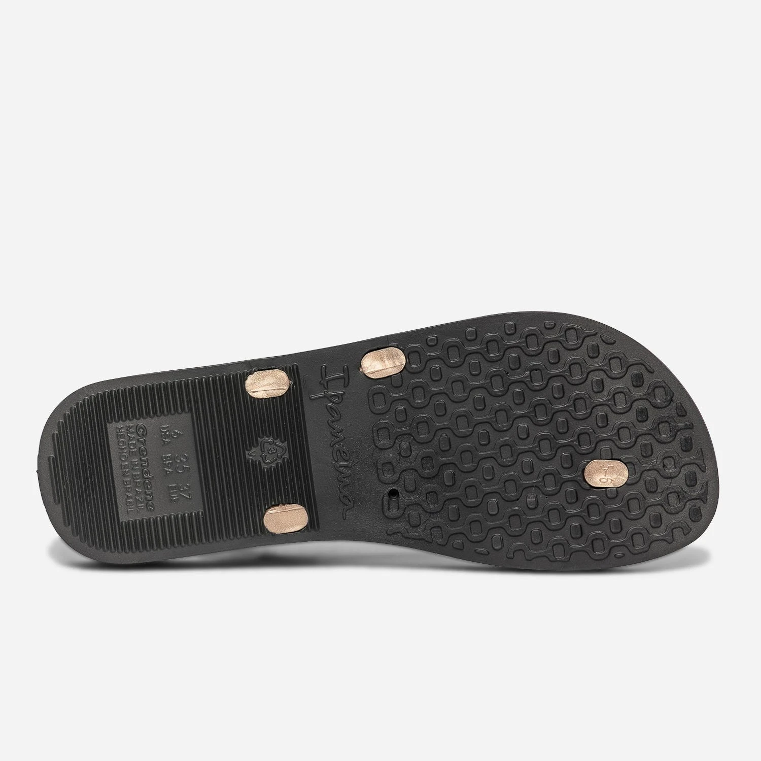La tong est l’indispensable à glisser dans sa valise d’été. Noire, elle se démarque par des brides asymétriques gris foncé, avec un détail d’embossage tressé. Elle est montée sur une semelle noire, légèrement compensée, pour allonger la jambe, et animée d’un motif graphique, en écho à celui du remblai de la plage d’Ipanema. Un modèle facile à associer avec une robe-tube ou un pantalon cropped.