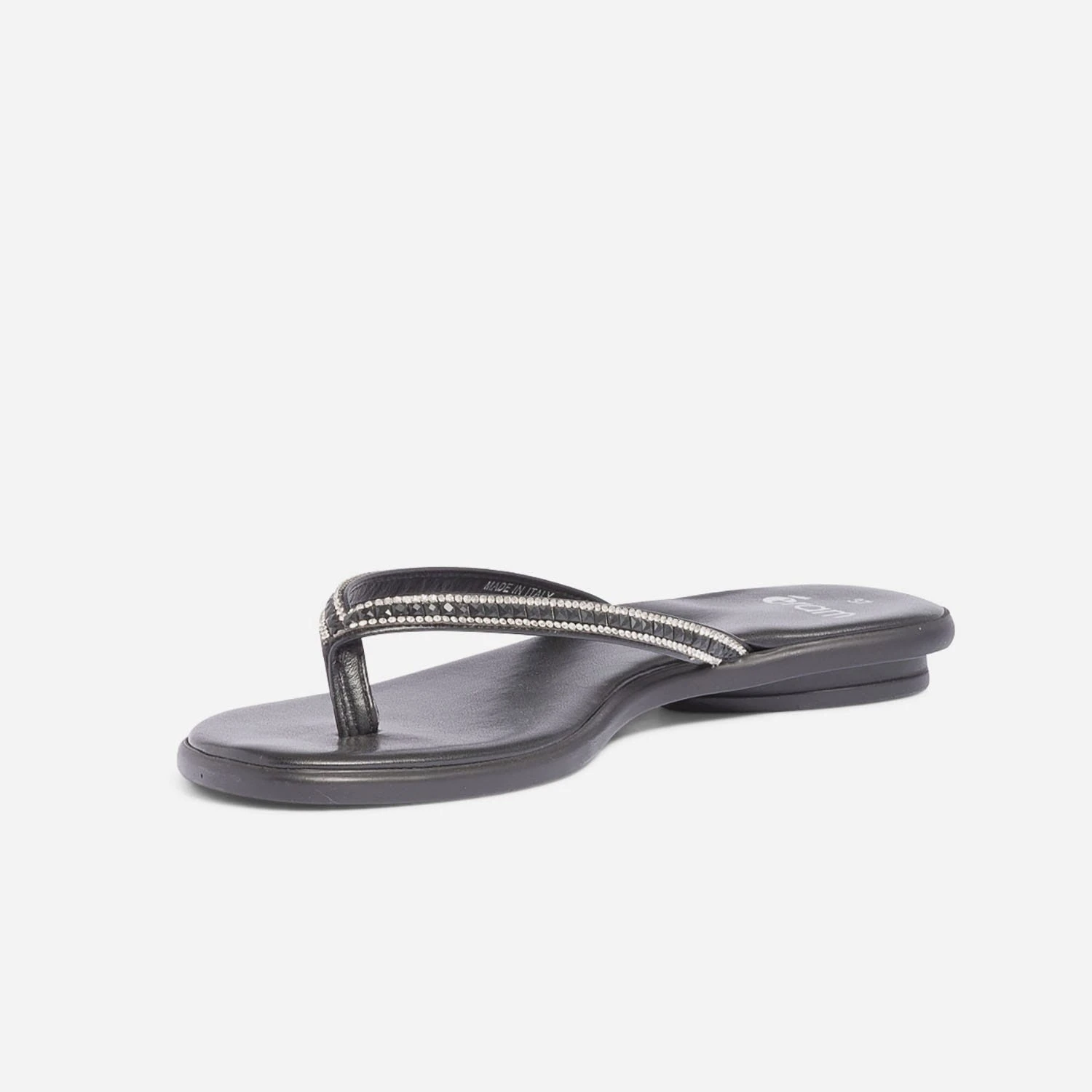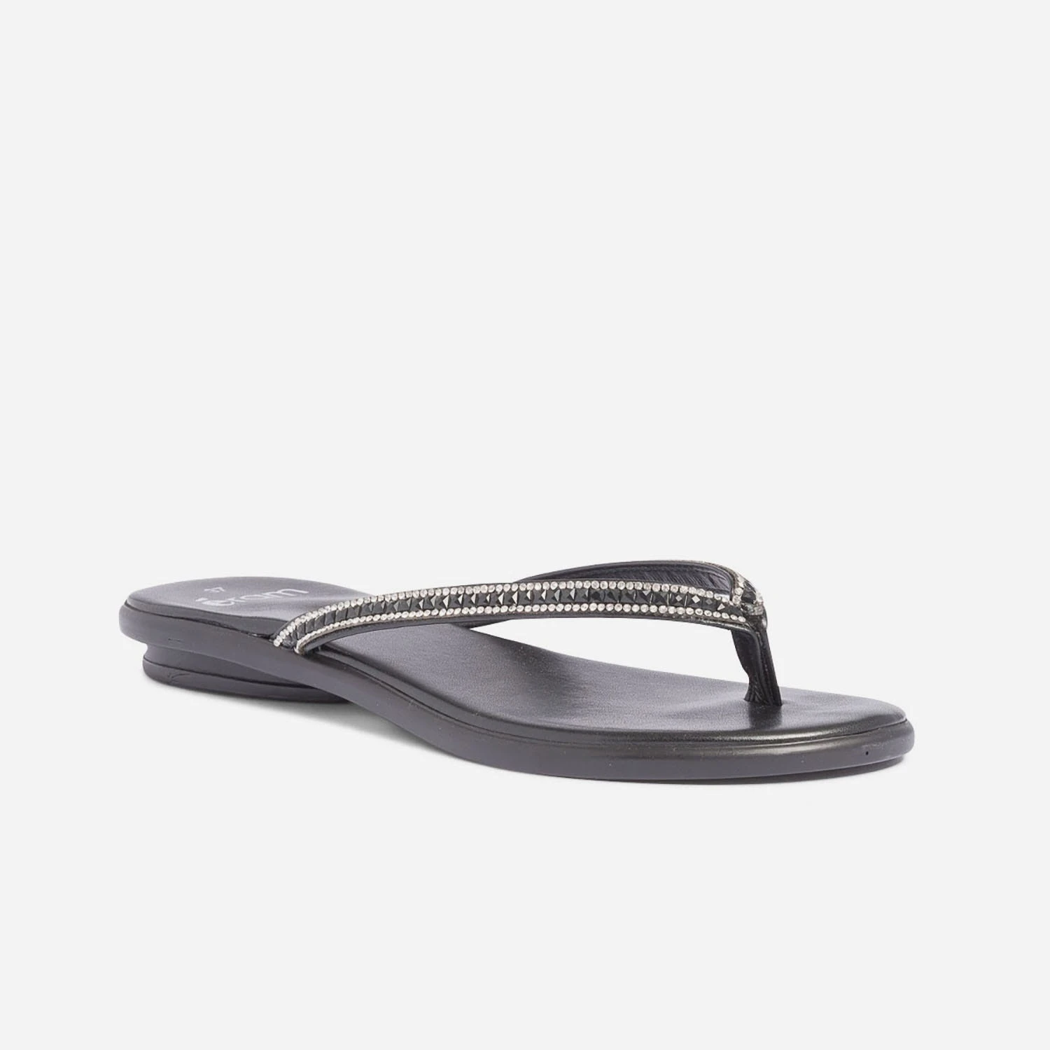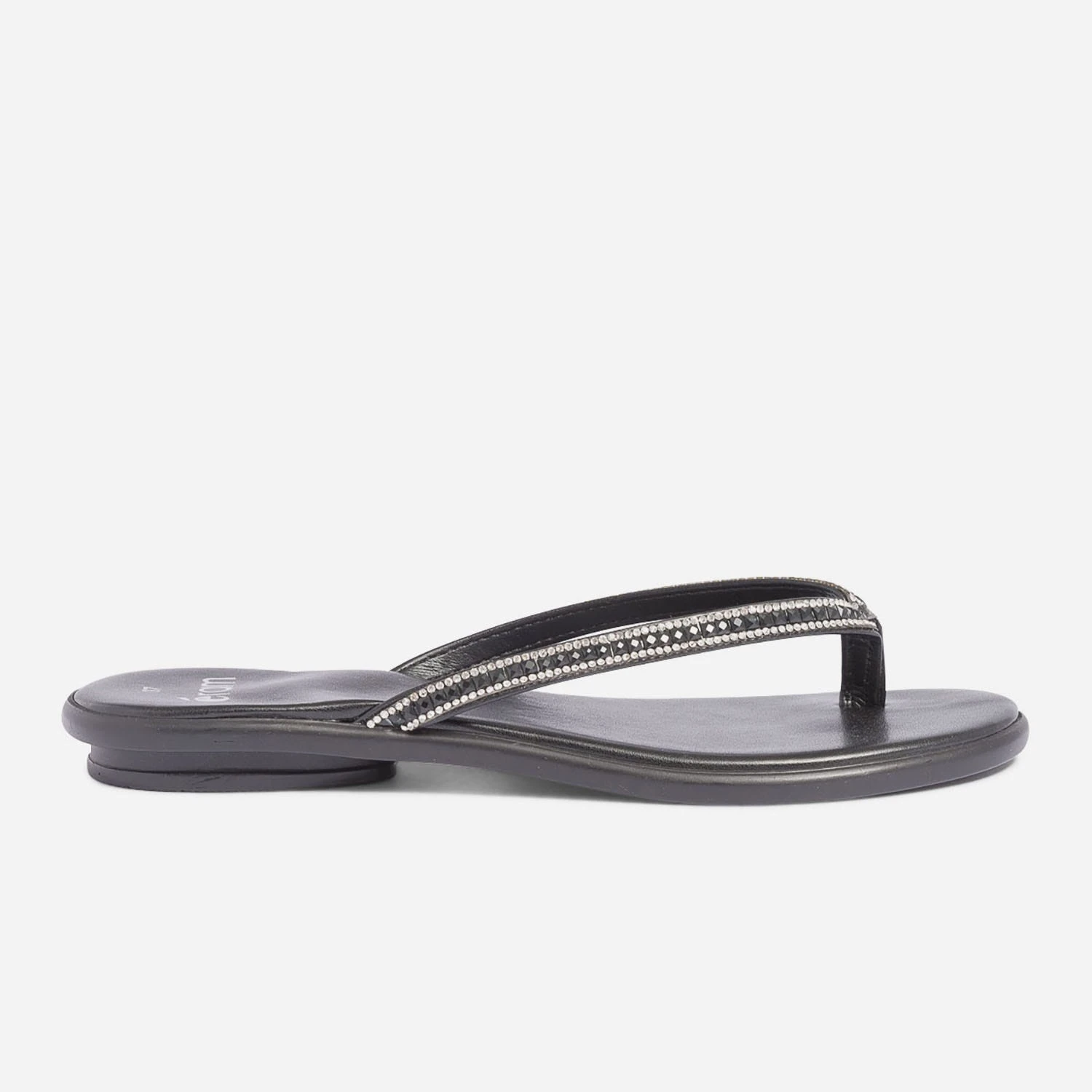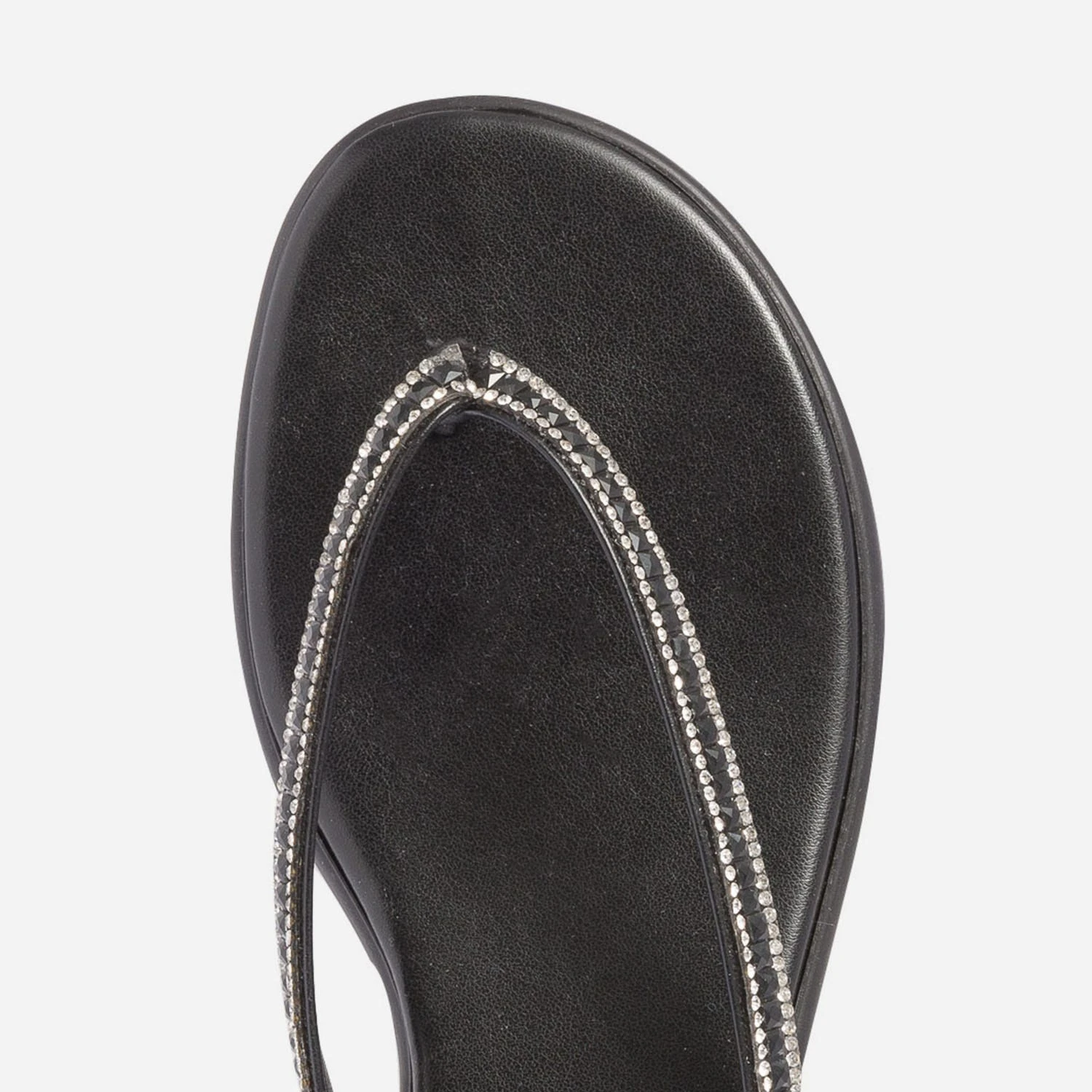 L’indispensable tong occupe toujours une place de choix dans notre dressing estival. Sa ligne minimaliste met en avant deux fines brides en textile, customisées de strass noirs et blancs, sur semelle synthétique noire. Un modèle de chaussure à porter tout l’été comme un bijou de pied.